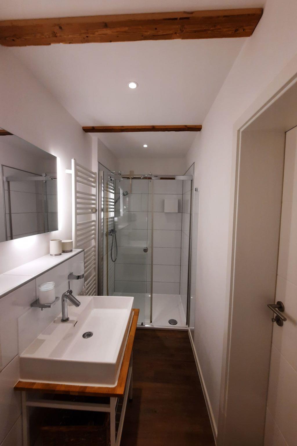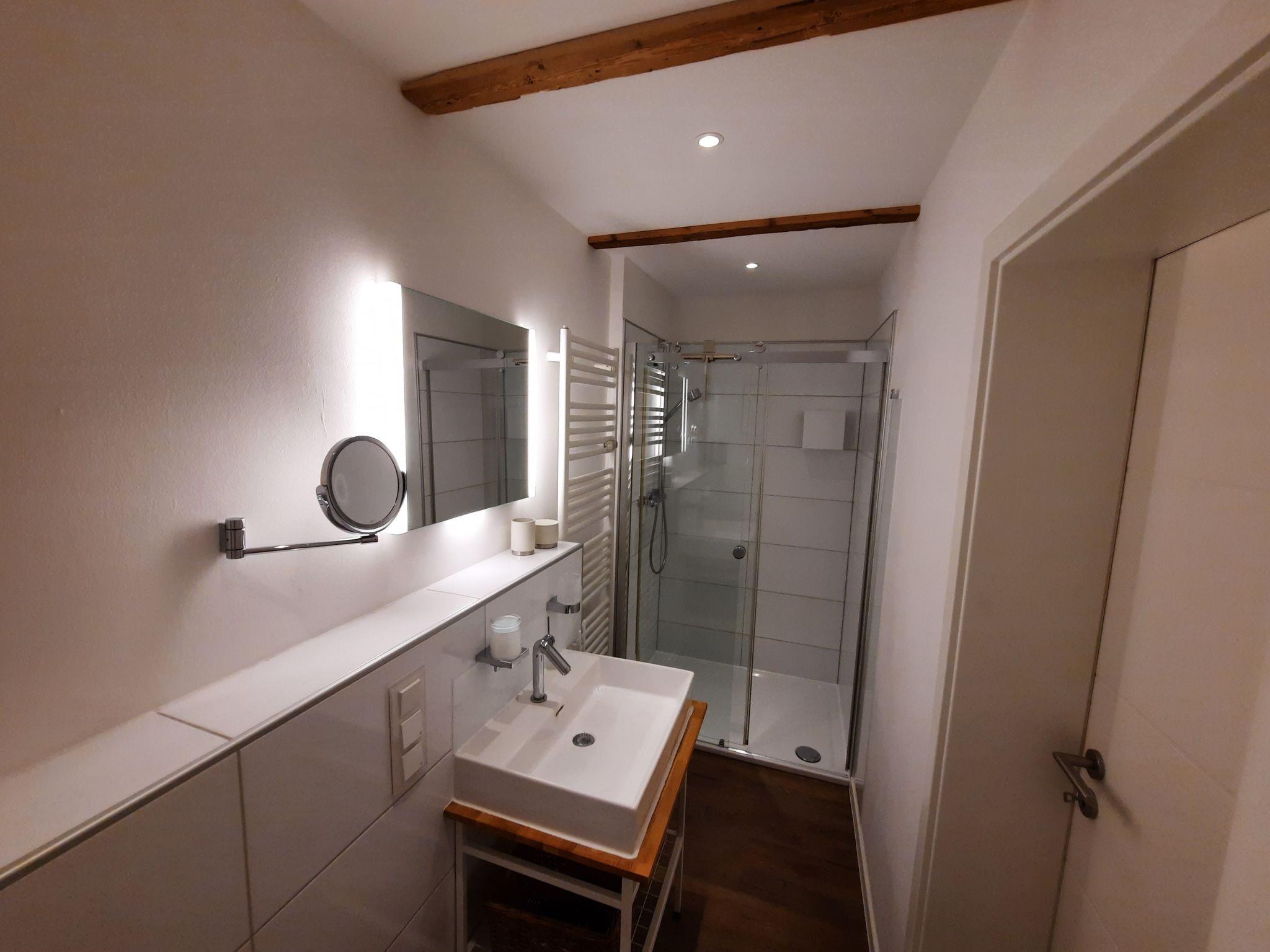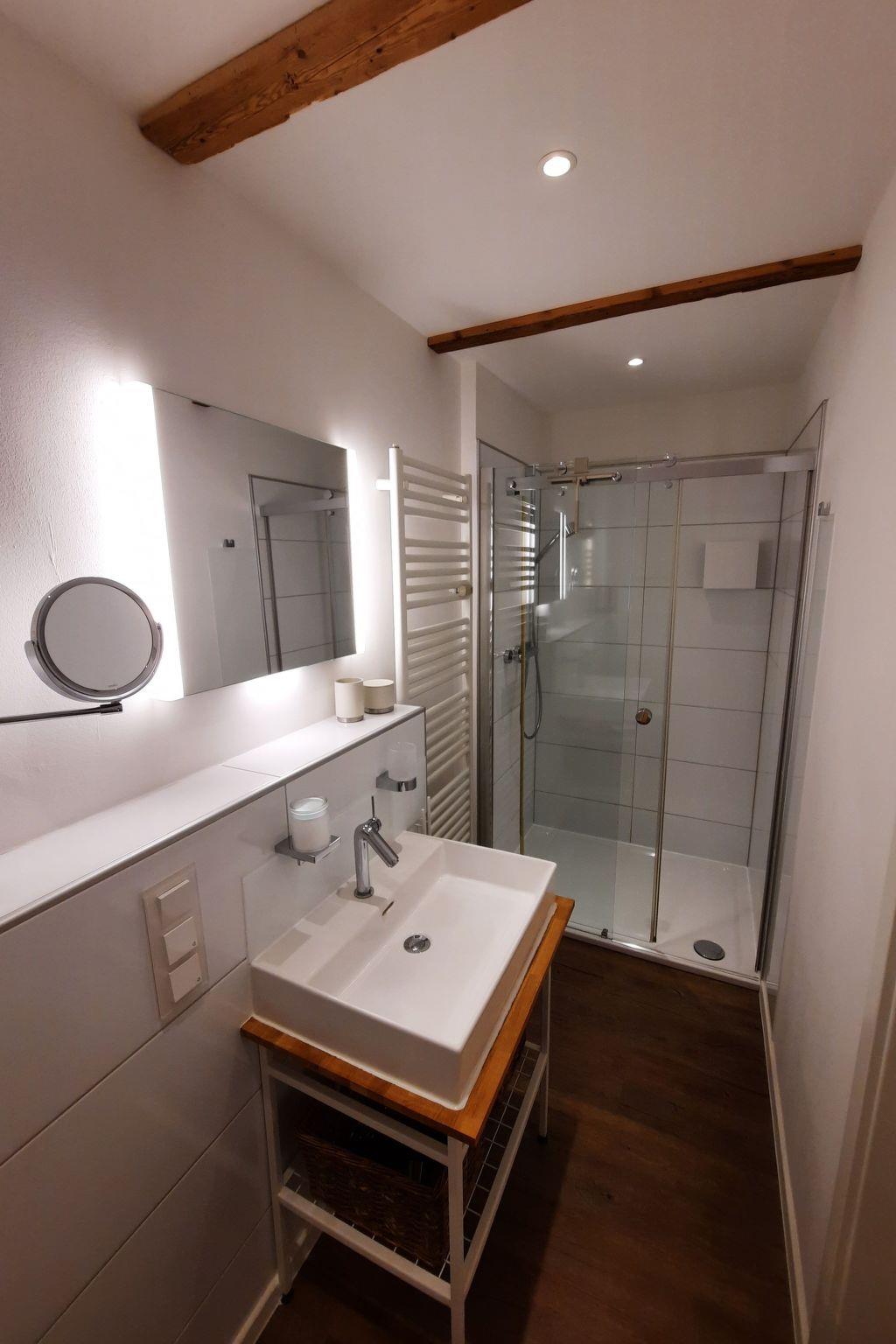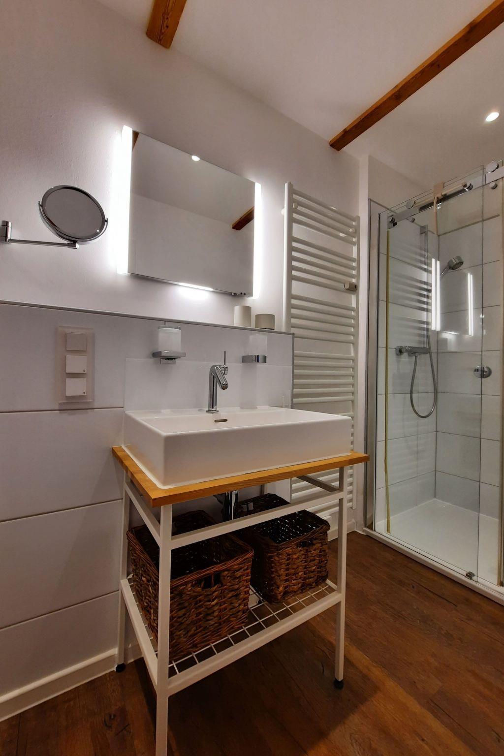 Das Bad mit seiner ebenerdigen Dusche wurde mit Gegenständen von Keuco ausgestattet. Der hochwertige Wandspiegel lässt sich beleuchten (und dimmen).