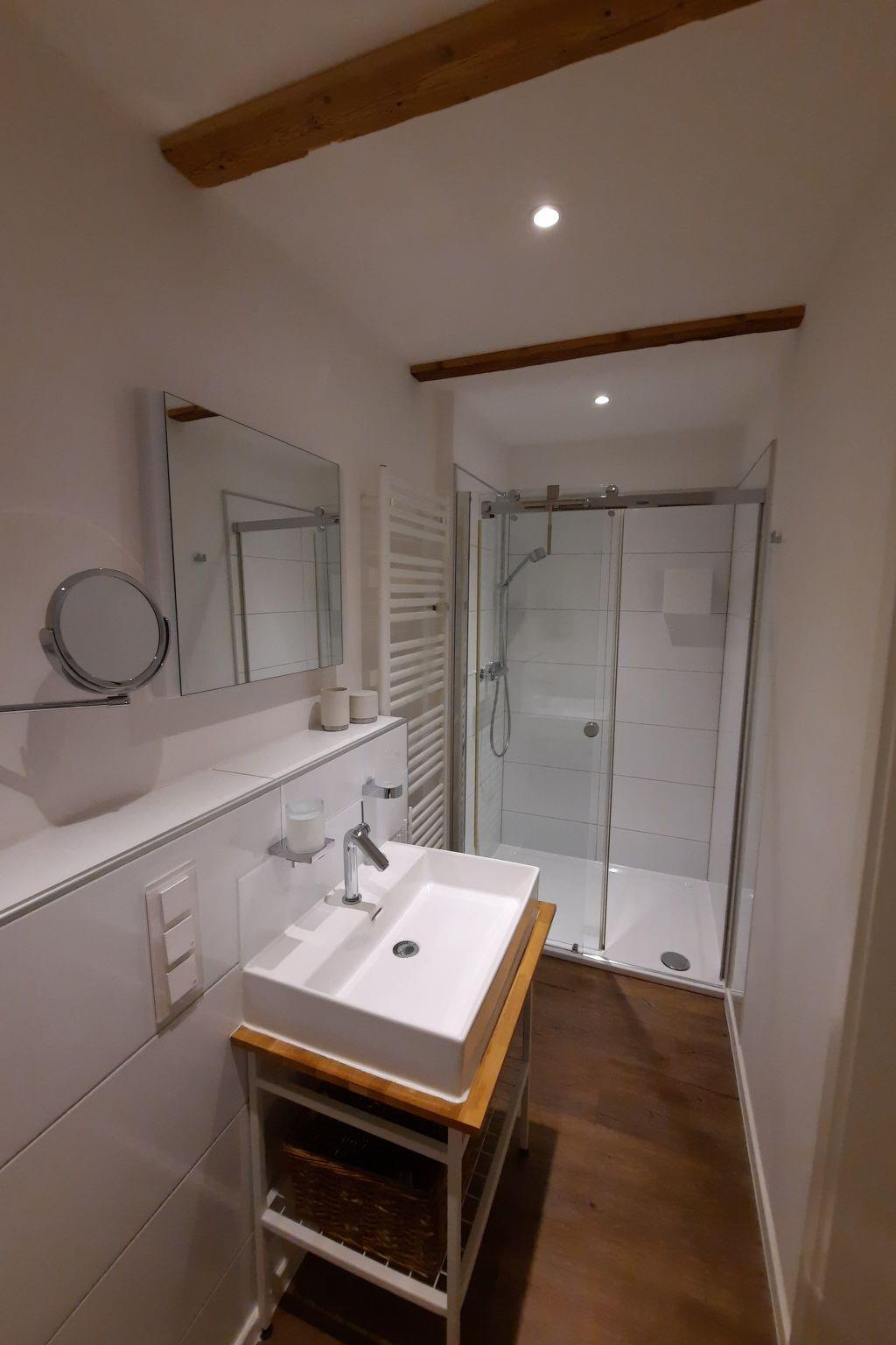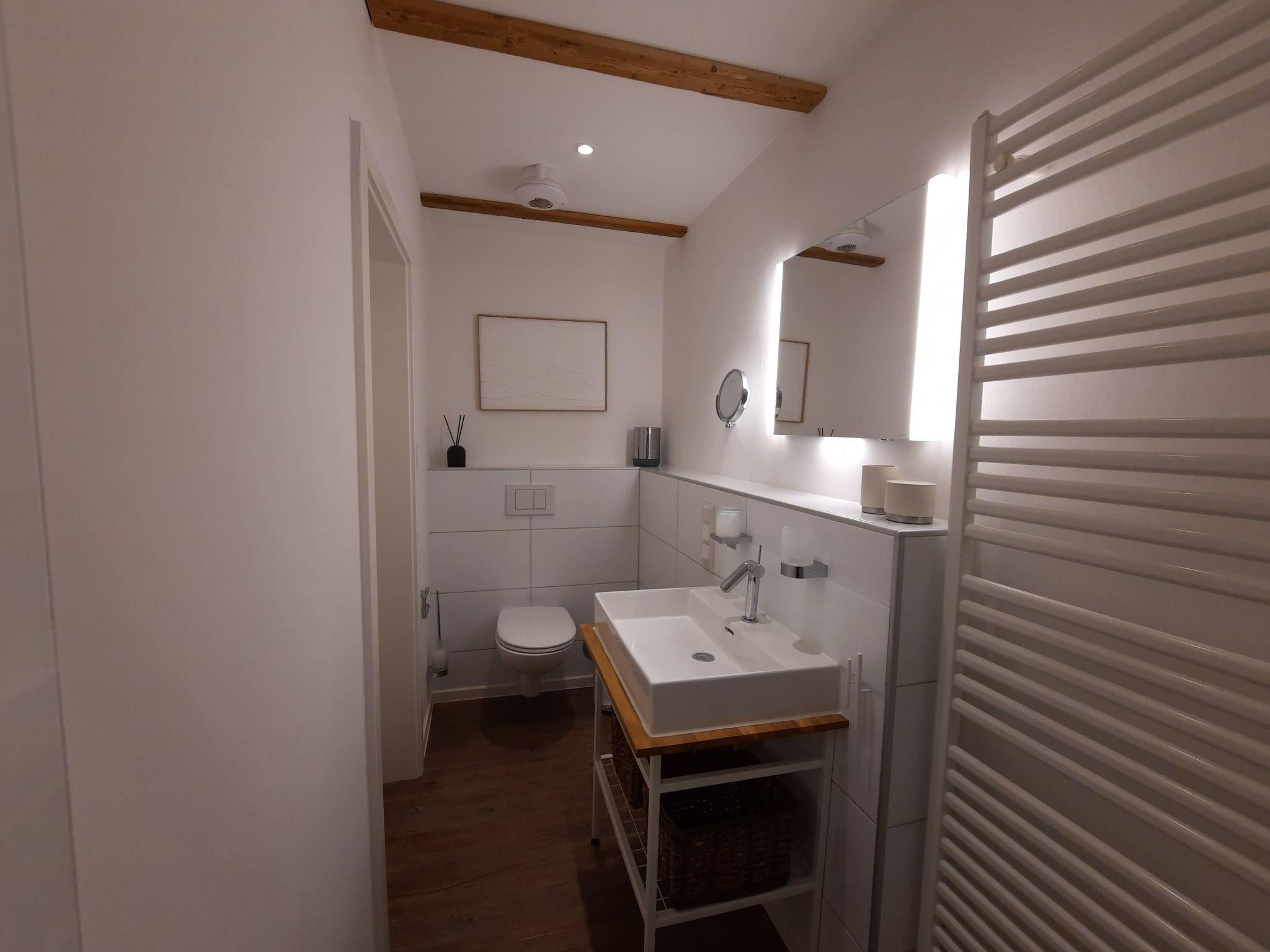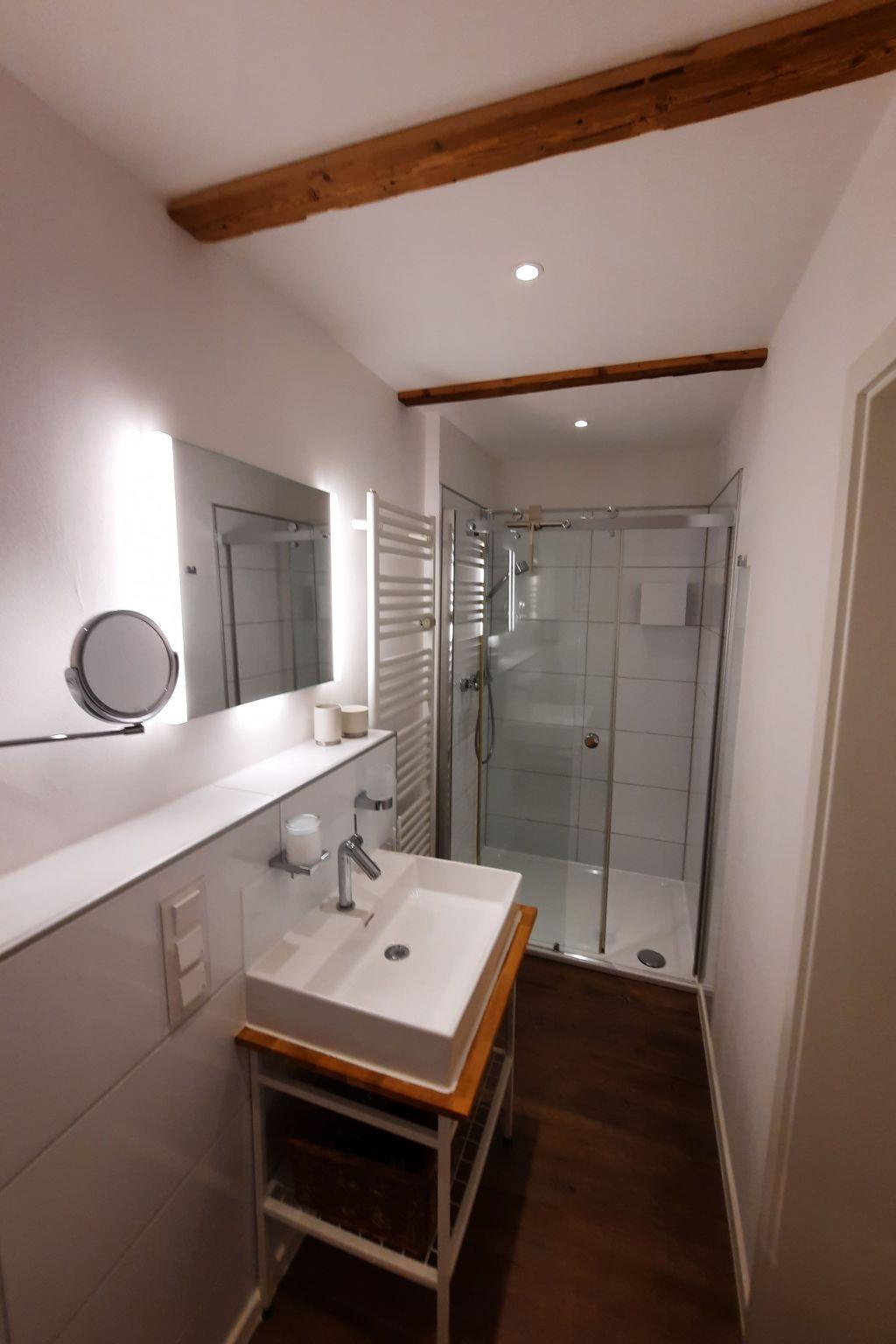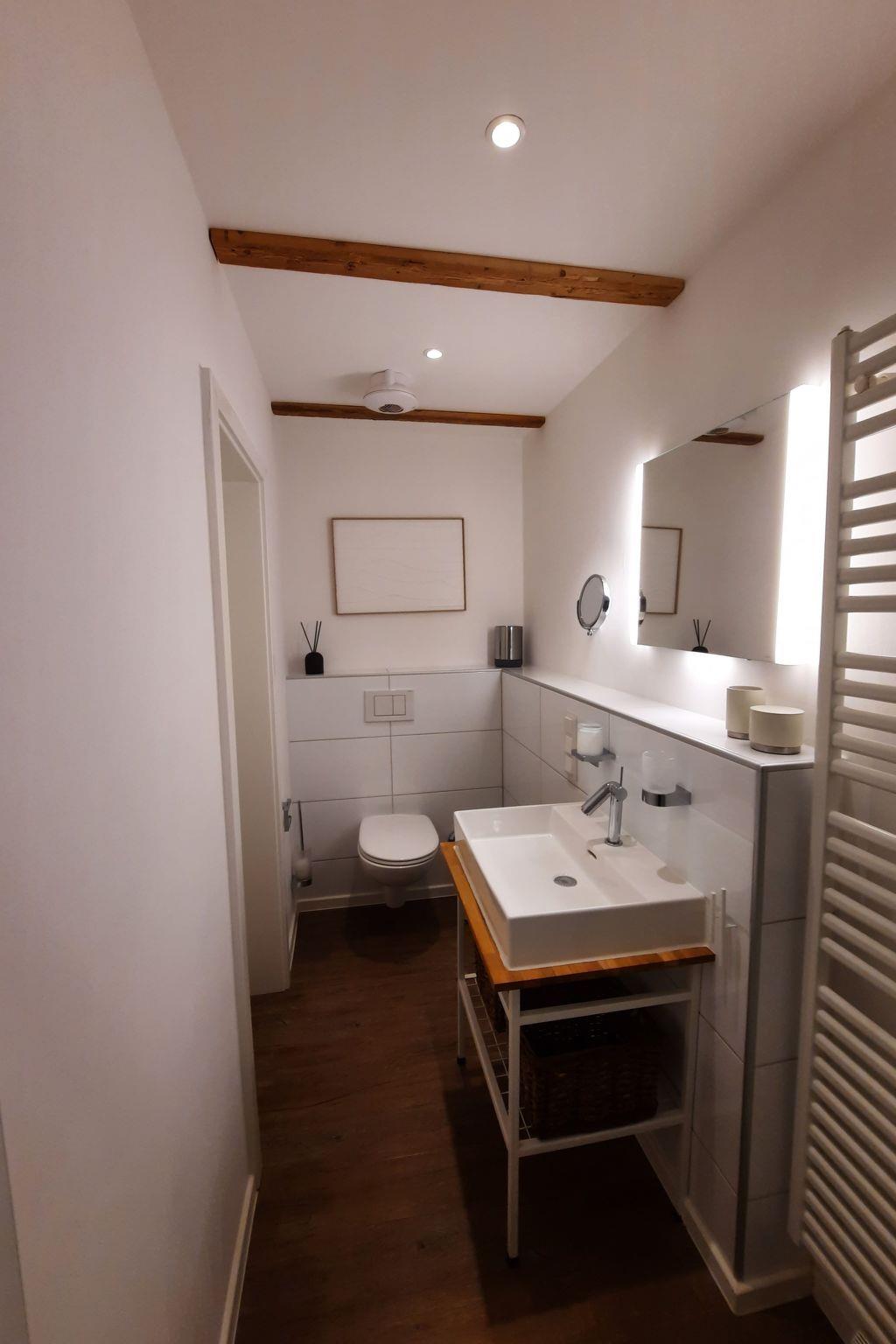 Das Bad mit seiner ebenerdigen Dusche wurde mit Gegenständen von Keuco ausgestattet. Der hochwertige Wandspiegel lässt sich beleuchten (und dimmen).