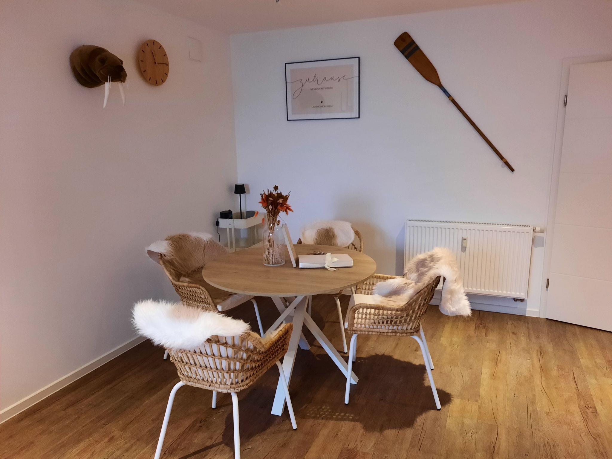 Der Essbereich besteht aus einem im Durchmesser 105 cm runden Tisch mit vier Stühlen.