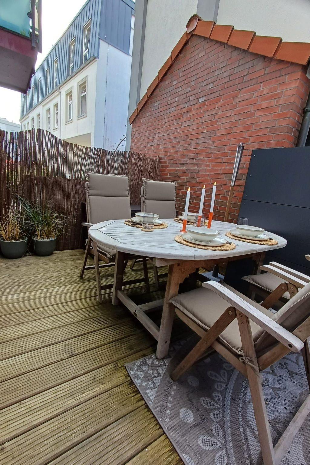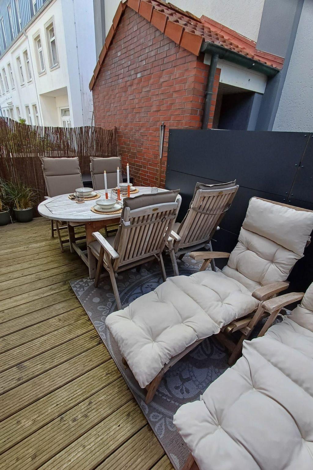 Die uneinsichtige und allein zur Wohnung gehörende Terrasse verfügt über einen Tisch mit vier Stühlen sowie zwei Deckchairs jeweils aus Teakholz und mit Auflage. Die Auflagen lassen sich bequem in der Biohort-Box unterbringen. Hier finden Sie auch einen Wäscheständer.