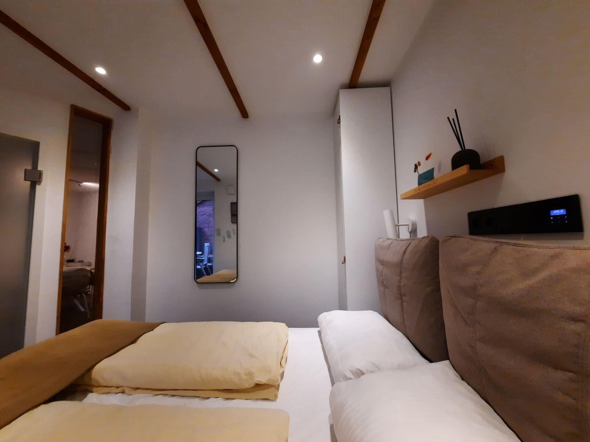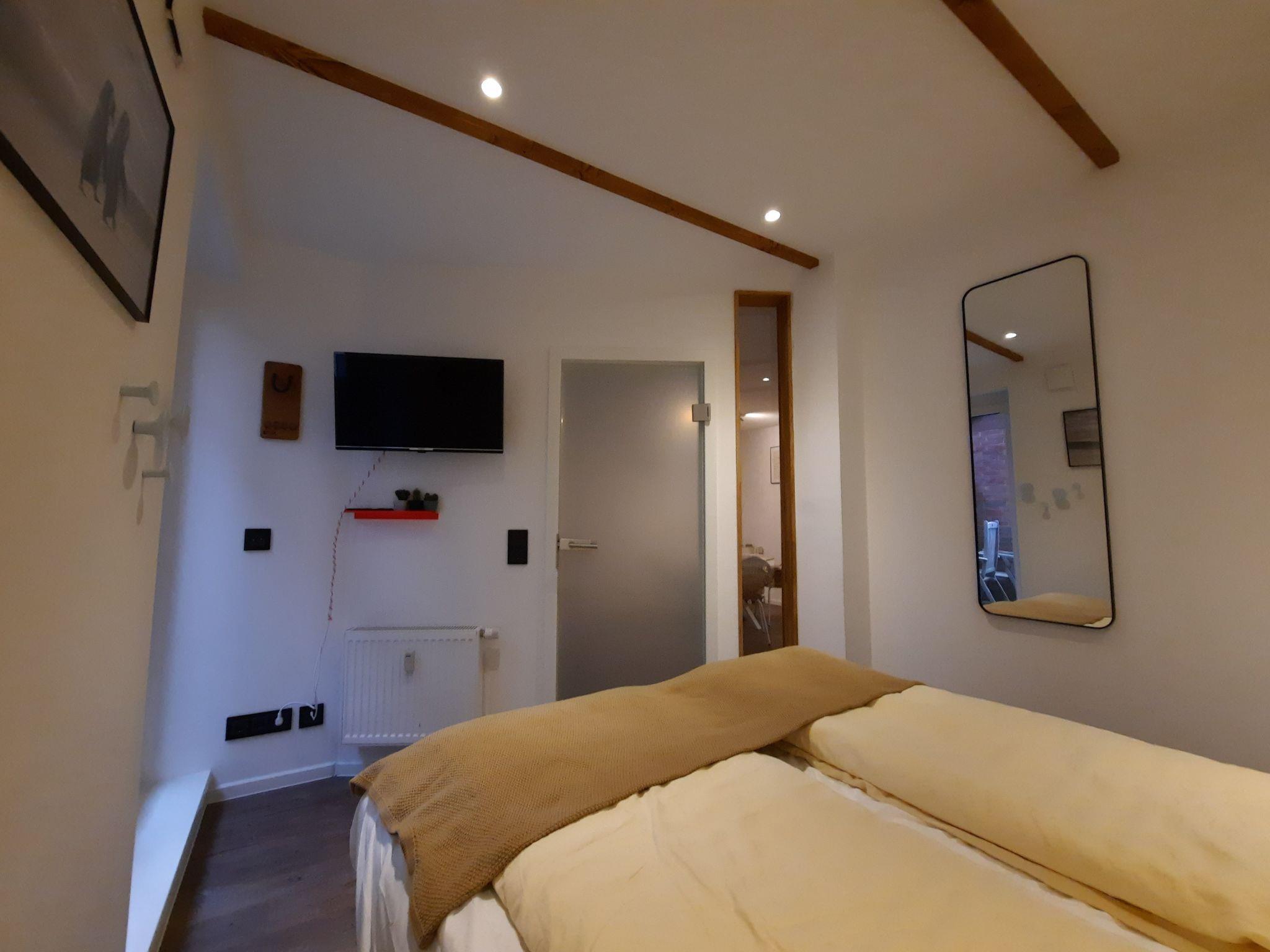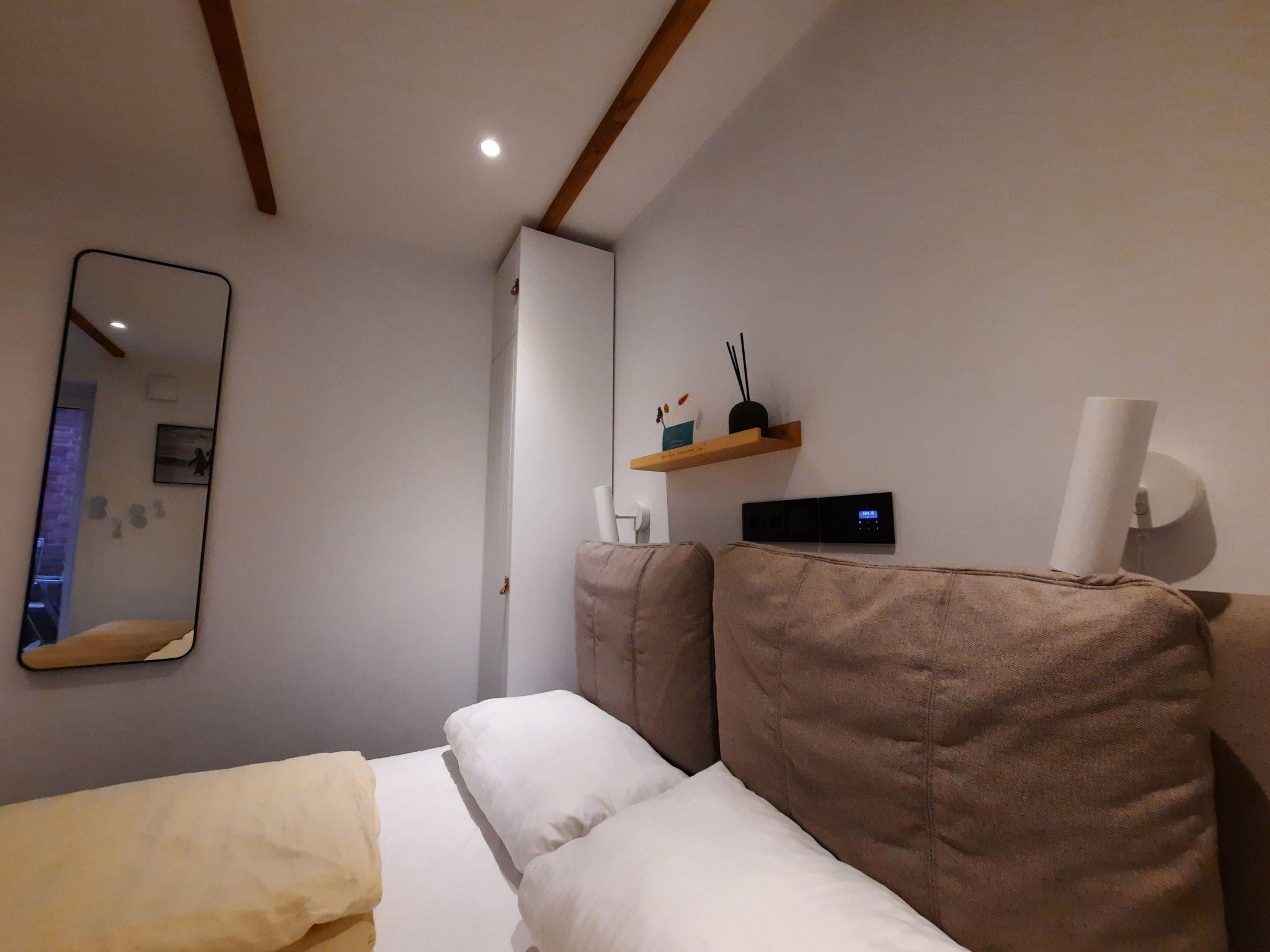 Das Schlafzimmer verfügt über ein Boxspringbrett in der Größe 1,60 m x 2,00 m und zwei Kleiderschränken. Vom Bett aus kann man bequem den Flachbild-TV inkl. Sonos-Soundbar an der gegenüberliegenden Wand nutzen. Das bodentiefe Fenster lässt sich komplett öffnen und führt zur Terrasse.