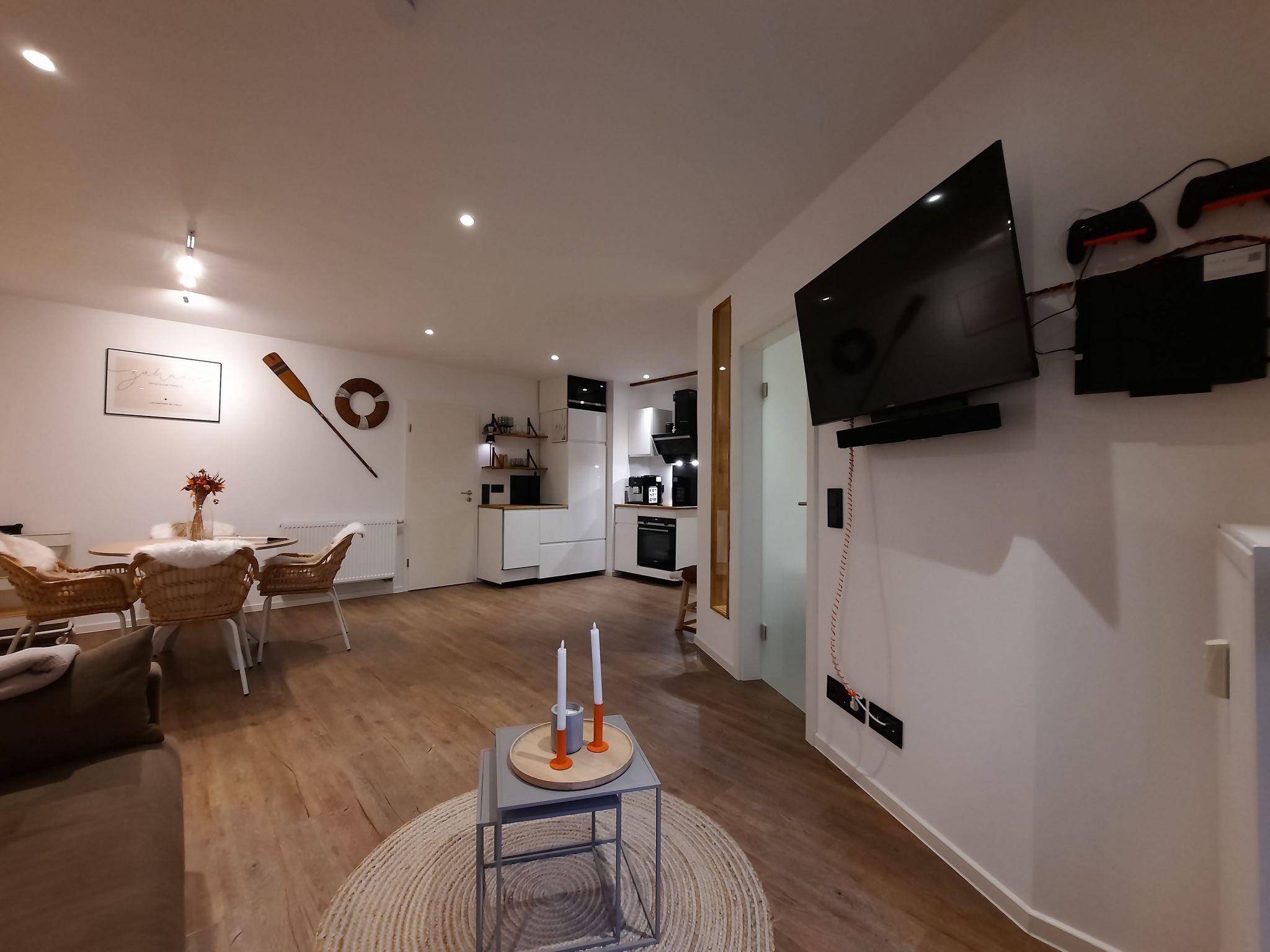 Die Schlafcouch lässt sich nach „vorne“ ausziehen, wo durch eine Liegefläche von 1,40 m x 2,00 m entsteht und somit von zwei Personen als Schlafmöglichkeit genutzt werden kann. Der 43 Zoll QLED große Smart-TV inklusive Sonos-Surroundanlage lädt zum Verweilen ein. Ebenso steht eine Playstation 4 mit diversen Spielen zur Verfügung.
