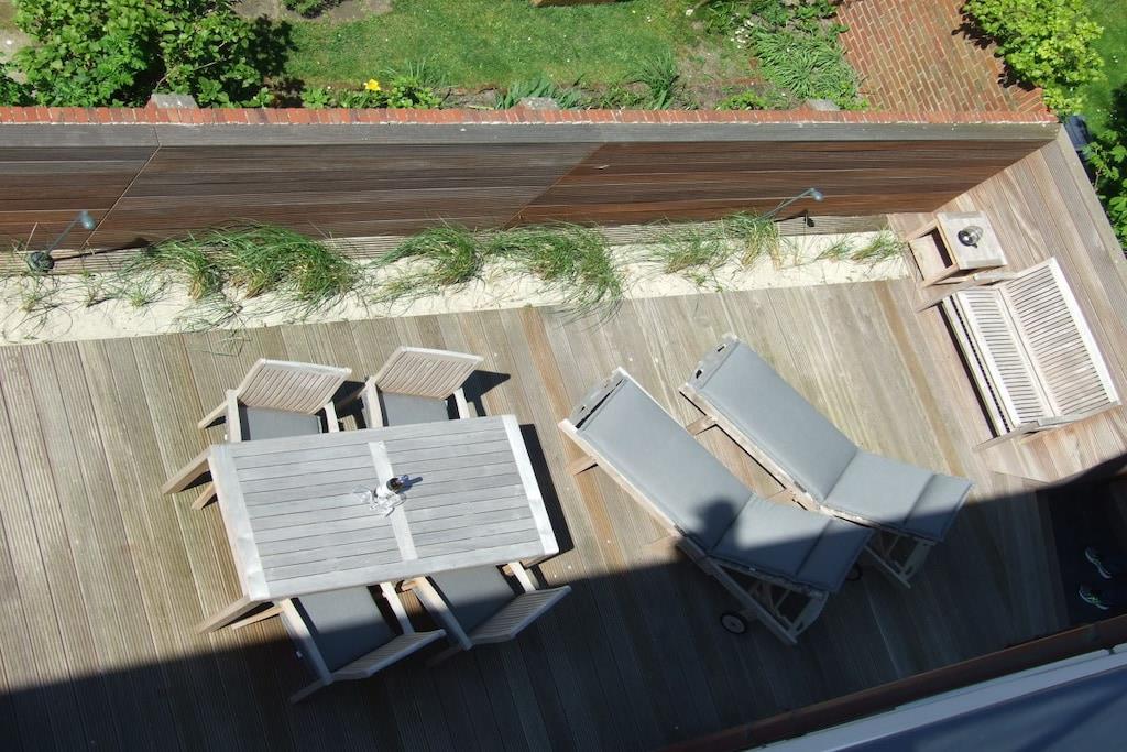 Komfortables Ferienhaus Meerloft in Norderney mit Terrasse, moderner Küche und Gartenmöbeln.