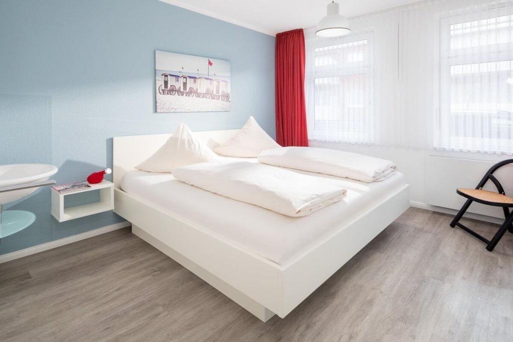 Das liebevoll eingerichtete Friesenhaus verfügt insgesamt über 13 Betten in 6 Schlafzimmern. Es eignet sich hervorragend für einen Urlaub mit zwei befreundeten Familien oder Mehrgenerationenurlaube. Im Erdgeschoss gibt es lediglich 2 Stufen, ansonsten ist das Erdgeschoss barrierefrei, so dass perfekt Oma und Opa mitreisen können. Für Familien mit kleinen Kindern stehen zwei fantasievolle Kinderzimmer, zwei TripTrap Stühle, Spielzeug und Kindergeschirr zur Verfügung. Das Haus liegt lediglich 4 Gehminuten vom Nordstrand und 8 Gehminuten von der Innenstadt entfernt. Das Haus verfügt über einen eigenen kostenlosen Parkplatz am Haus. Im Wintergarten steht eine lange Tafel, so dass einem gemütlichen Familienessen nichts im Wege steht.
