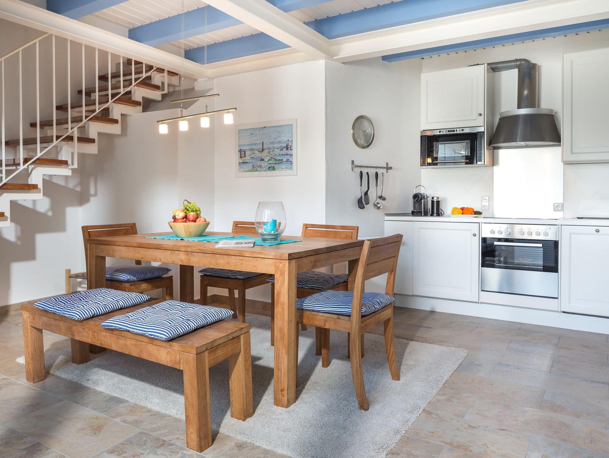 Die Wohnung erreichen Sie über den ruhig gelegenen Innenhof. Im unteren Bereich befindet sich die gemütliche Wohnküche mit geräumigem Esstisch und Zugang zum Hof mit Esstisch und Strandkorb. Über die Treppe von der Wohnküche aus gelangen Sie in den oben gelegenen Wohnbereich mit Sofa, Sesseln und Fernseher ? ein Platz zum Entspannen! Von dort gehen beide Schlafzimmer (1x Doppelbett, 1x 2 Einzelbetten) und das Badezimmer ab.
