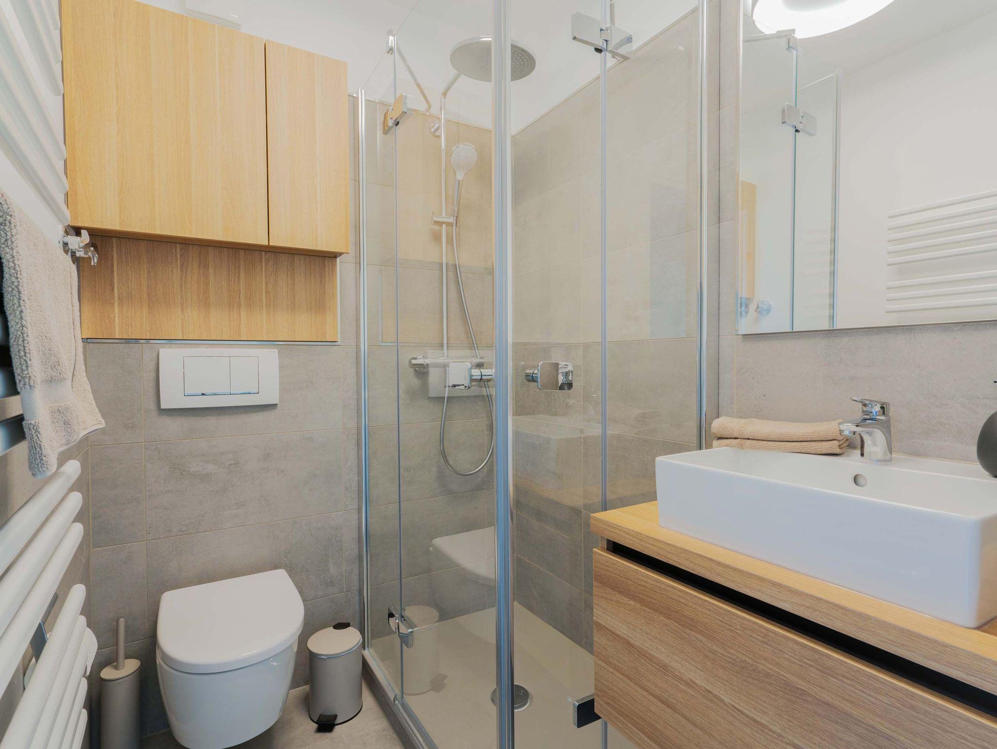 Der Wohn- und Essbereich bietet eine gemütliche Sofaecke (Ausziehcouch 160x200) mit Fernseher. Am geräumigen Essplatz lassen sich entspannte, gemeinsame Mahlzeiten geniessen. Die moderne, offene Küche ist umfangreich mit Spülmaschine, Backofen, Mikrowelle und Annehmlichkeiten wie u.a. einer Nespresso-Maschine ausgestattet. Vom Wohnraum gelangen Sie auf den Balkon mit Westausrichtung. Auch im separaten Schlafzimmer gibt es neben dem Doppelbett (160x200) einen weiteren Fernseher. Das moderne Duschbad bietet Ihnen Entspannung unter der Regendusche.