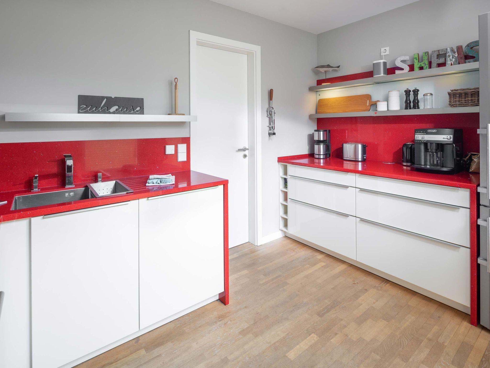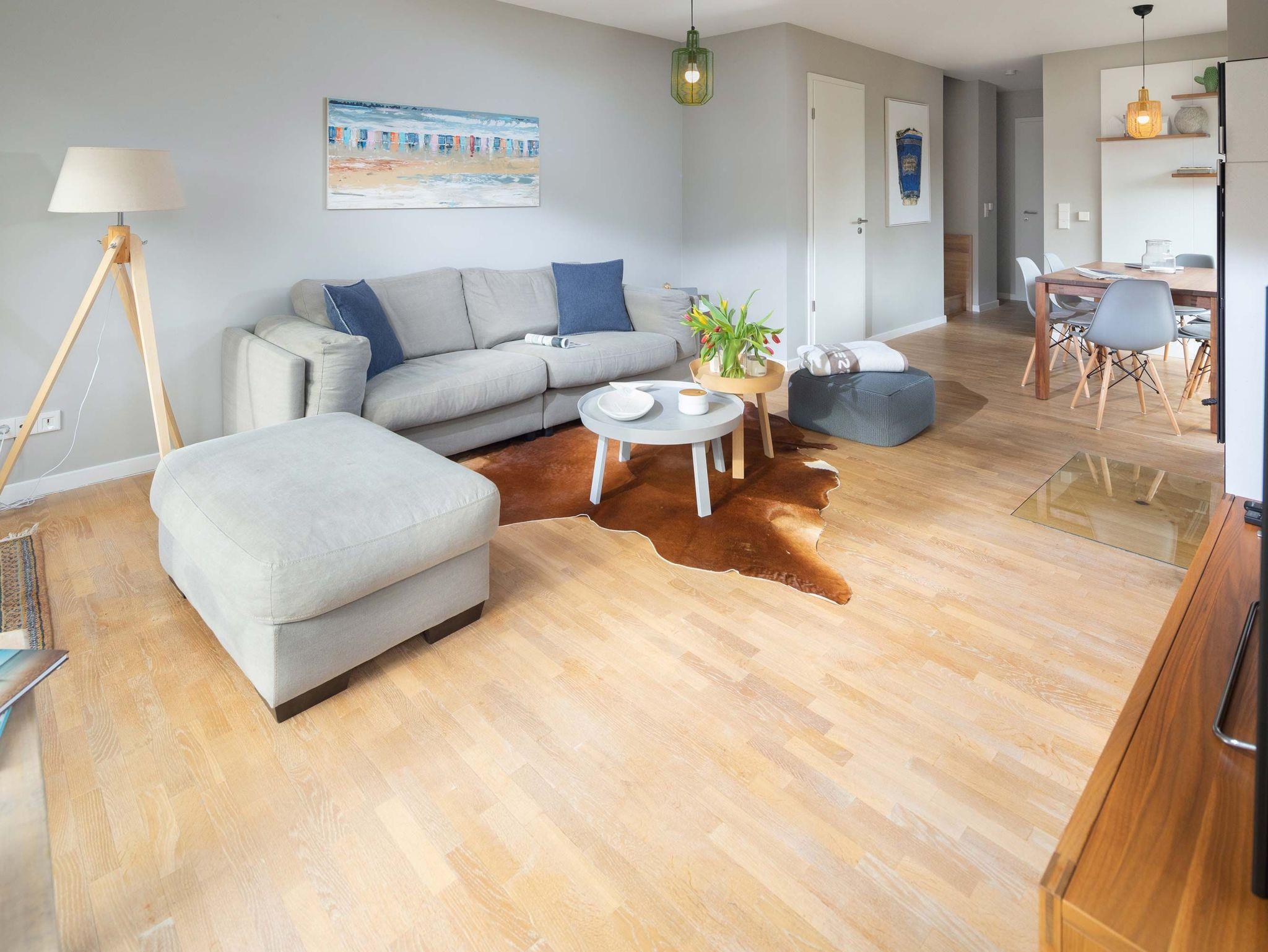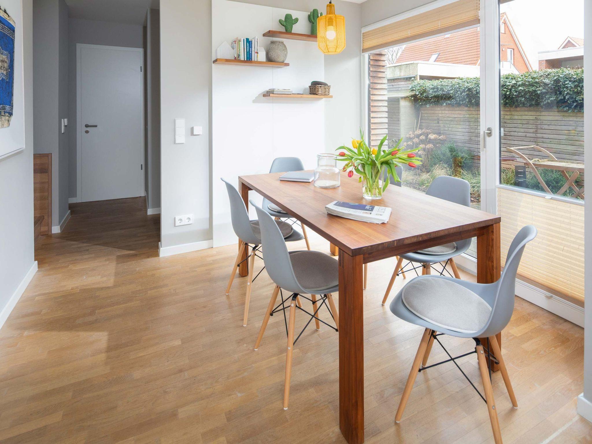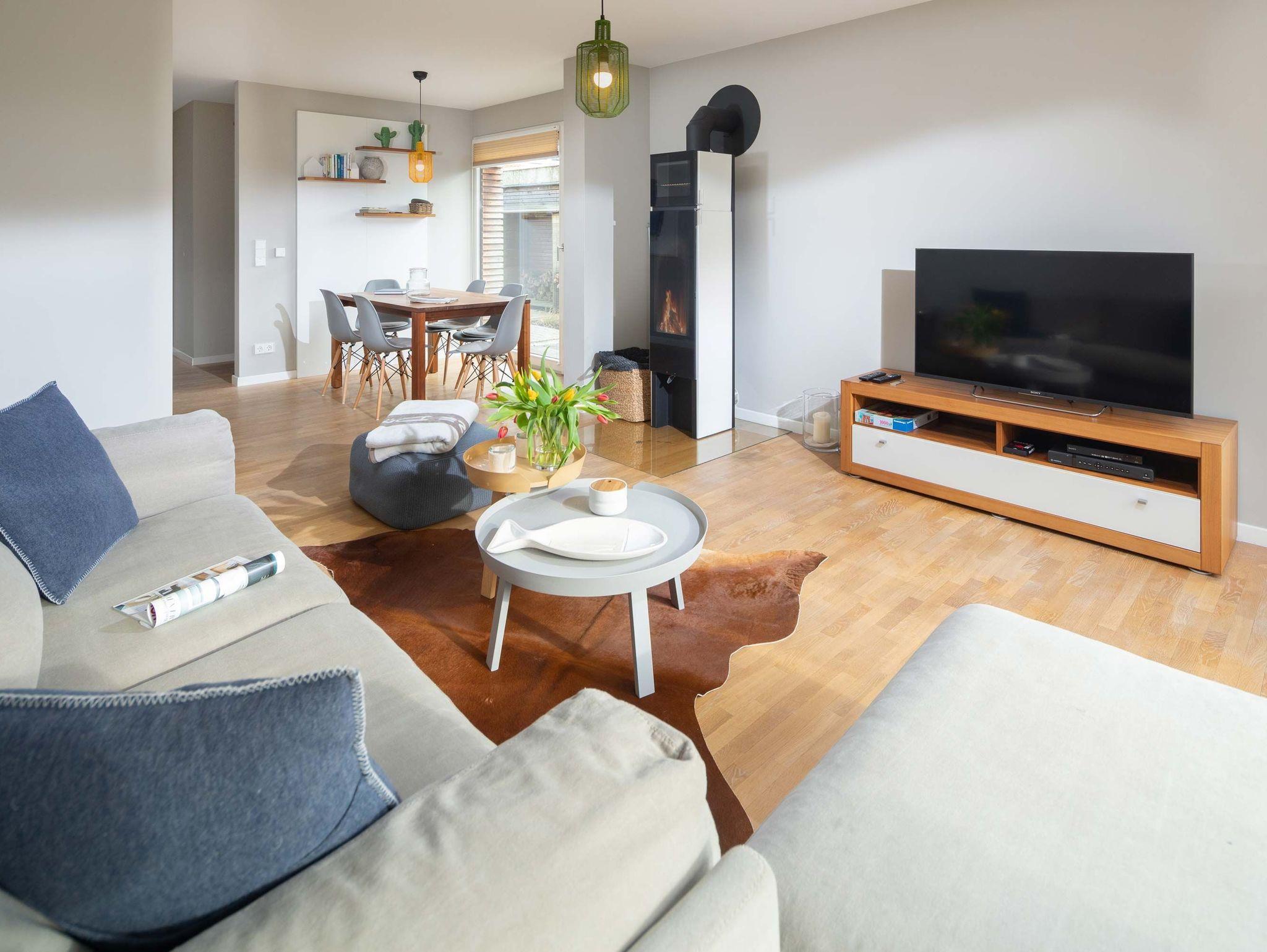 Der Wohnraum bietet eine gemütliche Sitzecke mit Eckcouch und Fernseher. In der kalten Jahreszeit verbreitet der Kamin wohlige Wärme. Ein geräumiger Esstisch mit angrenzender Küche, Gäste-WC und Garderobe befinden sich ebenfalls im unteren Bereich des Hauses. Von hier gelangt man auch auf die Terrasse mit eigenem Gartenteil um entspannt den Urlaubstag ausklingen zu lassen.