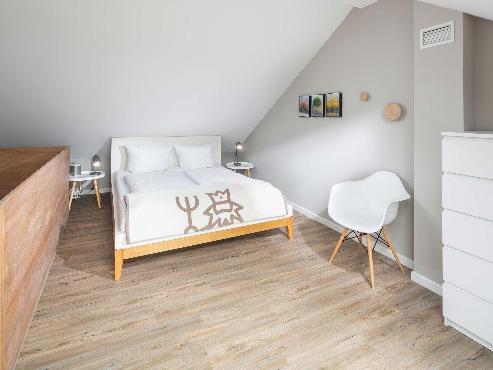 In der ersten Etage befinden sich zwei Schlafzimmer mit Doppelbetten und zwei Badezimmer, eines mit Dusche und WC, eines mit Badewanne und WC. Im Dachgeschoss befindet sich ein weiterer, großer Schlafraum mit Doppelbett.