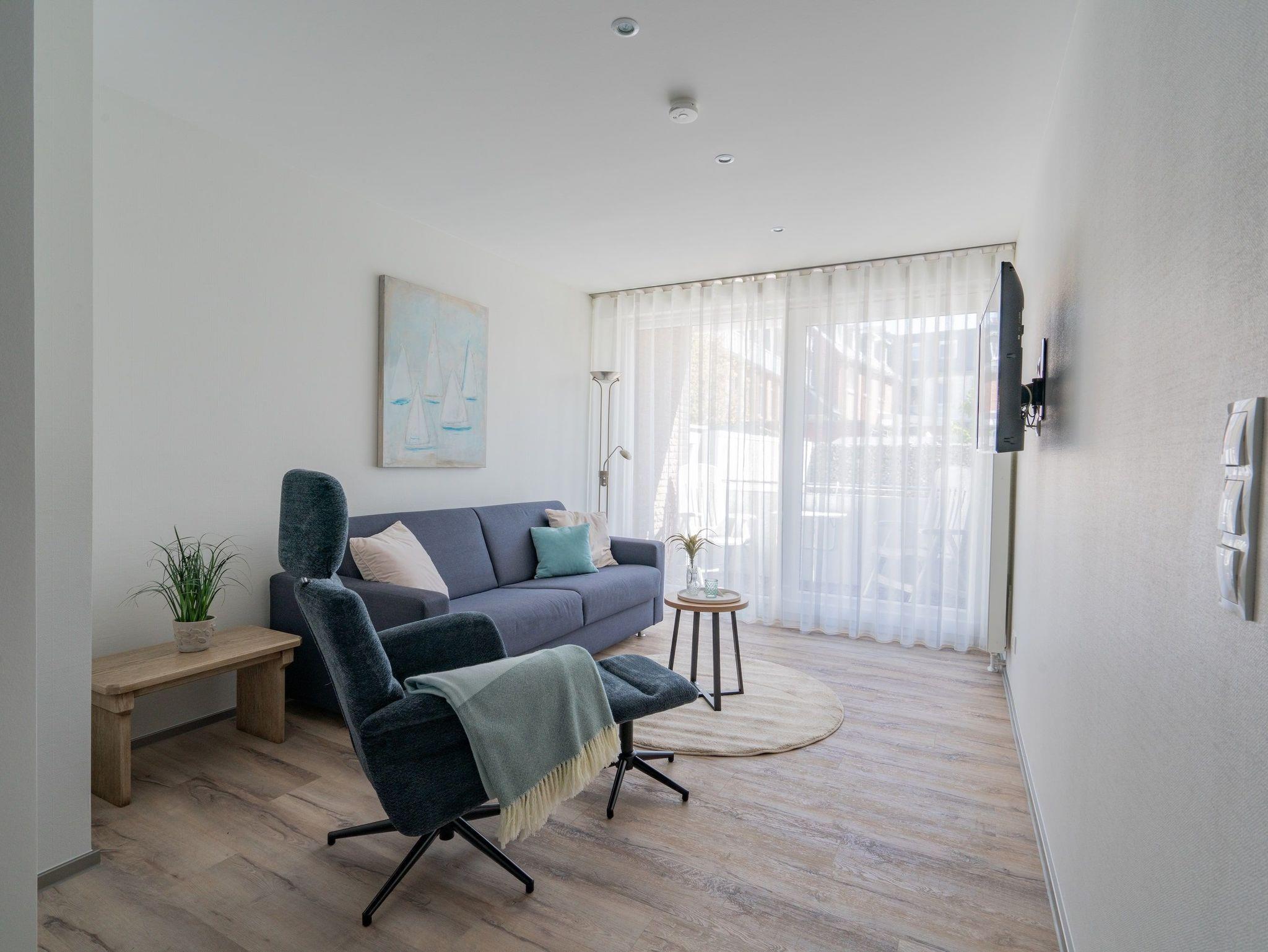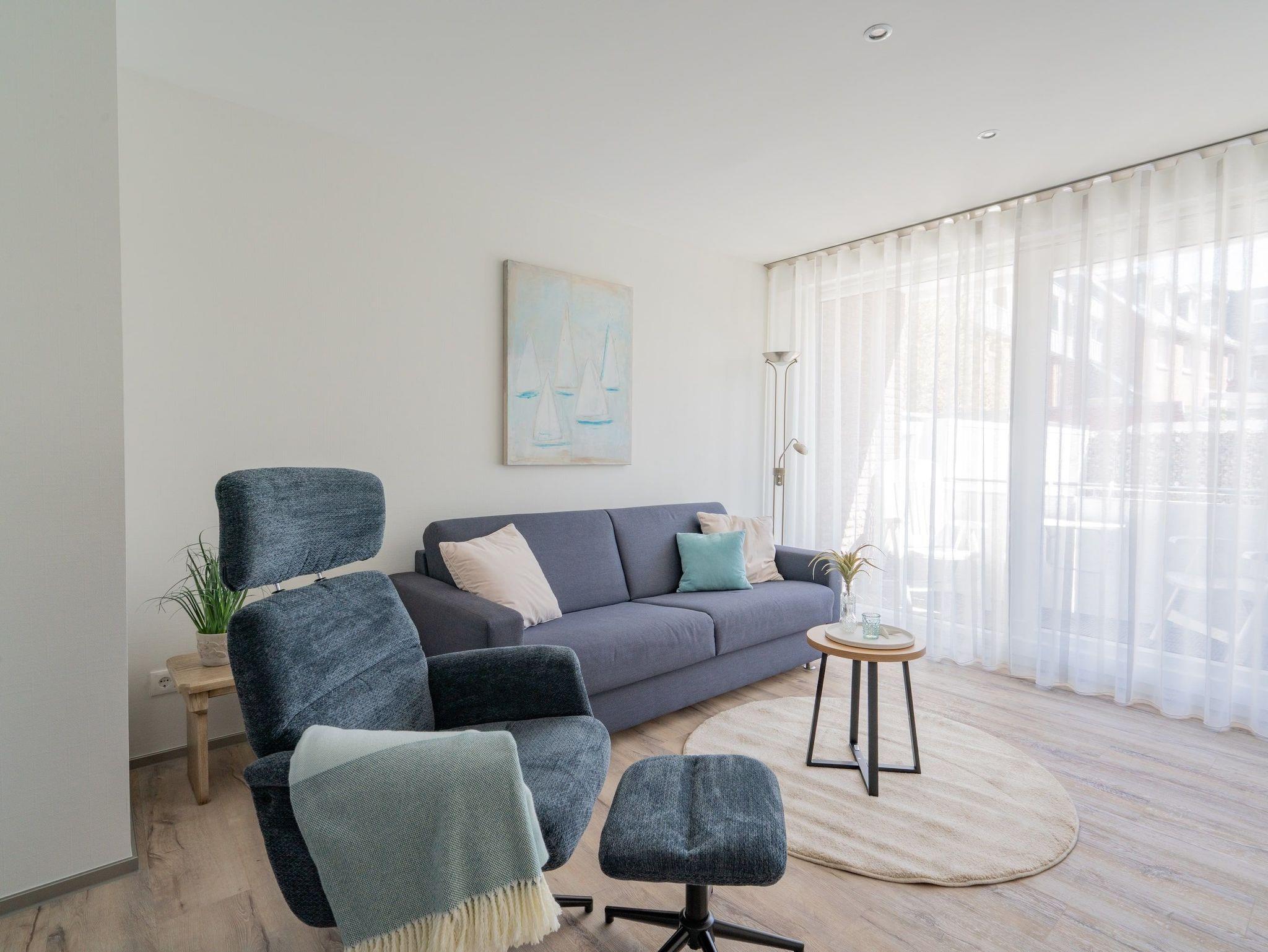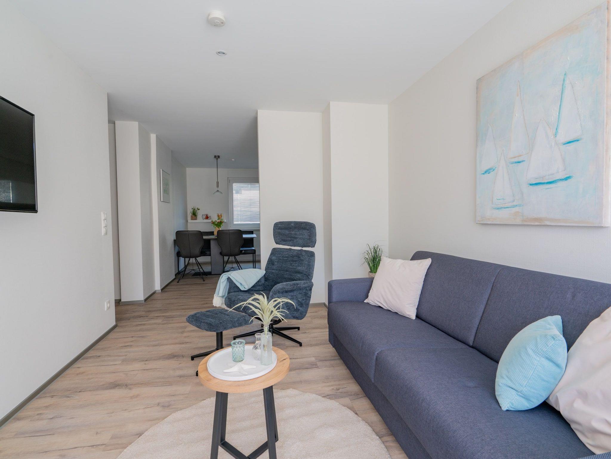 Stylische Ferienwohnung Anker 02 im Herzen von Norderney, nur 250 Meter vom Weststrand entfernt, mit zwei Balkonen und moderner Ausstattung.