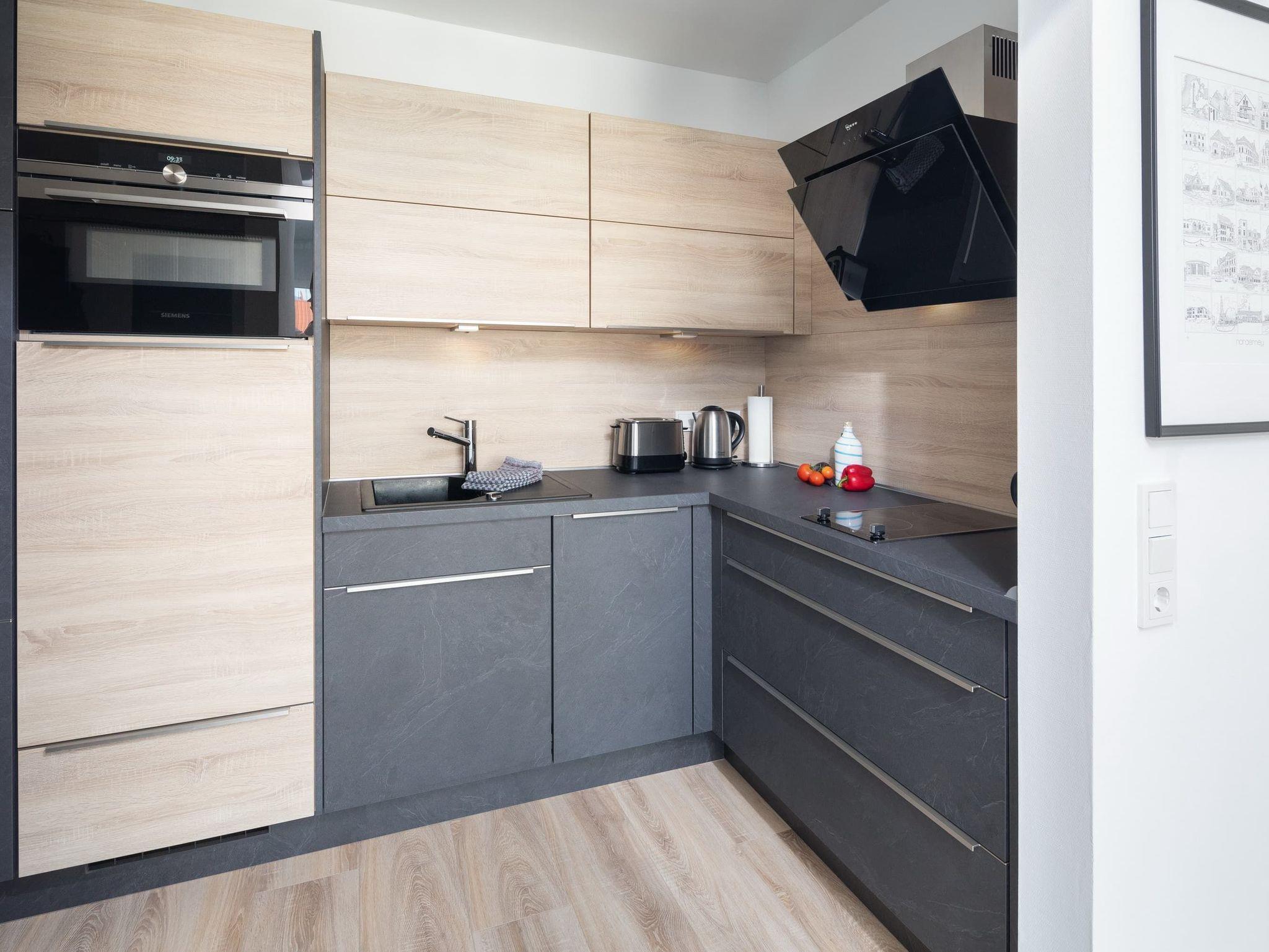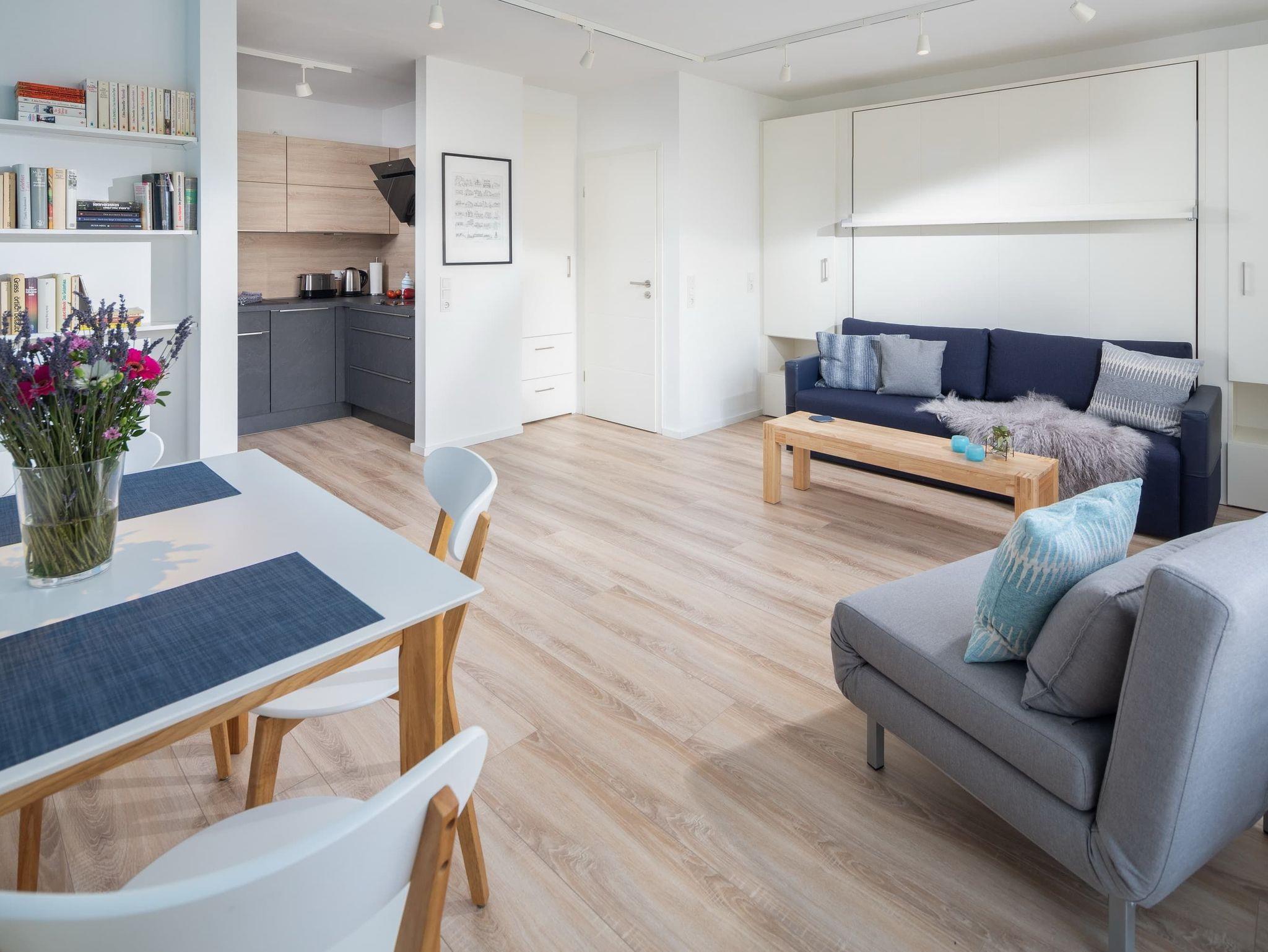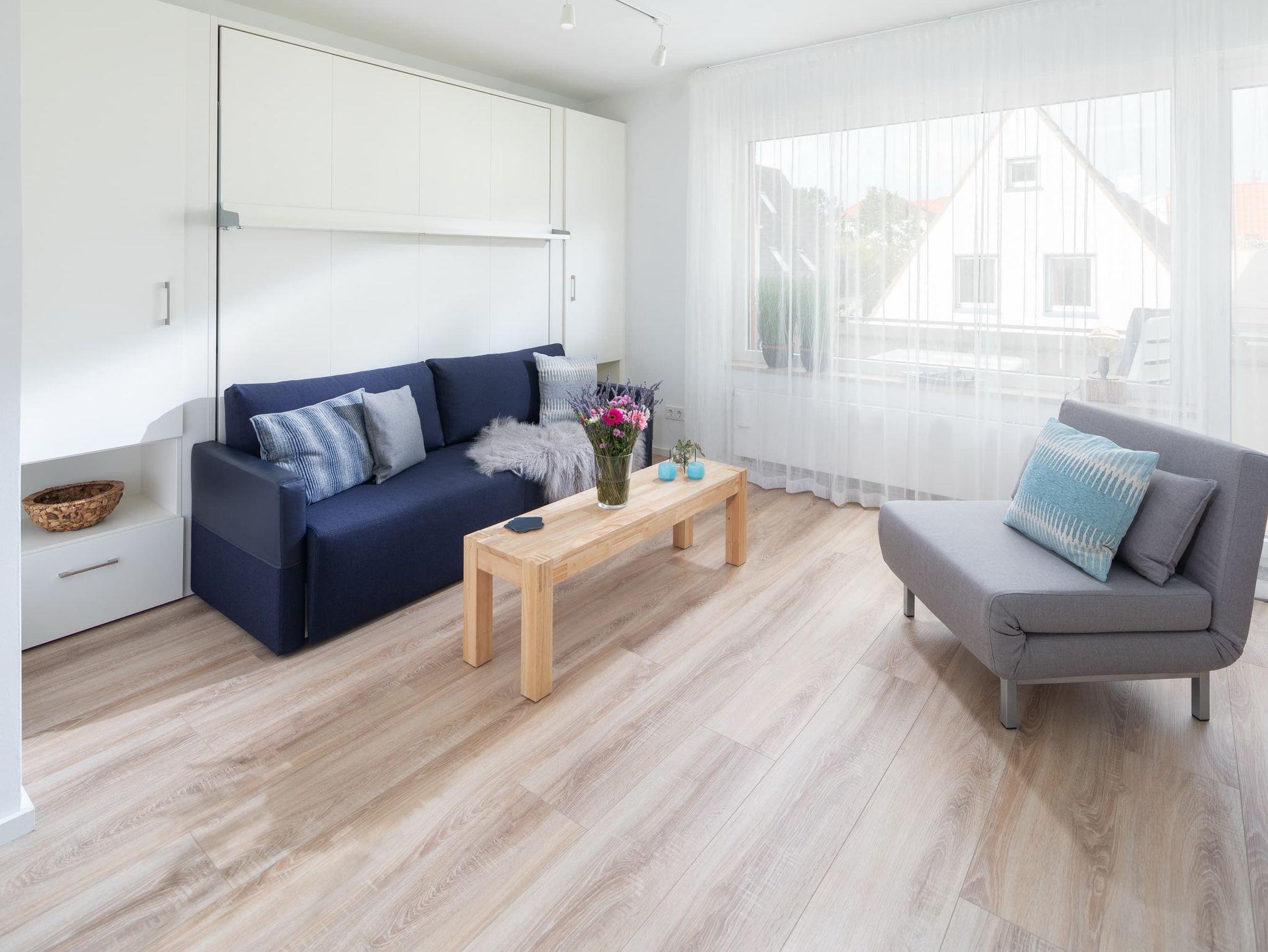 Die Ferienwohnung wurde 2019 komplett saniert. Der helle Wohn- und Schlafraum bietet ein hochwertiges Schrankbett mit integriertem Sofa. Am Esstisch können Sie gemeinsam frühstücken oder im gemütlichen Sessel etwas lesen. Die schöne Fototapete sorgt auch bei Nieselregen für Urlaubsgefühl! Die Küche bietet alle gängigen Elektrogeräte und wird auch Kochliebhabern gerecht. Vom Wohn- und Schlafraum aus gelangen Sie auf den geräumigen Balkon, von dem aus Sie die Dünen des Nordstrandes sehen können. Nur 50m sind es bis zum beliebten Januskopf mit Surfcafé und Cornelius.