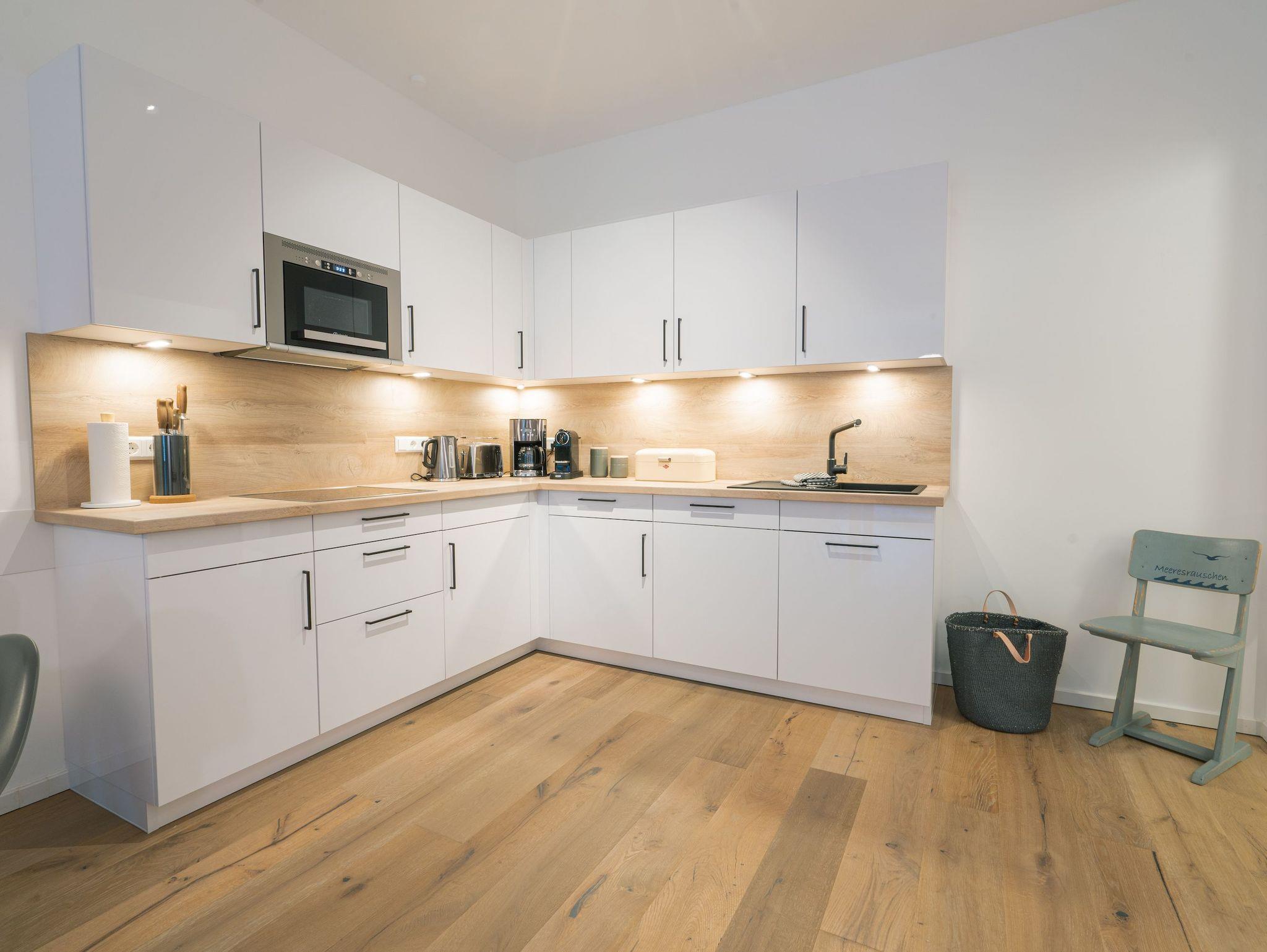 Die große Einbauküche mit Induktionskochfeld, Mikrowelle, Spülmaschine und Kühl-/Gefrierkombination bietet die Möglichkeit zum gemeinsamen Kochen und Genießen.