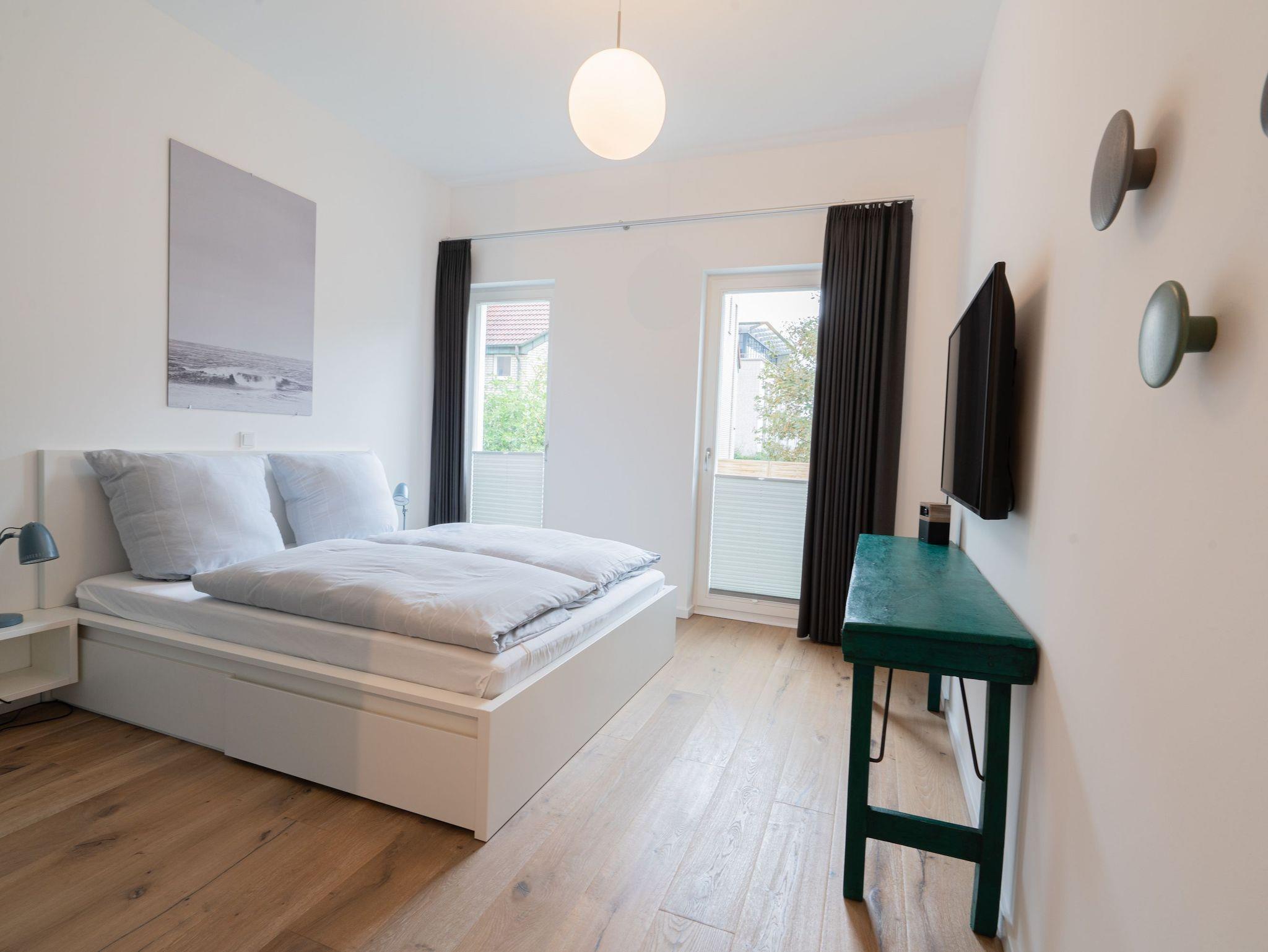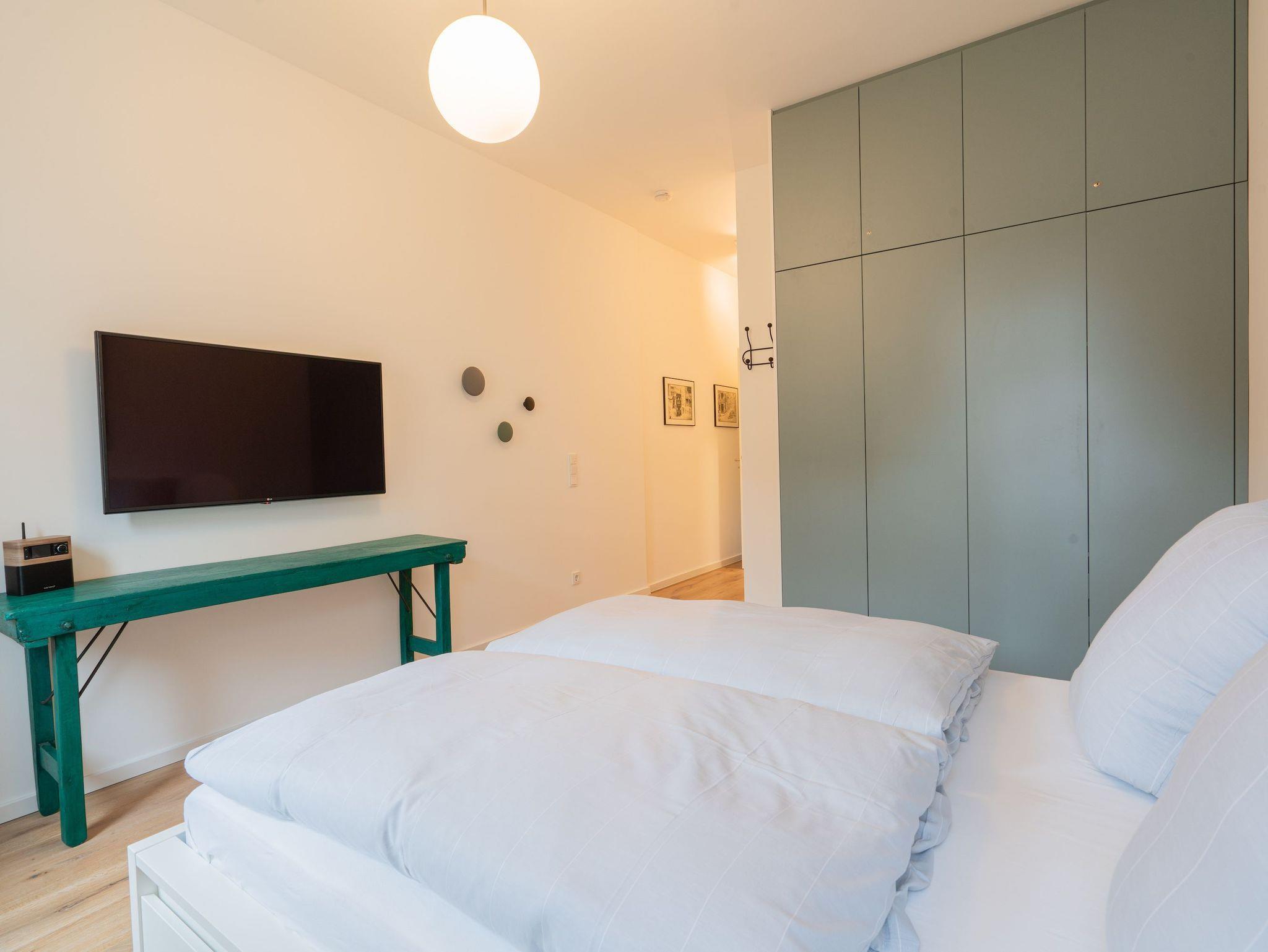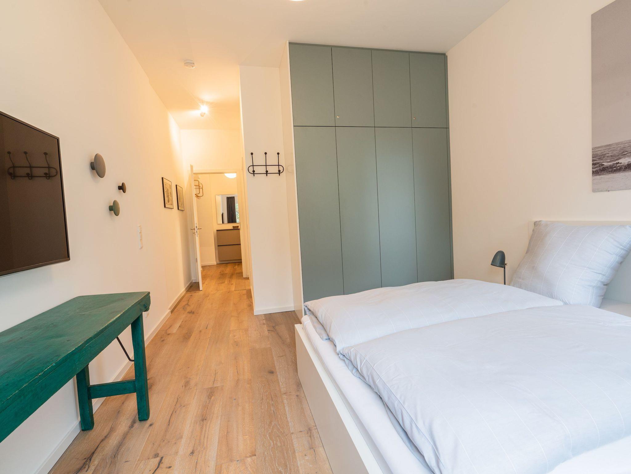 Die Wohnung verfügt über einen separates Schlafzimmer sowie eine hochwertige Ausziehcouch im Wohnzimmer. Das Schlafzimmer ist mit Doppelbett (160×200), Smart-TV und reichlich Schrankplatz als Stauraum eingerichtet. Der Schlafbereich und das geräumige Duschbad sind durch eine Tür von der restlichen Wohnung getrennt und bieten somit eine ruhige Rückzugsmöglichkeit.