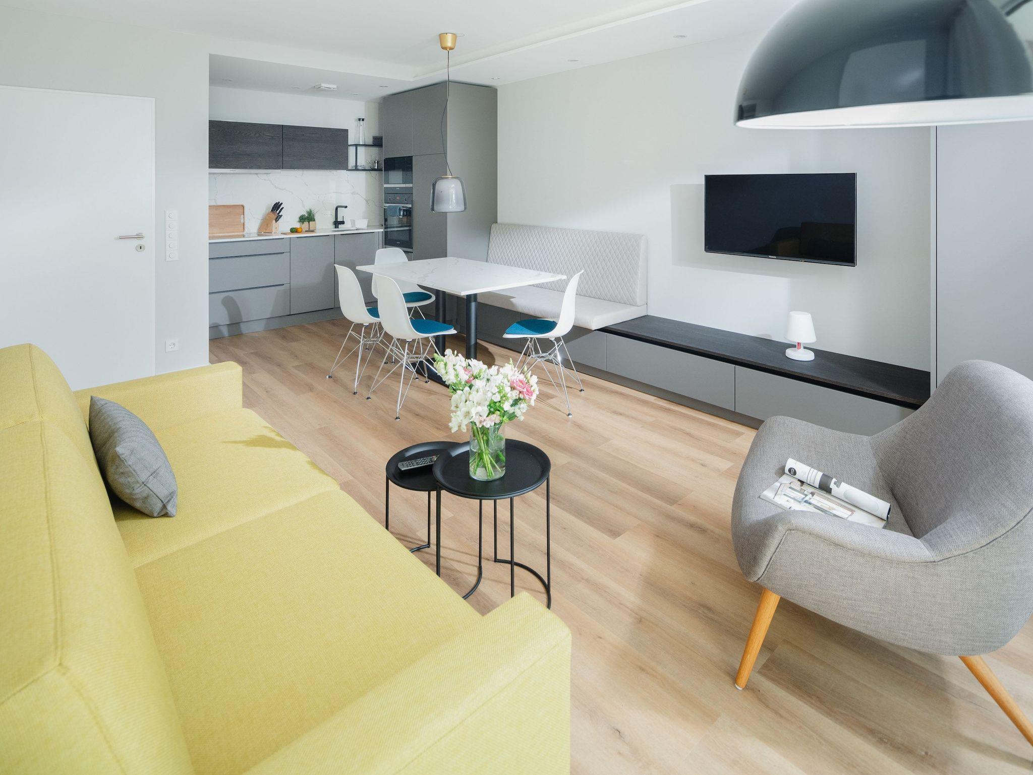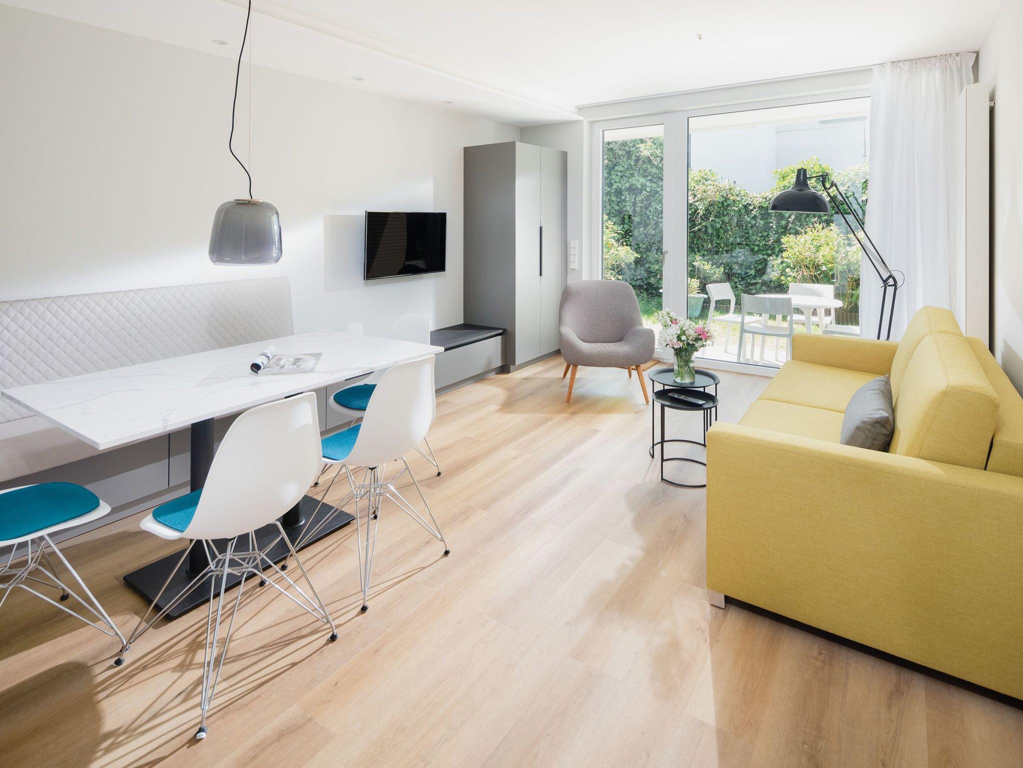Der Wohn- und Essbereich bietet eine gemütliche Sofaecke (Ausziehcouch 160x200) mit Fernseher. Am geräumigen Essplatz lassen sich entspannte, gemeinsame Mahlzeiten geniessen. Die moderne, offene Küche ist umfangreich mit Spülmaschine, Backofen, Mikrowelle und Annehmlichkeiten wie u.a. einer Nespresso-Maschine ausgestattet. Vom Wohnraum gelangen Sie auch auf die geräumige Terrasse mit Gartenanteil. Auch im separaten Schlafzimmer gibt es neben dem Doppelbett (180x200) einen Fernseher. Das moderne Duschbad bietet Ihnen Entspannung unter der Regendusche.