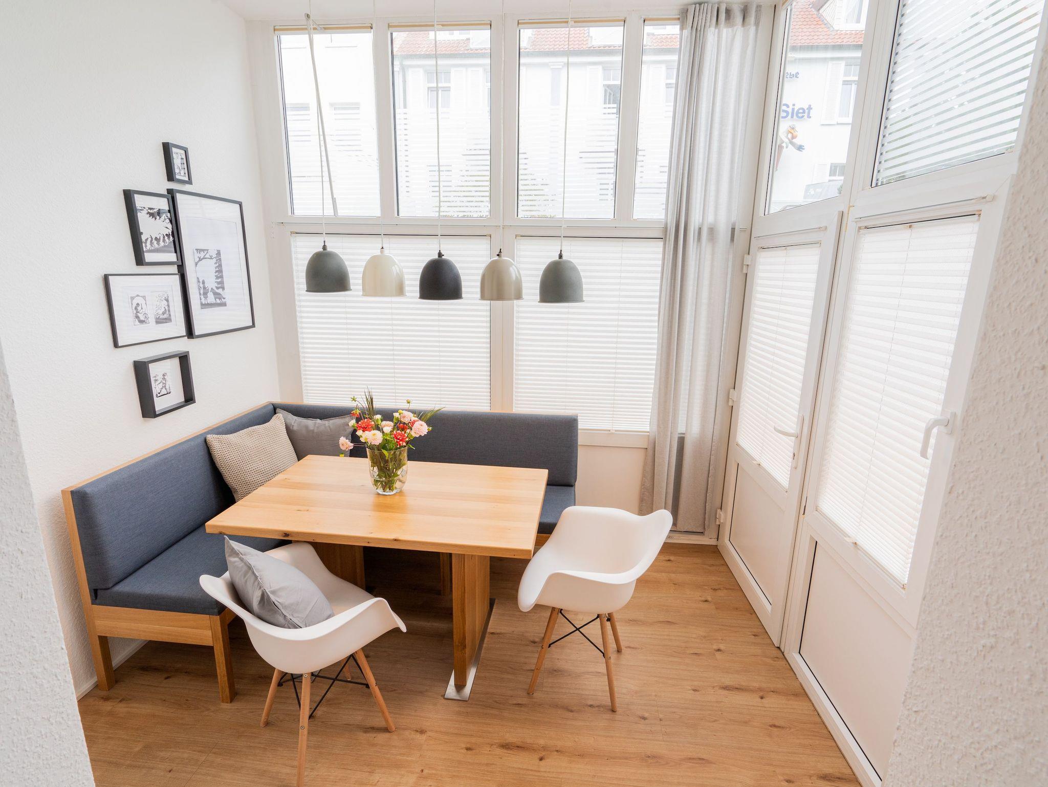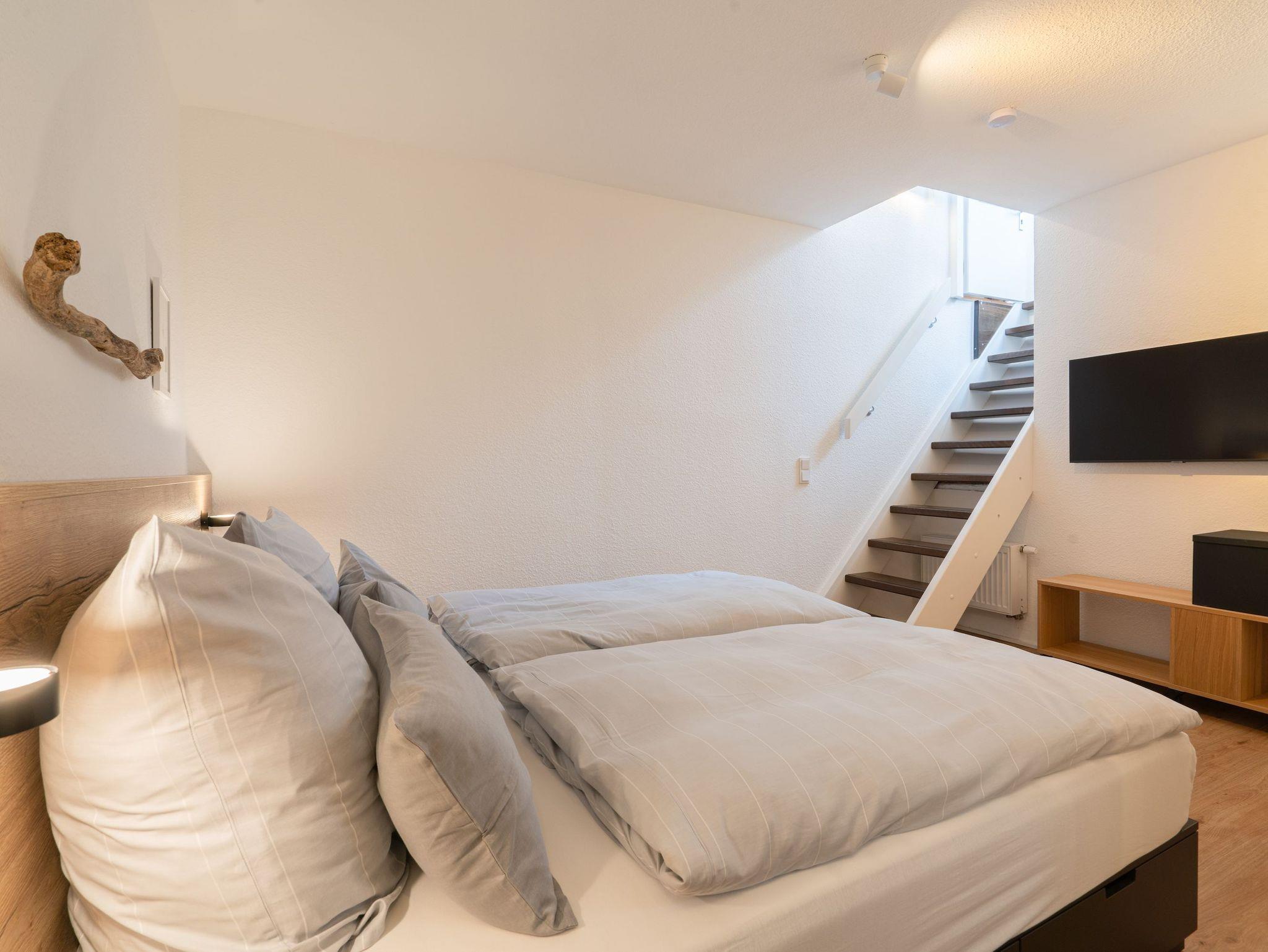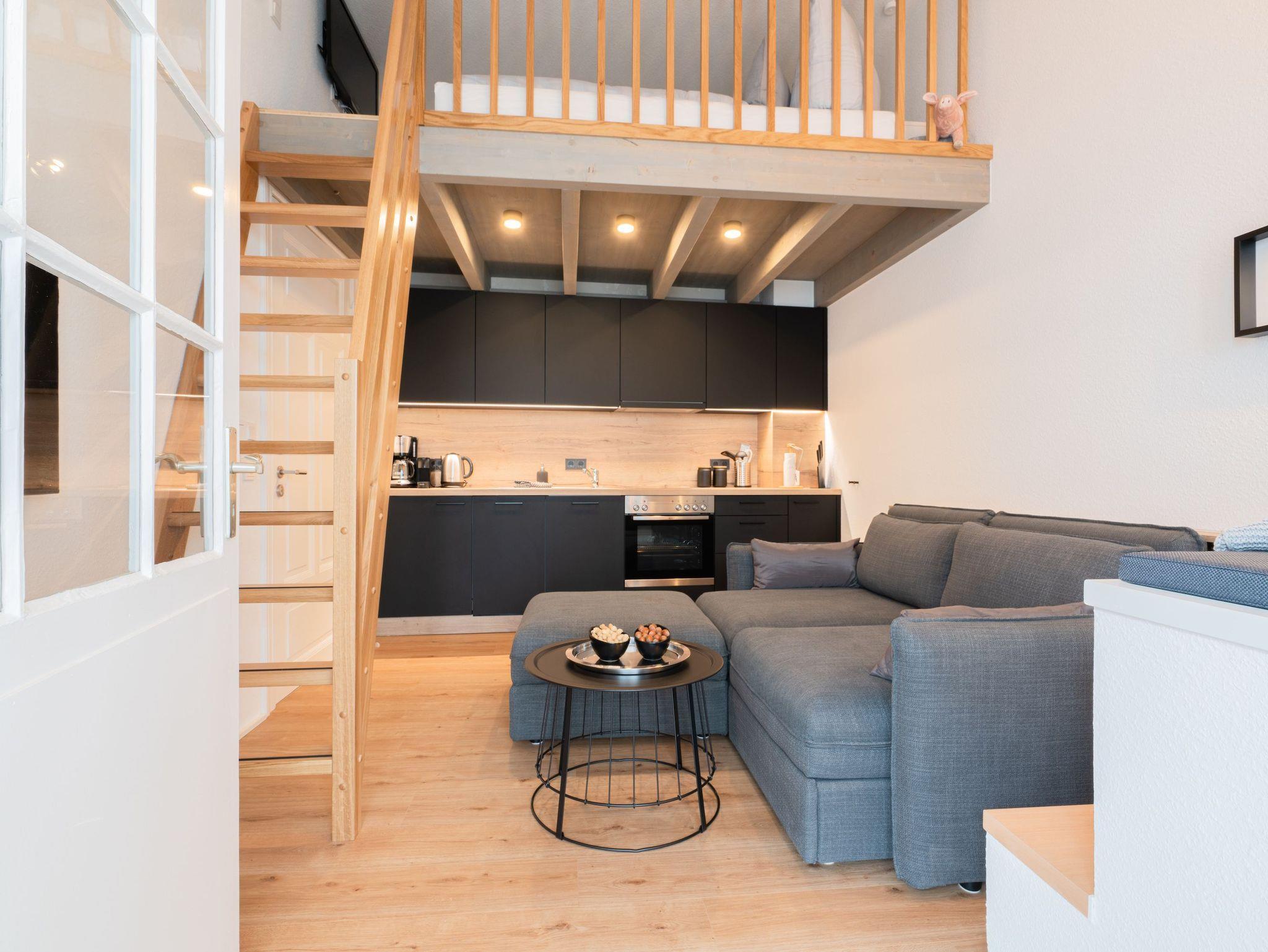 Die 42m2 große Ferienwohnung „mein Meerchen“ wurde 2021 komplett saniert. Sie bietet ein gemütliches Urlaubserlebnis auf 4 Ebenen! Hinter der Eingangstür verbirgt sich der gemütliche Wohnbereich mit Couch, TV und angrenzender Küchenzeile. Ein echtes Highlight des Apartements ist das individuell eingebaute Hochbett im Wohnbereich. Zu diesem gelangen Sie über eine feste Treppe (Kinder sollten mindestens 6 Jahre bzw. kletterfest sein). Dort gibt es zwei 80x200cm Matratzen und einen TV für gemütliche Ruhezeiten. Im Wohnbereich ist zudem eine kleine Empore als gemütlicher Lesesitz vor einem innenliegenden Fenster eingerichtet. Vom Wohnbereich geht es über eine Treppe (4 Stufen) in den Erker der Wohnung. Am geräumigen Esstisch kann man gemeinsam essen und durch die Fenster des Treiben auf der Friedrichstraße beobachten. Alternativ kann man natürlich mit geschlossenen Plissees die Zeit einfach „unter sich“ geniessen. Das innenliegende Schlafzimmer erreichen Sie von dort über eine weitere Treppe. Dort gibt es ein Doppelbett (180x200cm) und einen dritten Fernseher. Von diesem Raum abgehend gibt es ein kleines Zimmerchen mit Kleiderschrank und ein klitzekleines Badezimmer ? durch die praktische Schiebetür (Spiegel) kann man auf Wunsch einen der beiden Räume schließen. Das kleine, moderne Duschbad bietet Waschbecken und Dusche. Von dort geht eine Tür zum WC mit Abstellraum ab. Durch den ungewöhnlichen Schnitt hat die Ferienwohnung „mein Meerchen“ sehr viel Charme, ist aber eher für Familien mit Kindern oder Freunde, die sich sehr gut kennen, geeignet.