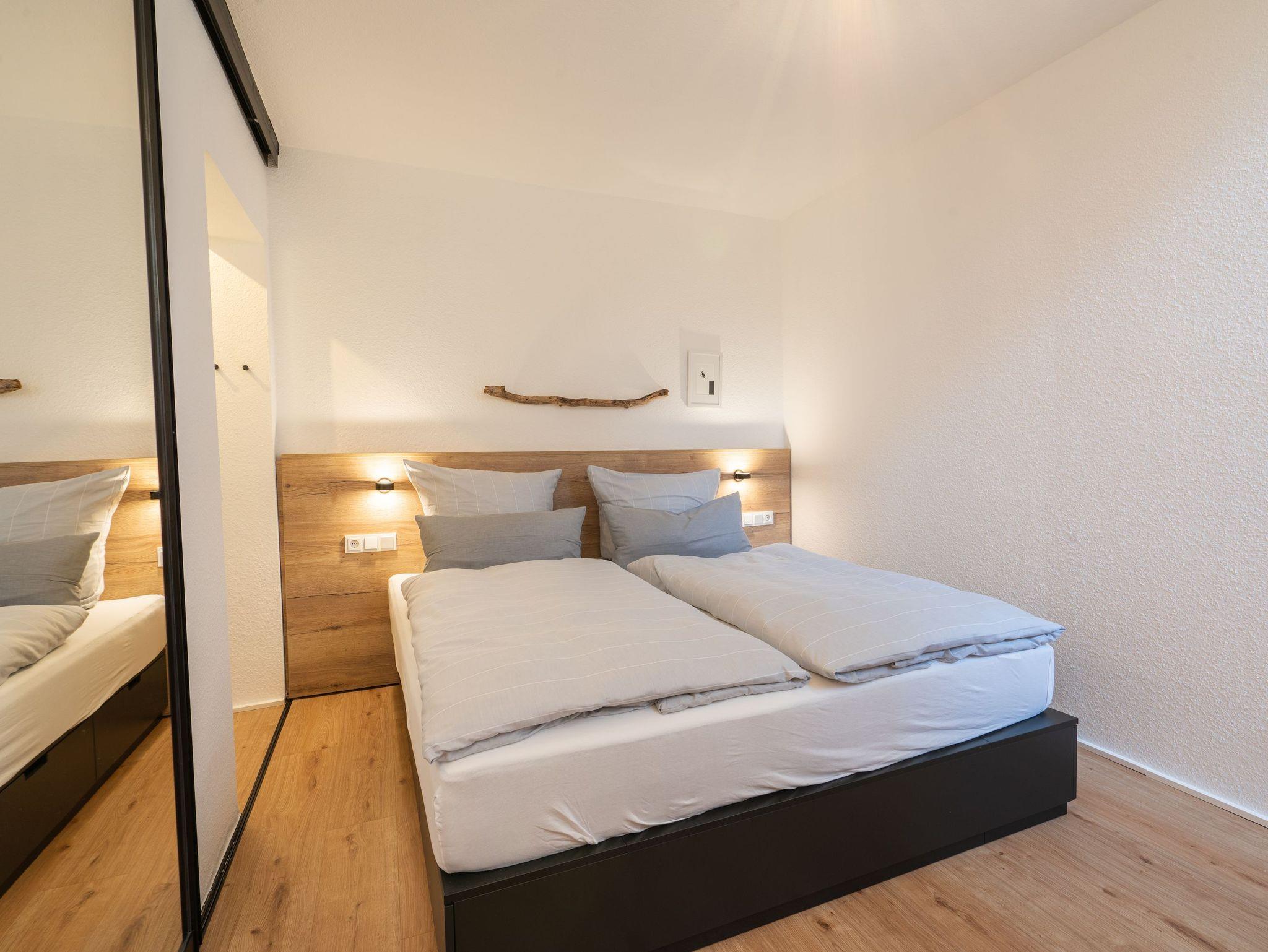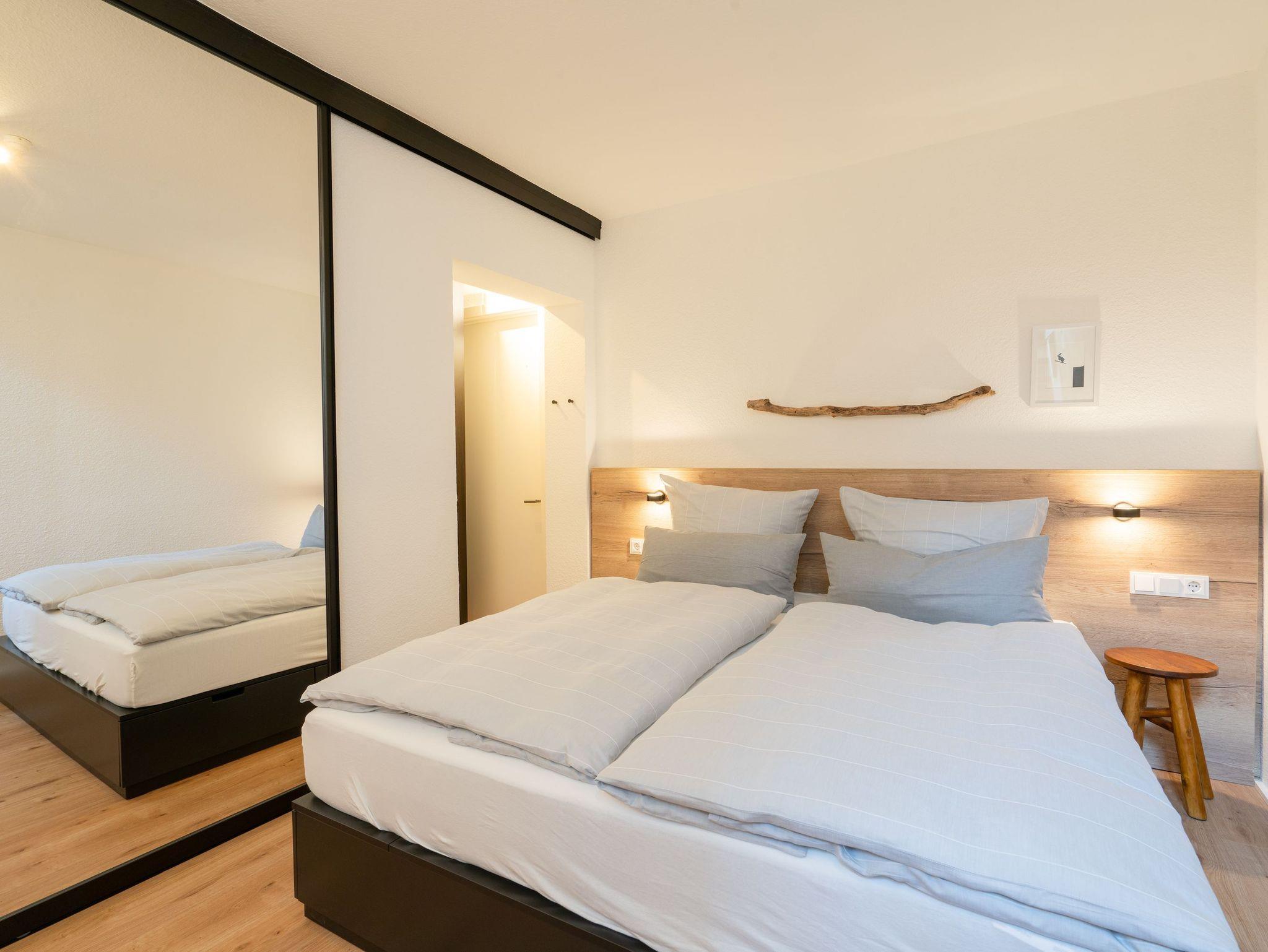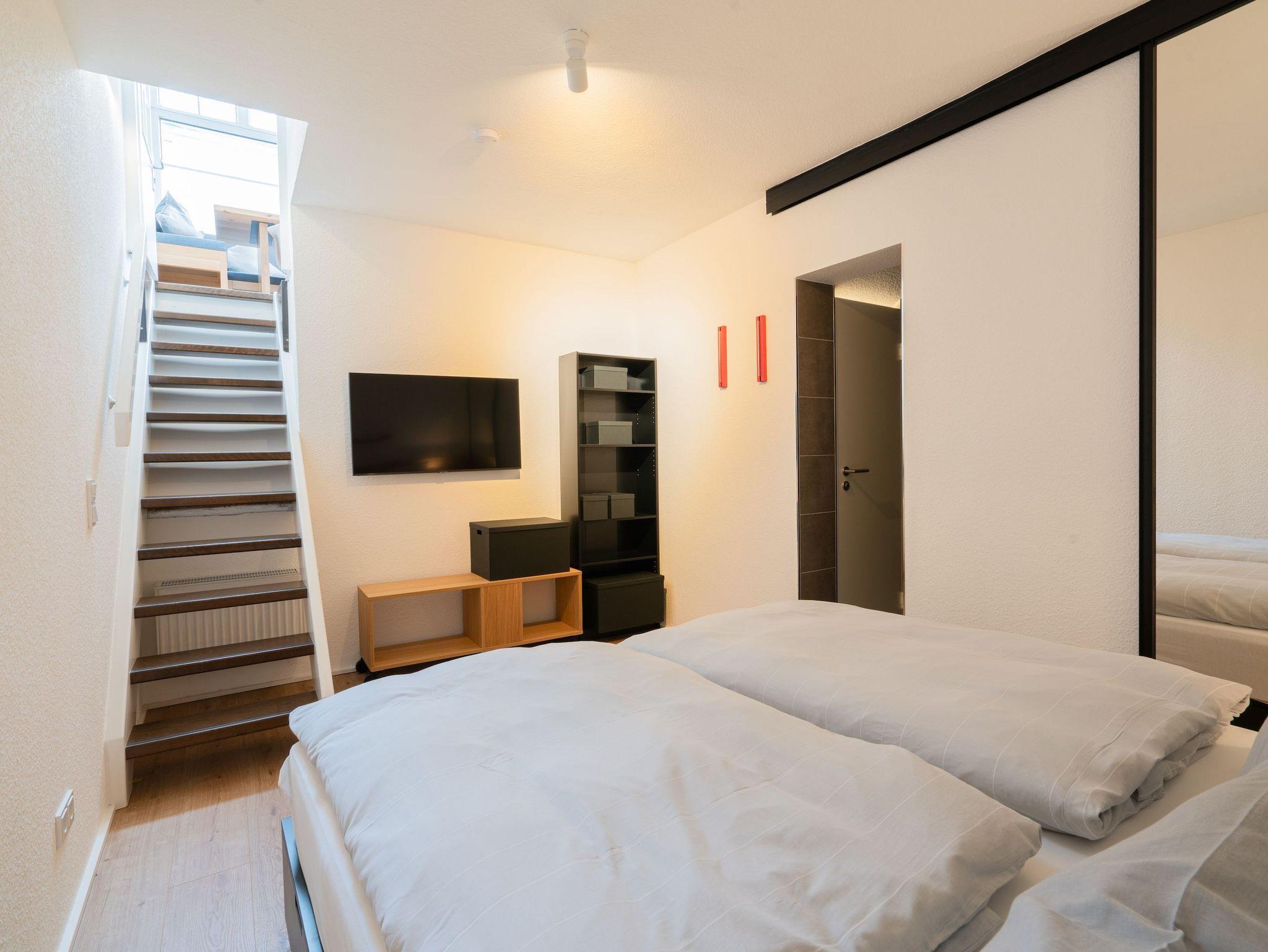 Die 42m2 große Ferienwohnung „mein Meerchen“ wurde 2021 komplett saniert. Sie bietet ein gemütliches Urlaubserlebnis auf 4 Ebenen! Hinter der Eingangstür verbirgt sich der gemütliche Wohnbereich mit Couch, TV und angrenzender Küchenzeile. Ein echtes Highlight des Apartements ist das individuell eingebaute Hochbett im Wohnbereich. Zu diesem gelangen Sie über eine feste Treppe (Kinder sollten mindestens 6 Jahre bzw. kletterfest sein). Dort gibt es zwei 80x200cm Matratzen und einen TV für gemütliche Ruhezeiten. Im Wohnbereich ist zudem eine kleine Empore als gemütlicher Lesesitz vor einem innenliegenden Fenster eingerichtet. Vom Wohnbereich geht es über eine Treppe (4 Stufen) in den Erker der Wohnung. Am geräumigen Esstisch kann man gemeinsam essen und durch die Fenster des Treiben auf der Friedrichstraße beobachten. Alternativ kann man natürlich mit geschlossenen Plissees die Zeit einfach „unter sich“ geniessen. Das innenliegende Schlafzimmer erreichen Sie von dort über eine weitere Treppe. Dort gibt es ein Doppelbett (180x200cm) und einen dritten Fernseher. Von diesem Raum abgehend gibt es ein kleines Zimmerchen mit Kleiderschrank und ein klitzekleines Badezimmer ? durch die praktische Schiebetür (Spiegel) kann man auf Wunsch einen der beiden Räume schließen. Das kleine, moderne Duschbad bietet Waschbecken und Dusche. Von dort geht eine Tür zum WC mit Abstellraum ab. Durch den ungewöhnlichen Schnitt hat die Ferienwohnung „mein Meerchen“ sehr viel Charme, ist aber eher für Familien mit Kindern oder Freunde, die sich sehr gut kennen, geeignet.
