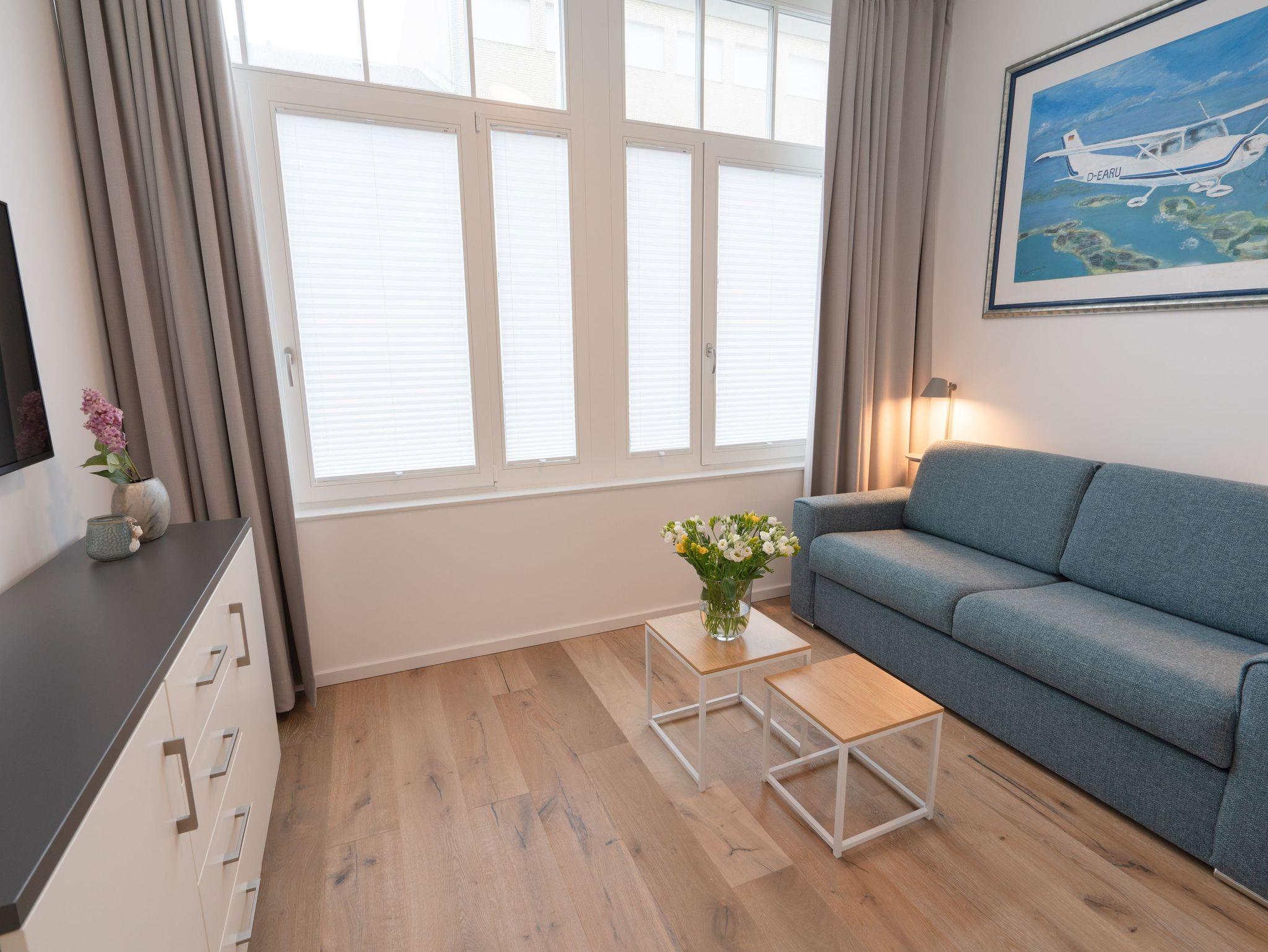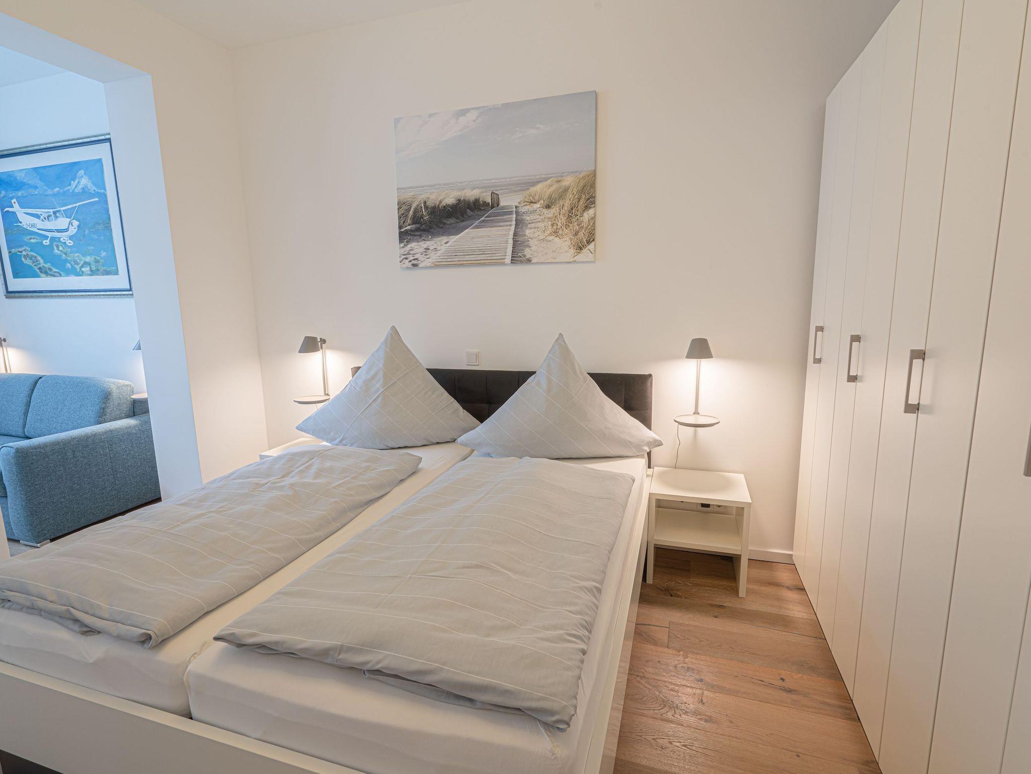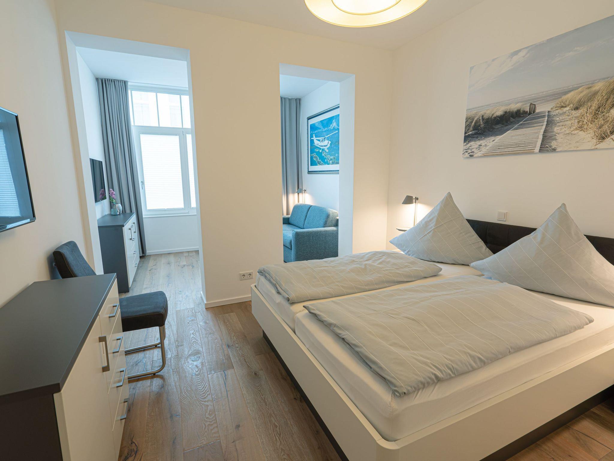 Diese exklusive Wohnung „Meergenuss“ ist eine 79 m² große, mit Echtholzparkett ausgelegte Wohnung. Sie befindet sich im Erdgeschoss und überzeugt durch den perfekten Grundriss mit einem großen Wohn- und Esszimmer inkl. Küche mit Wohncharakter, zwei Schlafräumen sowie Bad und Terrasse im ruhigen Hinterhof. Die 3,50 Meter hohen Decken verleihen dem Appartement einen besonderen Charme. Die Wohnung bietet zwei Schlafzimmer mit Doppelbett und TV. Im zweiten Schlafzimmer befindet sich eine abgegrenzte Wohnzimmerecke mit Couch, Sessel und einem weiteren Fernseher. Über die Bang [&] Olufsen Bluetooth-Lautsprecher können Sie Musik nach Ihrem eigenen Geschmack geniessen.