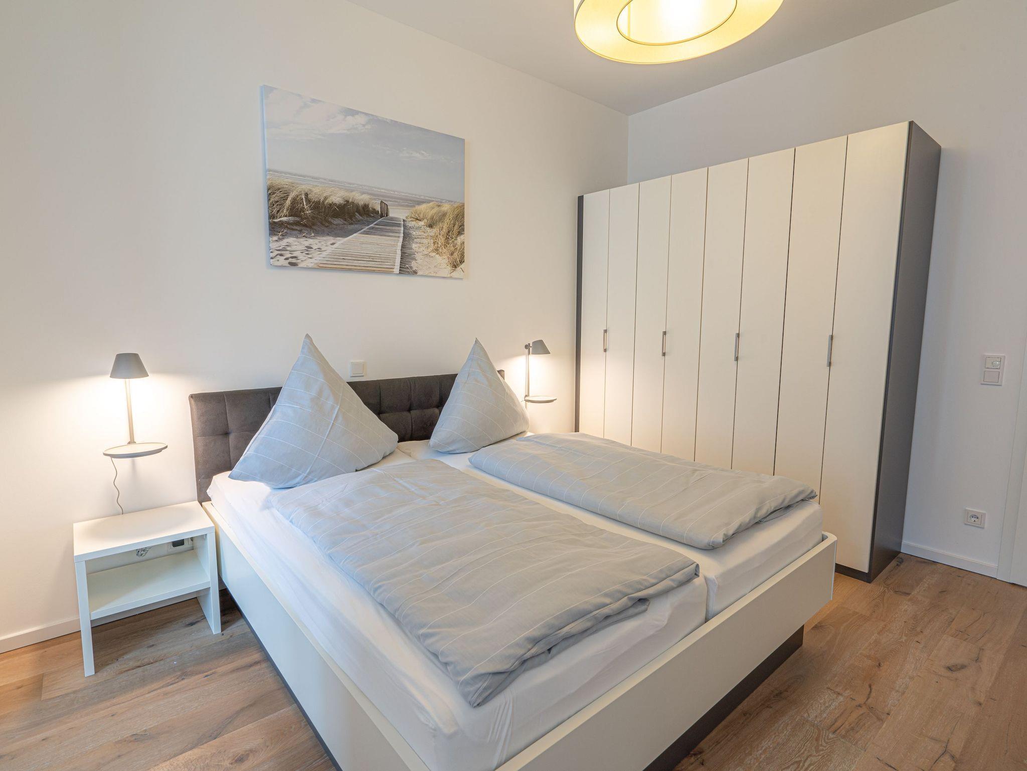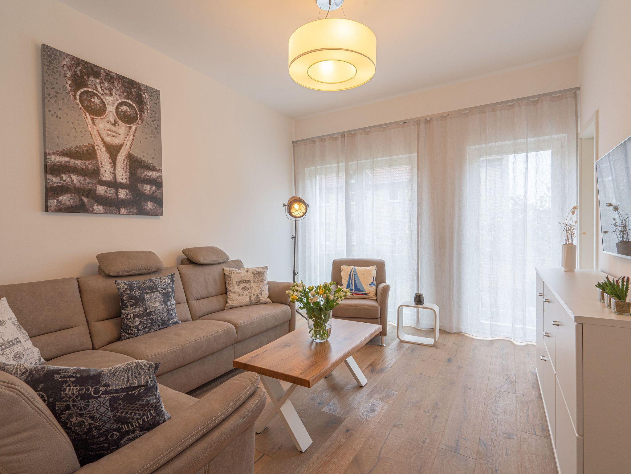 Diese exklusive Wohnung ?Meergenuss? ist eine 79 m² große, mit Echtholzparkett ausgelegte Wohnung. Sie befindet sich im Erdgeschoss und überzeugt durch den perfekten Grundriss mit einem großen Wohn- und Esszimmer inkl. Küche mit Wohncharakter, zwei Schlafräumen sowie Bad und Terrasse im ruhigen Hinterhof. Die 3,50 Meter hohen Decken verleihen dem Appartement einen besonderen Charme. Die Wohnung bietet zwei Schlafzimmer mit Doppelbett und TV. Im zweiten Schlafzimmer befindet sich eine abgegrenzte Wohnzimmerecke mit Couch, Sessel und einem weiteren Fernseher. Über die Bang [&] Olufsen Bluetooth-Lautsprecher können Sie Musik nach Ihrem eigenen Geschmack geniessen.
