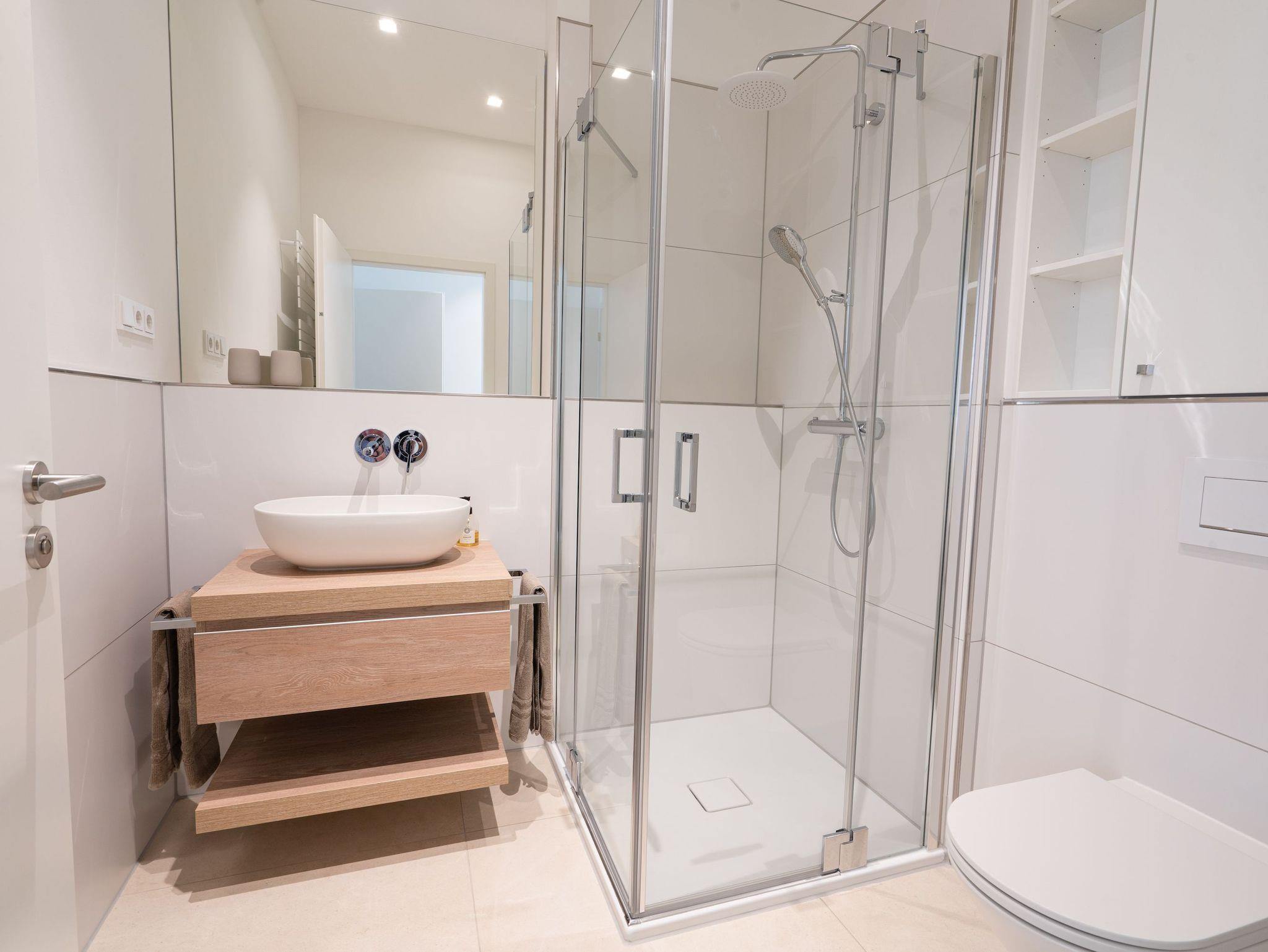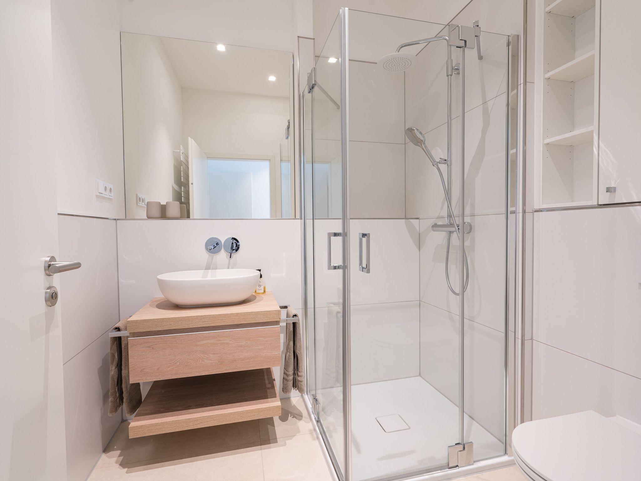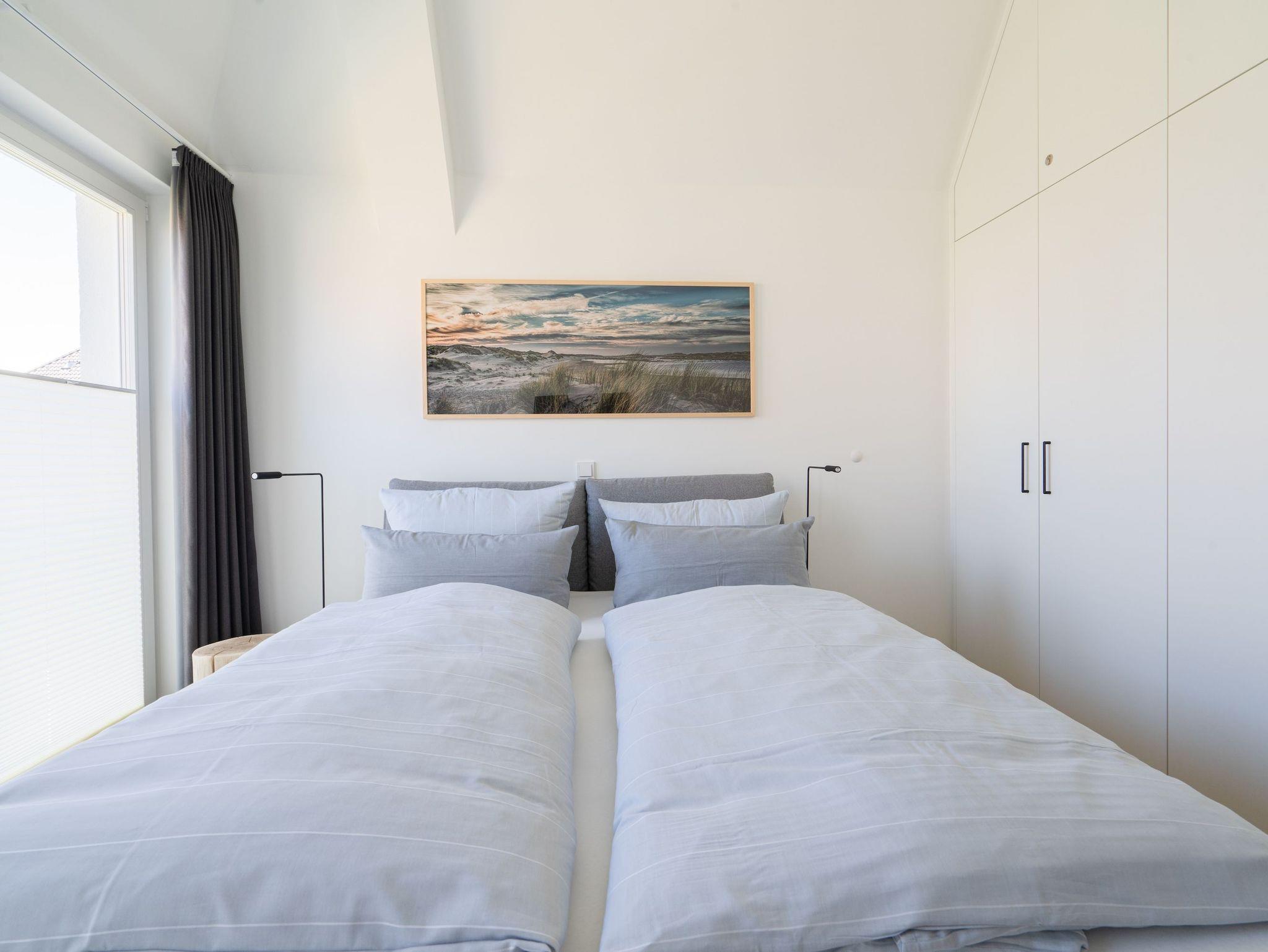 Die Wohnung verfügt über zwei Schlafräume.Beide bieten neben einem 1,80m breiten Boxspringbett ausreichend Stauraum und einen Fernseher und haben von dort Zugang zum jeweiligen Bad.