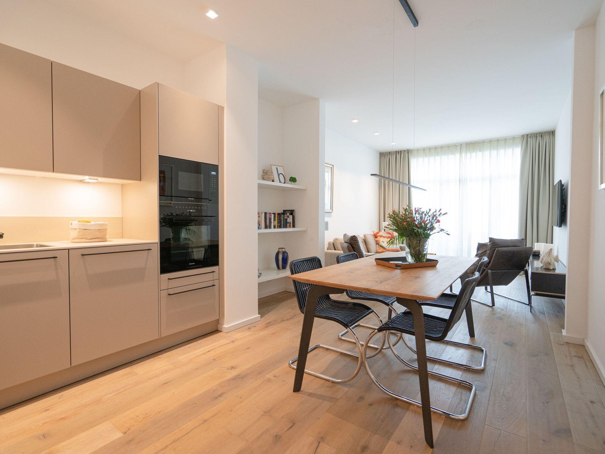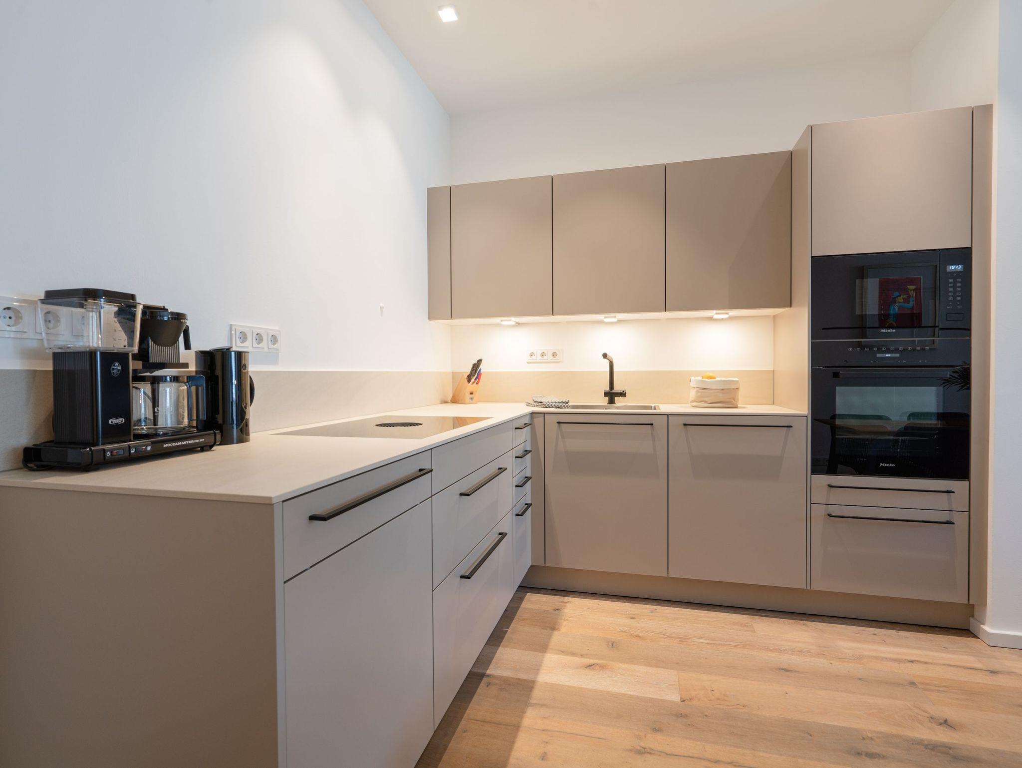 Das zur Dachterrasse gelegene, lichtdurchflutete Wohnzimmer bietet neben der gemütlichen Sofaecke mit TV und zwei Sesseln einen geräumigen Esstisch und eine angrenzende, großzügige Wohnküche. Ein perfekter Ort zum Zusammensein, Kochen, Spielen und Entspannen. Die Einbauküche bietet ein Glaskeramikkochfeld mit 4 Kochzonen, Backofen, Mikrowelle, Spülmaschine und Kühl-/Gefrierkombination.