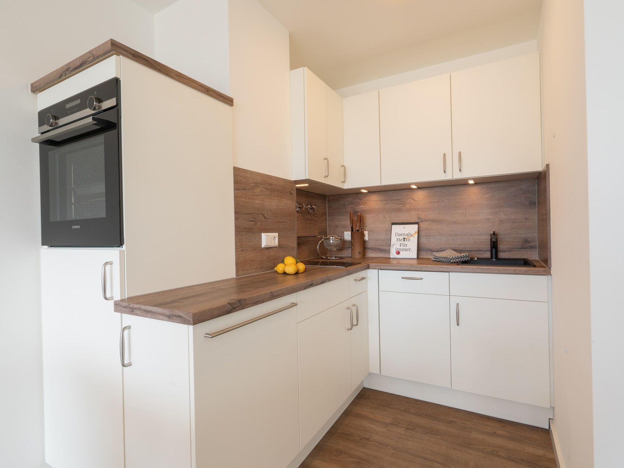 Der Wohnbereich mit offener Küche bietet einen Esstisch für gemeinsame Mahlzeiten, die in der perfekt