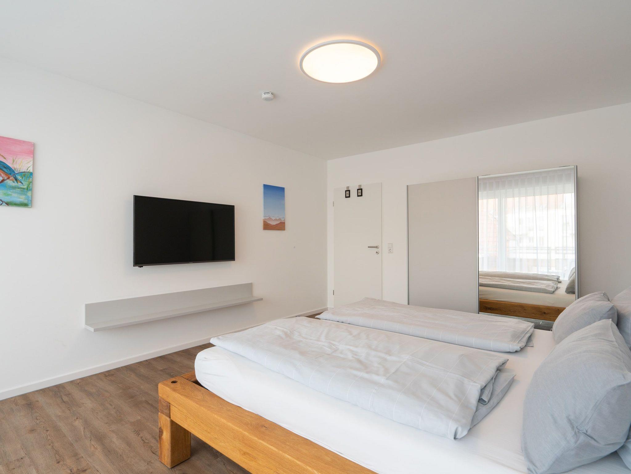 Im separaten Schlafzimmer gibt es neben dem gemütlichen Doppelbett (180cm Breite) reichlich Stauraum und einen weiteren Fernseher.