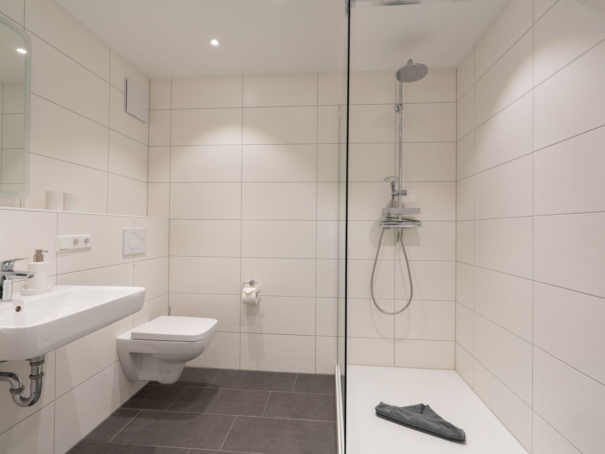 Das große, moderne Duschbad hat eine bodentiefe Dusche.