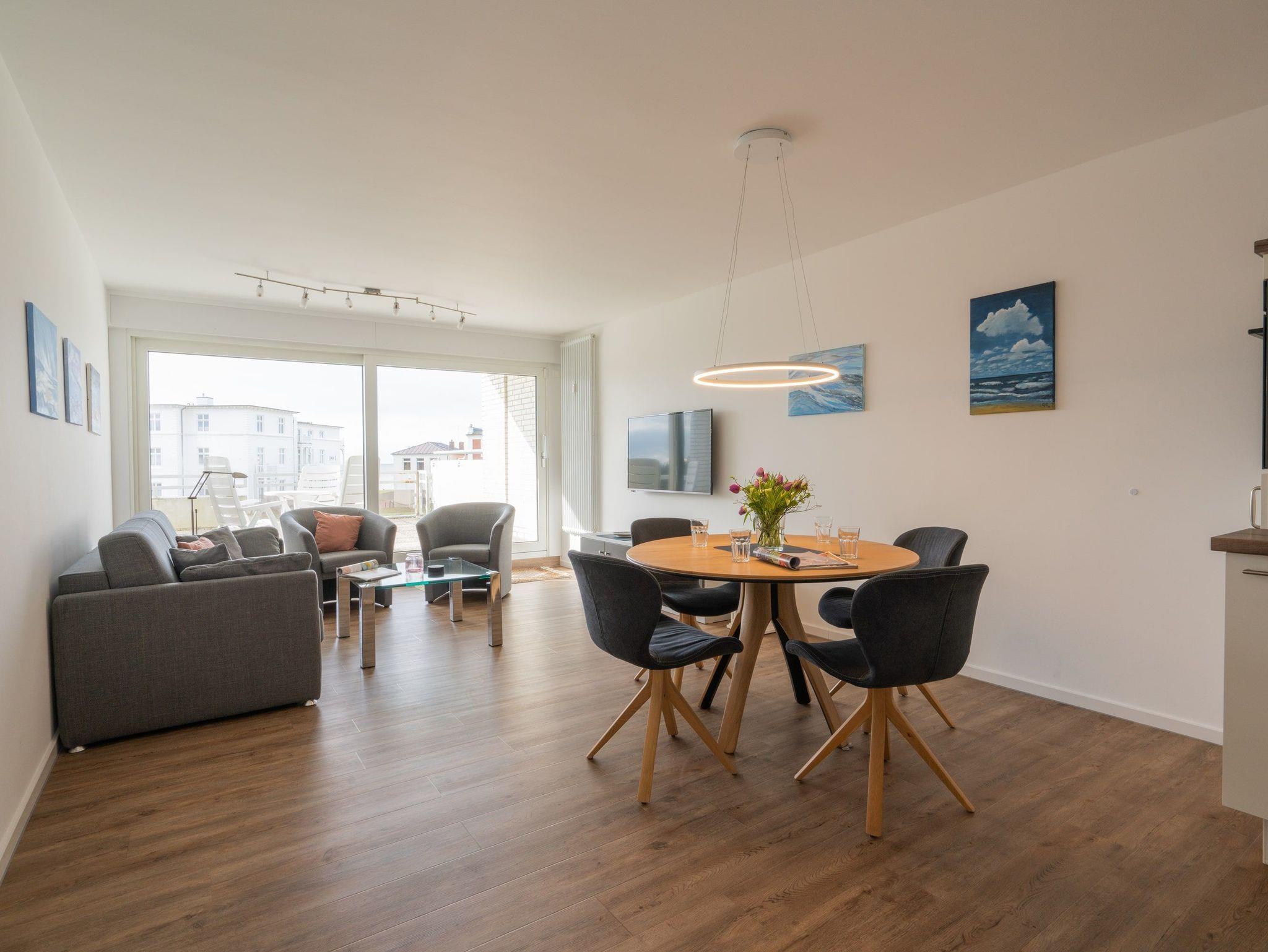 zwei Sesseln und TV. Hier kann man auch bei friesischem Nieselwetter den unvergleichlichen Meerblick durch die bodentiefen Fenster geniessen.
