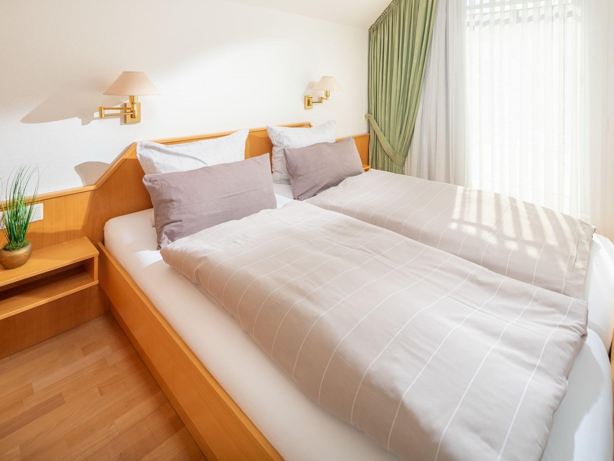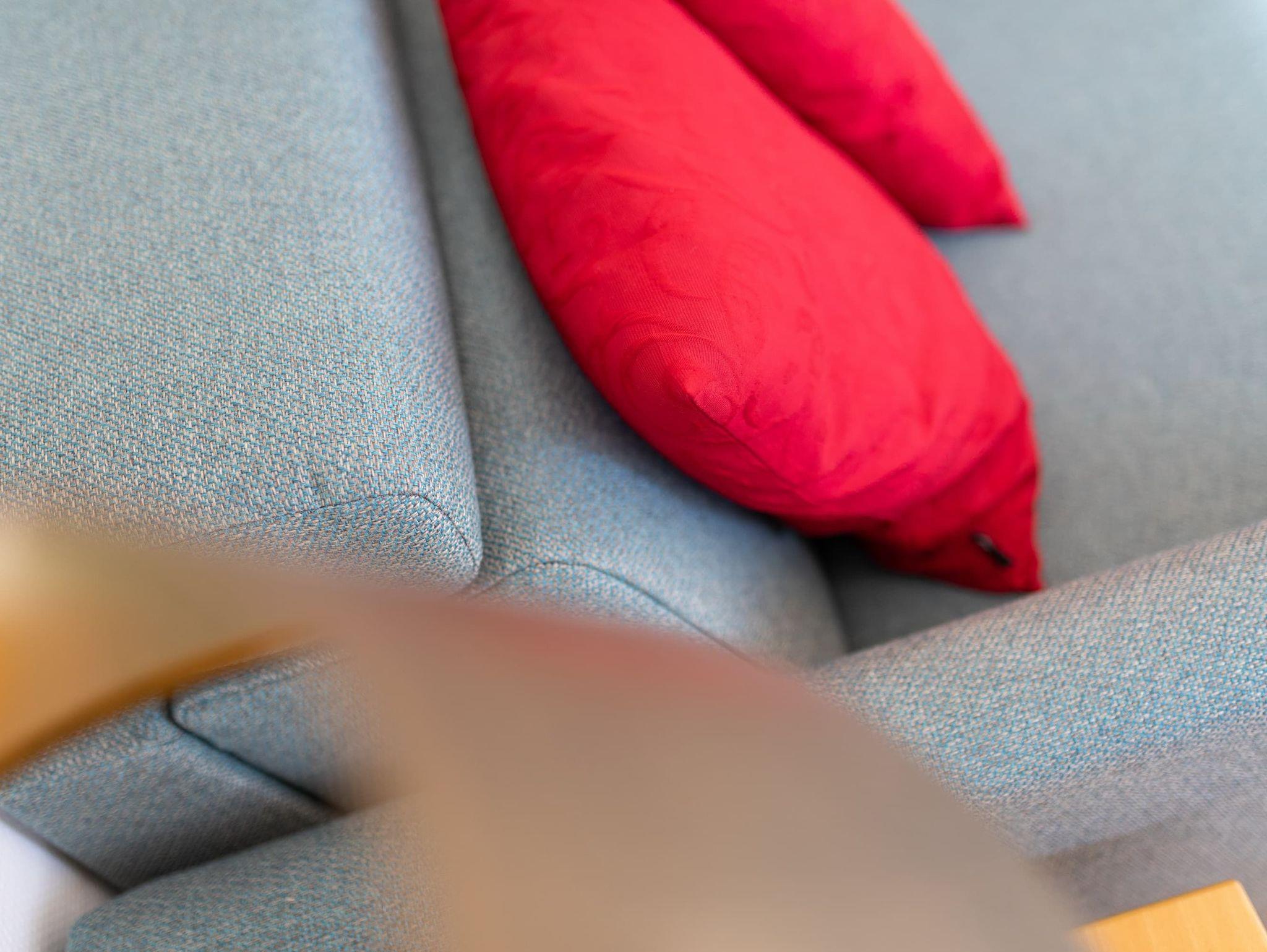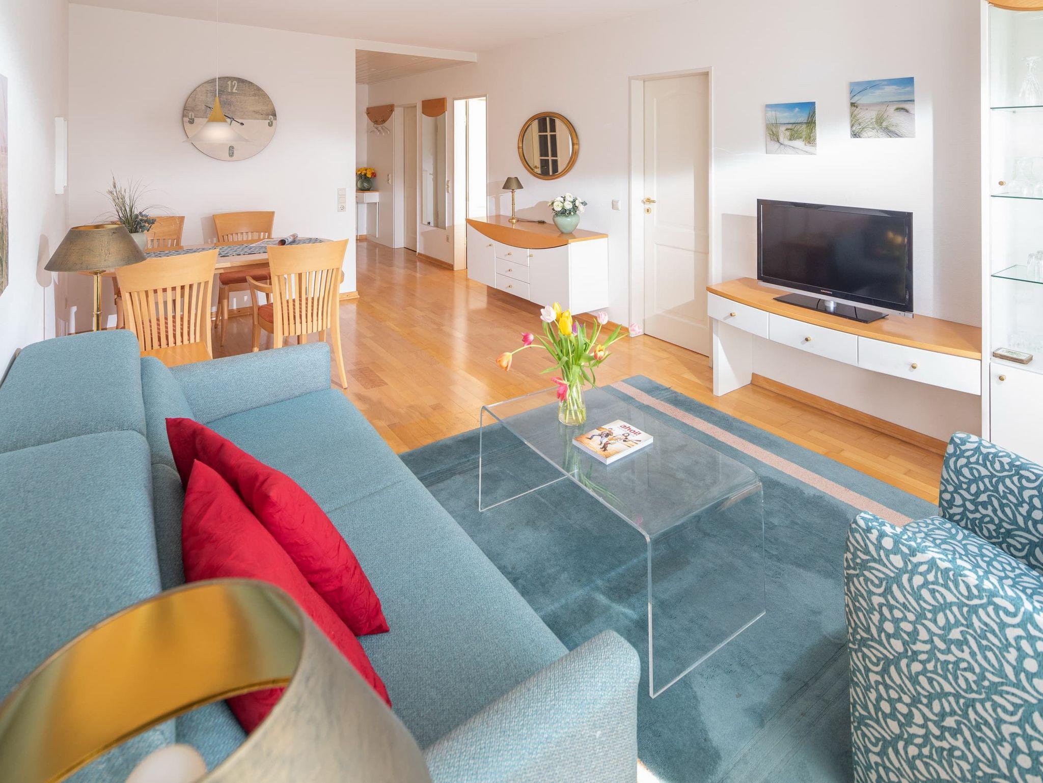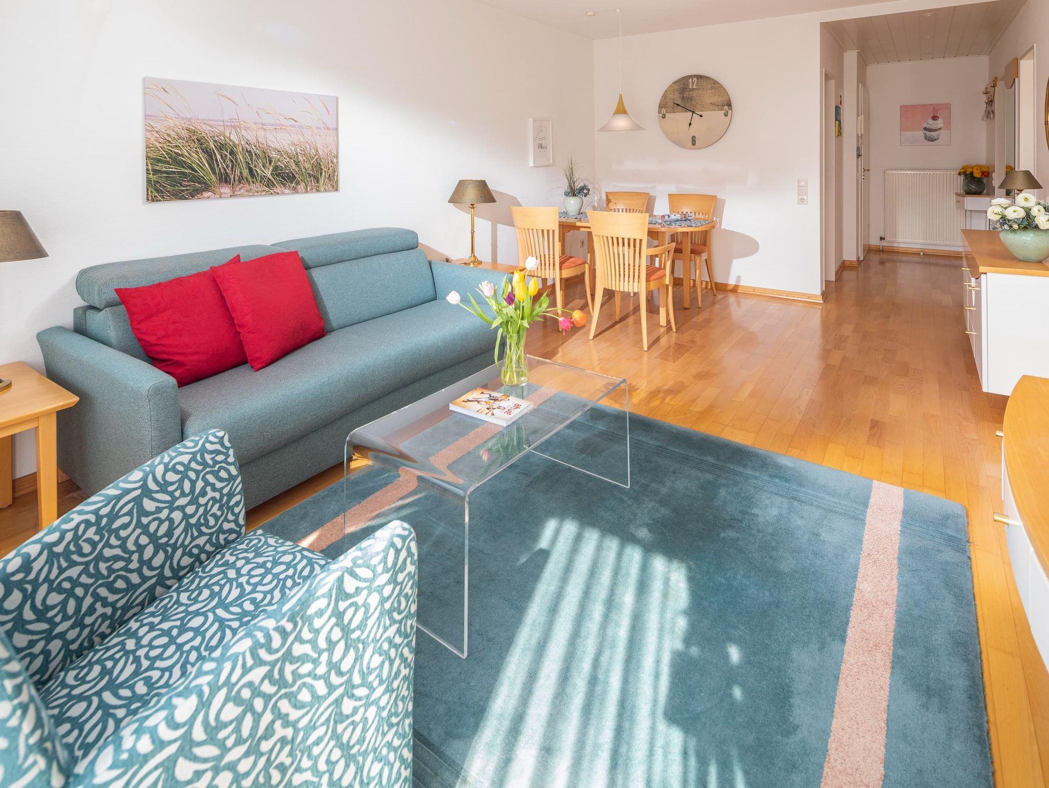 Die helle und freundliche Ferienwohnung verfügt über ein sehr geräumiges Wohnzimmer mit Esstisch und Couchgarnitur. Von dort aus betreten Sie auch den 11qm großen Südwestbalkon. Das Schlafzimmer verfügt über ein Doppelbett (180cm Breite) und hat ebenfalls Balkonzugang. Im Wohnzimmer befindet sich mit der Ausziehcouch eine alternative Schlafgelegenheit. Die Küche ist mit allen gängigen Geräten ausgestattet. Das weiß geflieste Duschbad ist hell und freundlich und geräumig.