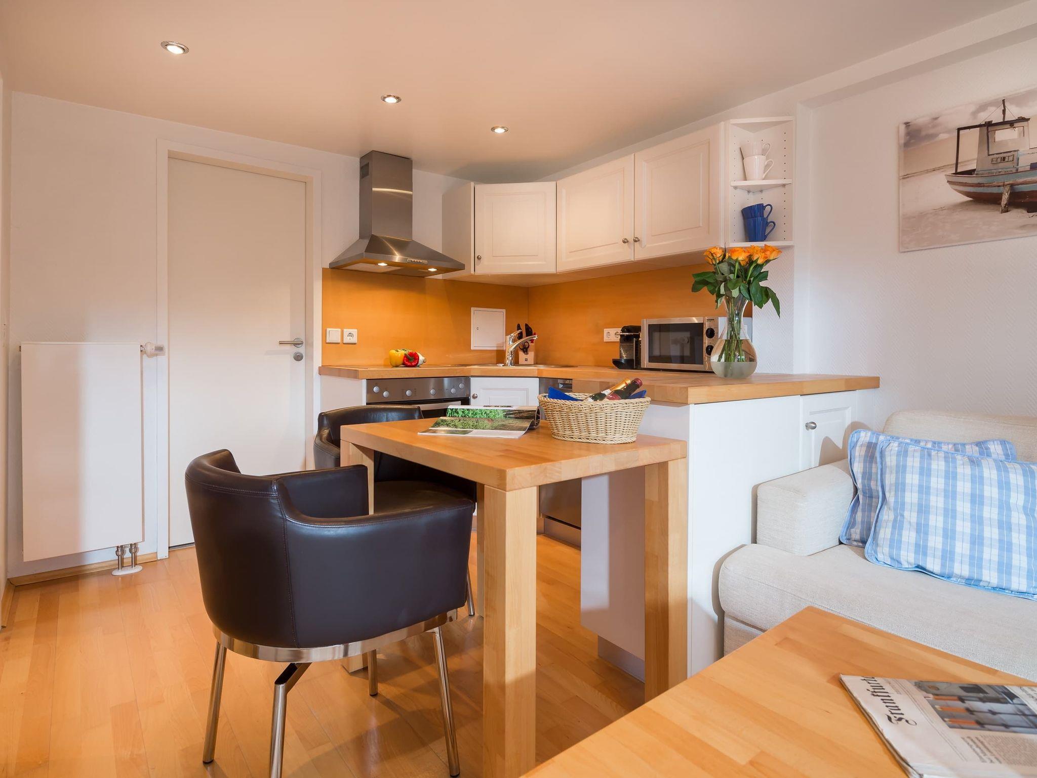Die Wohnung „Sonnendeck“ befindet sich im 01.OG und ist über eine Treppe durch den ruhigen Innenhof zu erreichen. Im Wohnbereich befindet sich neben der Küchenzeile ein Esstisch und eine gemütliche Sitzecke mit Fernseher und Zugang zum Balkon. Das separate Schlafzimmer hat ein 1,40m breites Doppelbett. Das weiß geflieste Duschbad ist freundlich und hell.
