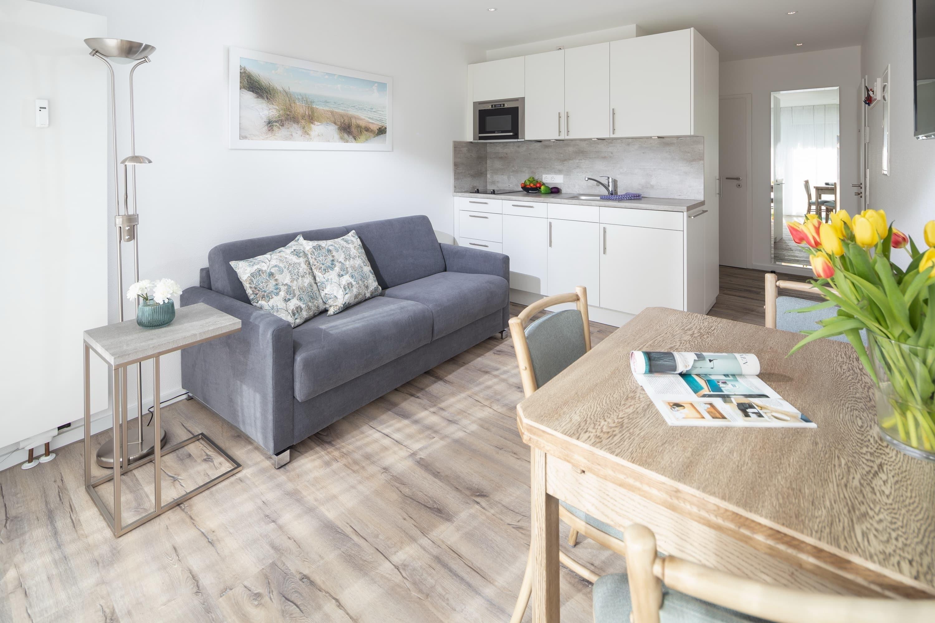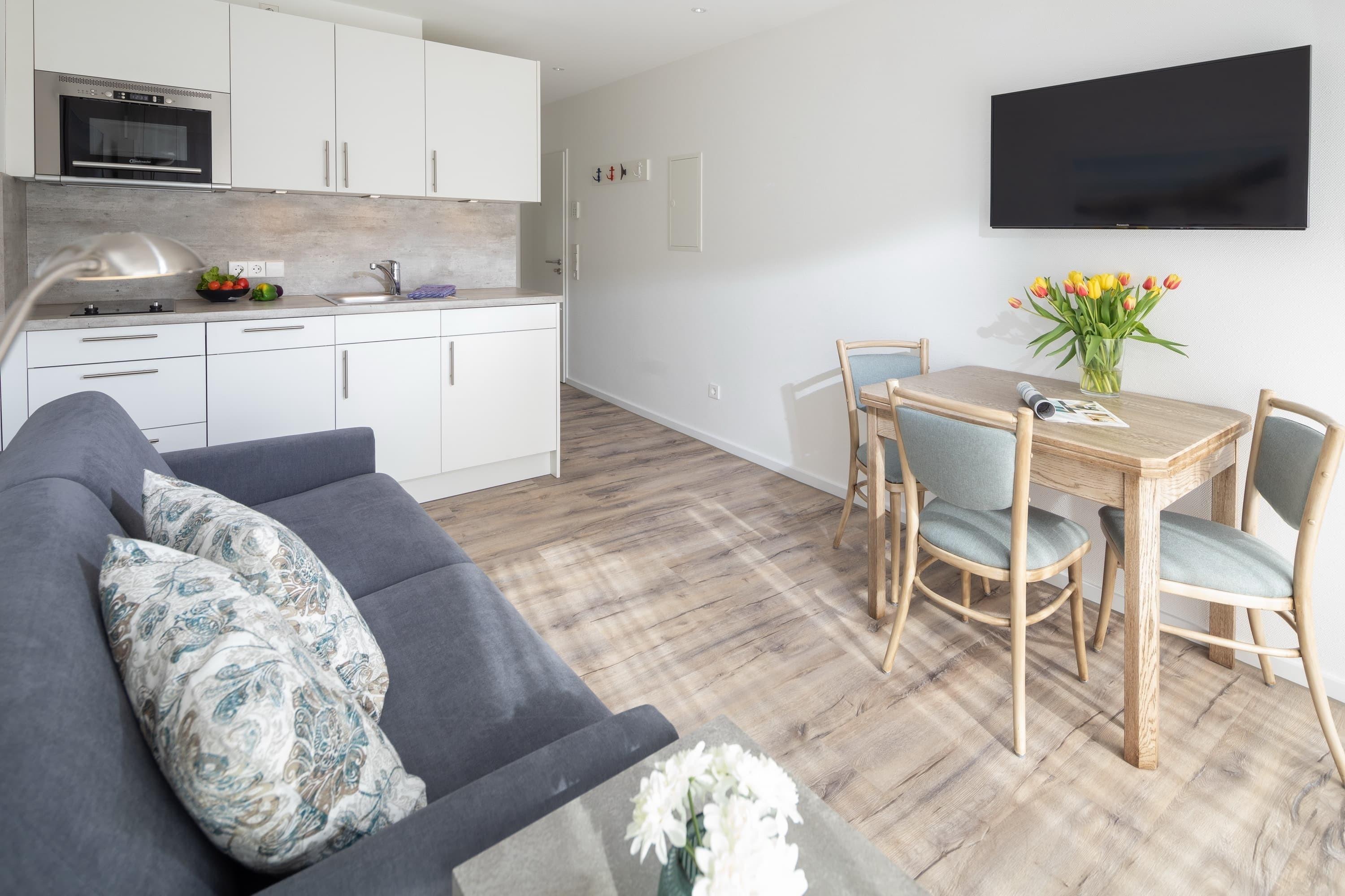 Modernes Apartment in Norderney mit Balkon, WLAN und voll ausgestatteter Küche, ideal für bis zu 3 Gäste.