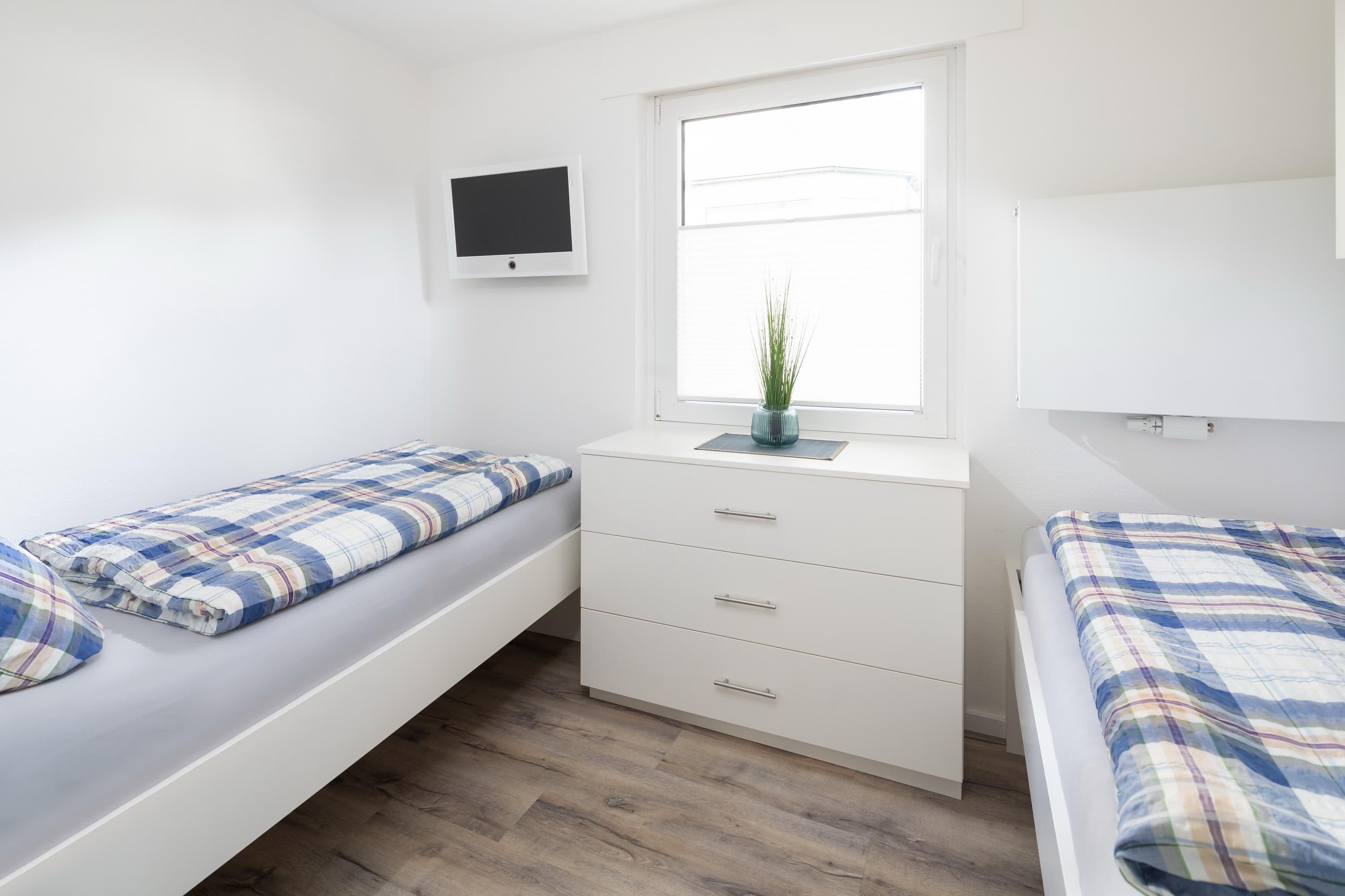 Das Apartment wurde im Frühjahr 2019 kernsaniert und komplett neu gestaltet. Es bietet Platz für 2-3 Personen. Neben einer gemütlichen Couch (zum alternativen Schlafplatz mit Lattenrost klappbar) und TV steht eine moderne und funktionale Küchenzeile zur Verfügung. Am Esstisch kann man gemeinsam essen und spielen. Das separate Schlafzimmer verfügt über 2 Einzelbetten (90cm breit). Das Duschbad ist weiß gefliest. Die Wohnung hat einen ruhigen und überdachten Balkon zur Hofseite.