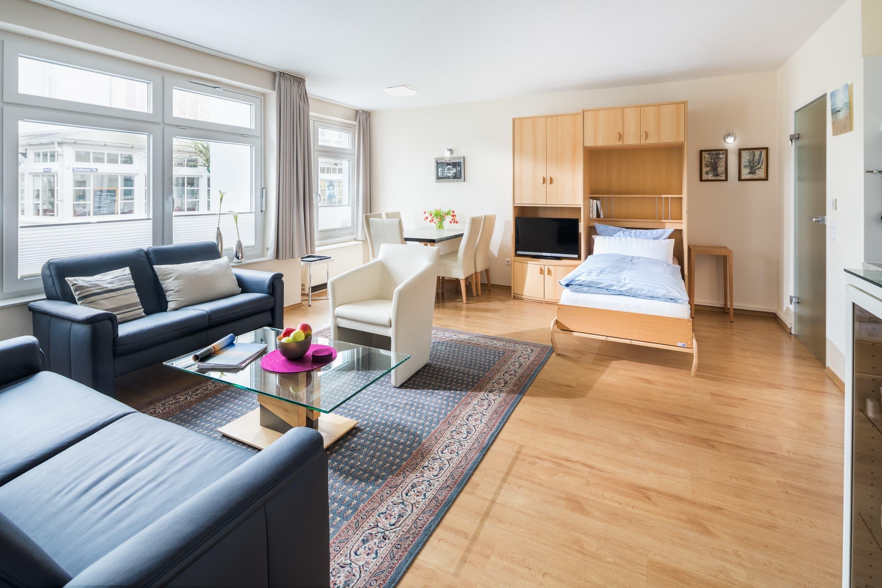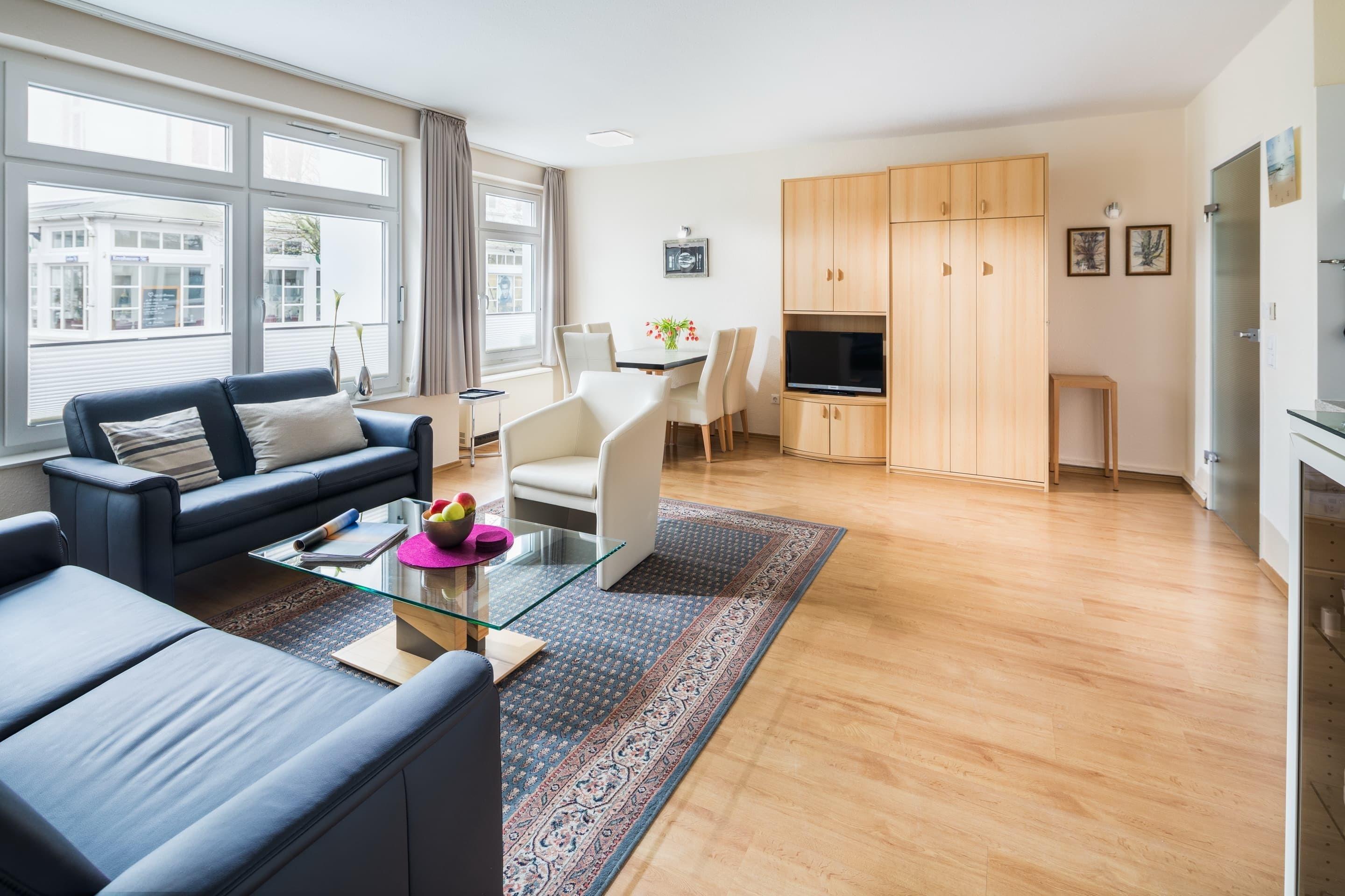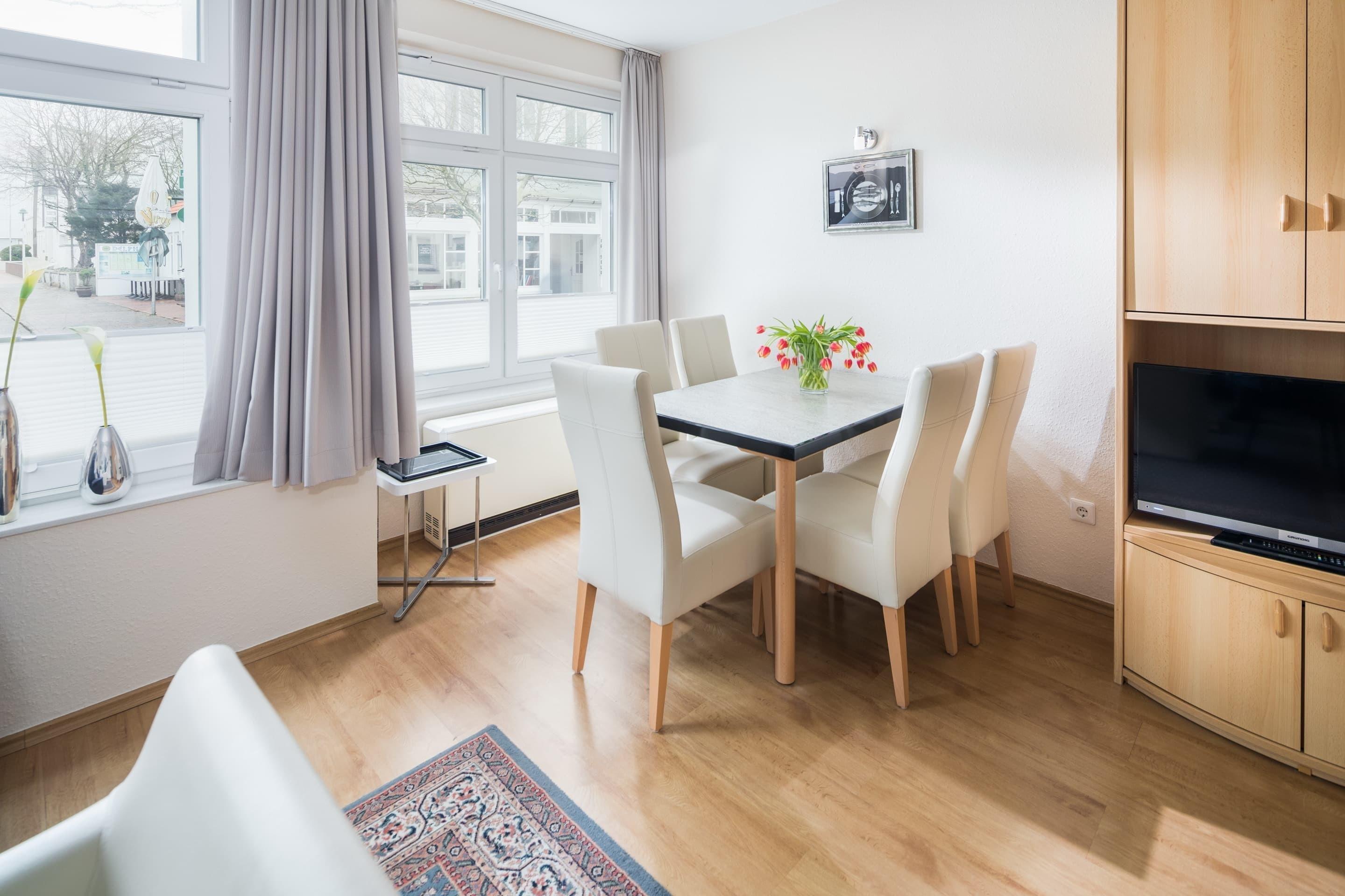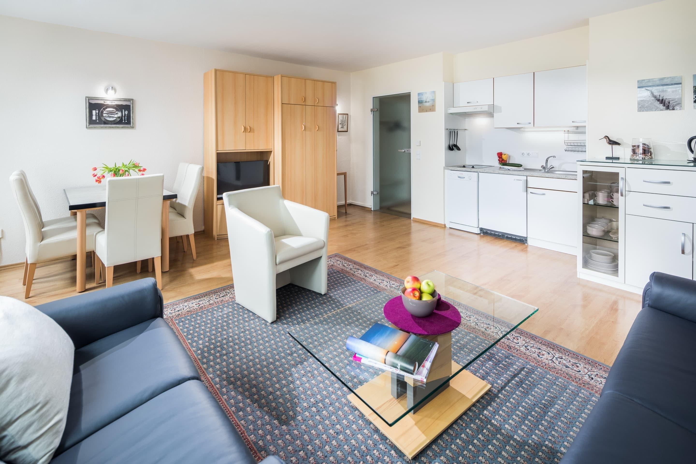Die Wohnung „Freesenpark“ hat eine Größe von 50qm. Sie liegt nur wenige Minuten Fußweg vom Strand entfernt. Ebenso nah ist der Weg in die Innenstadt mit zahlreichen Restaurants, Geschäften und Einkaufsmöglichkeiten. Das großzügige Wohnzimmer bietet eine Pantry-Küche, einen gemütlichen Essbereich und eine Sitzgruppe für entspannte Abende. Ein Flachbildschirm-Fernseher inkl. Radio sowie kostenfreies WLAN sorgen für die Unterhaltung. Im Wohnraum befindet sich eine alternative Schlafmöglichkeit für eine Einzelperson – als praktisches und raumsparendes Schrankbett.