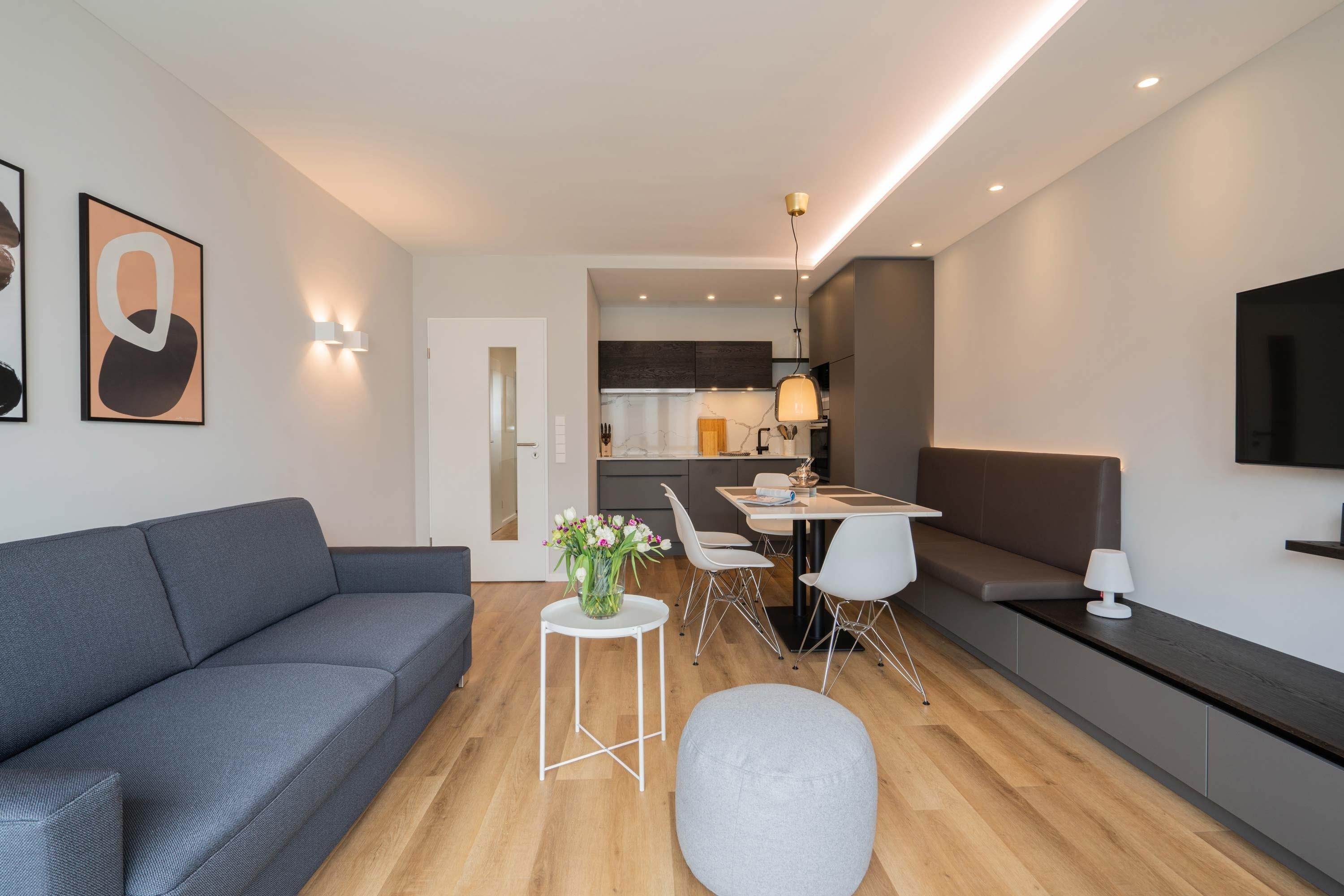 Der Wohn- und Essbereich bietet eine gemütliche Sofaecke (Ausziehcouch 160x200) mit Fernseher. Am geräumigen Essplatz lassen sich entspannte, gemeinsame Mahlzeiten geniessen. Die moderne, offene Küche ist umfangreich mit Spülmaschine, Backofen, Mikrowelle und Annehmlichkeiten wie u.a. einer Nespresso-Maschine ausgestattet. Vom Wohnraum gelangen Sie auf den Balkon mit Westausrichtung. Die Wohnung bietet Ihnen 2 separate Schlafzimmer, jeweils mit Doppelbett (180x200) und zusätzlichem TV ausgestattet. Das moderne Duschbad bietet Ihnen entspannten Komfort unter der Regendusche.