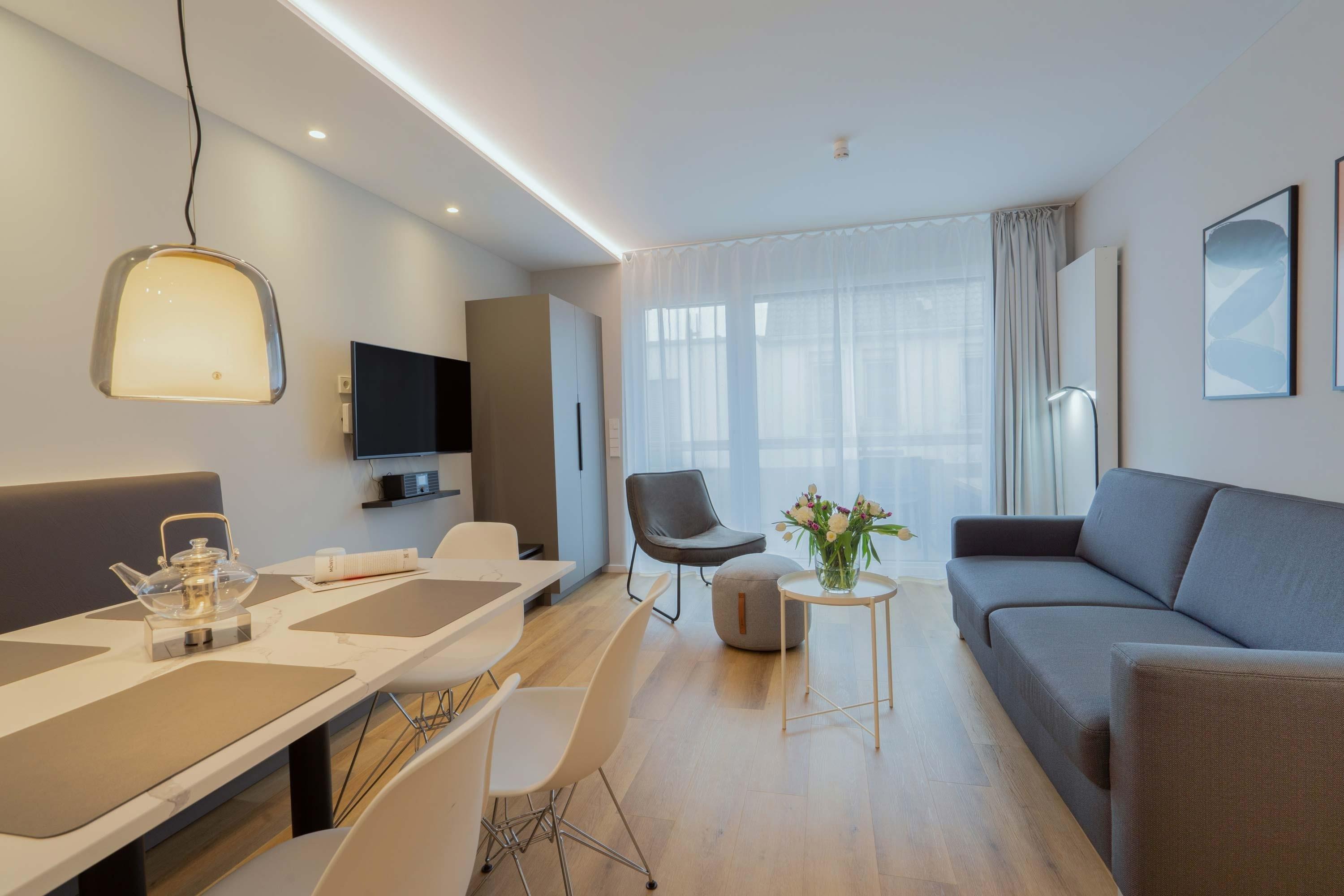 Moderne Ferienwohnung mit Balkon und offener Küche in Norderney, ideal für erholsame Tage am Meer.
