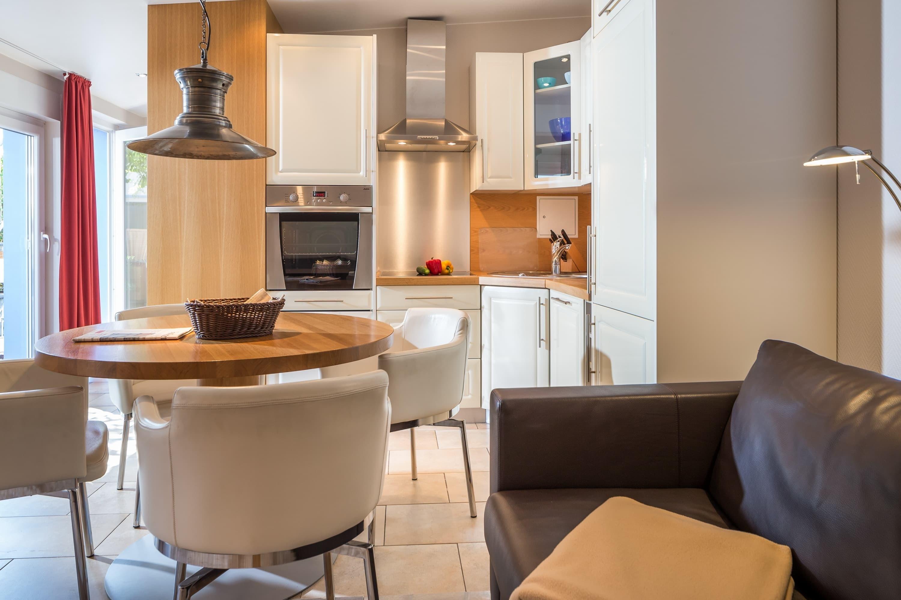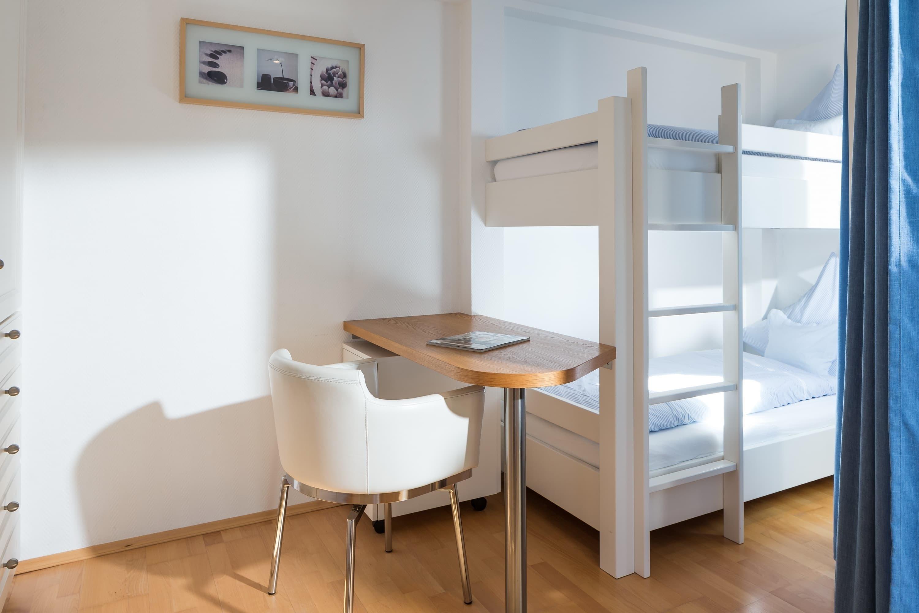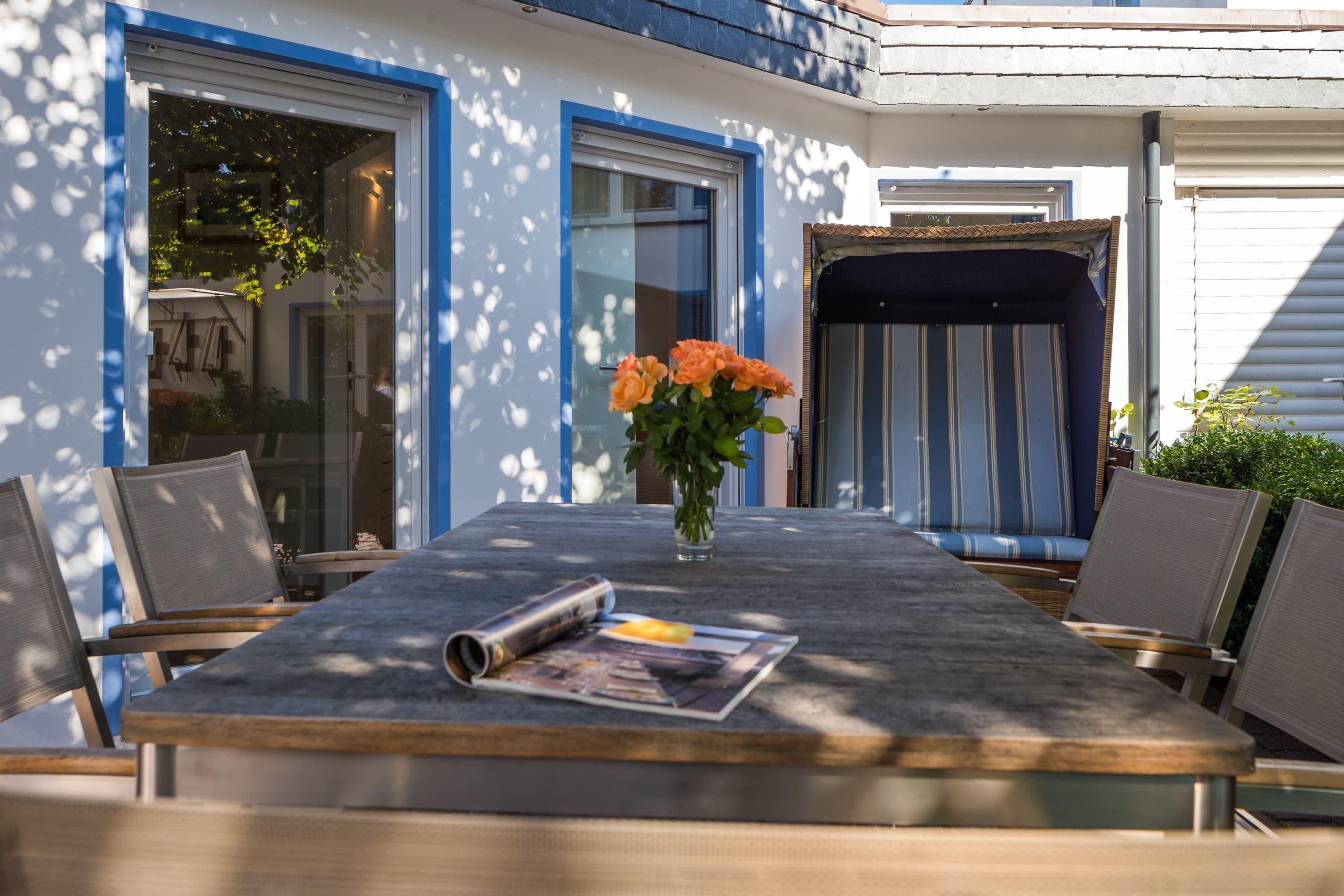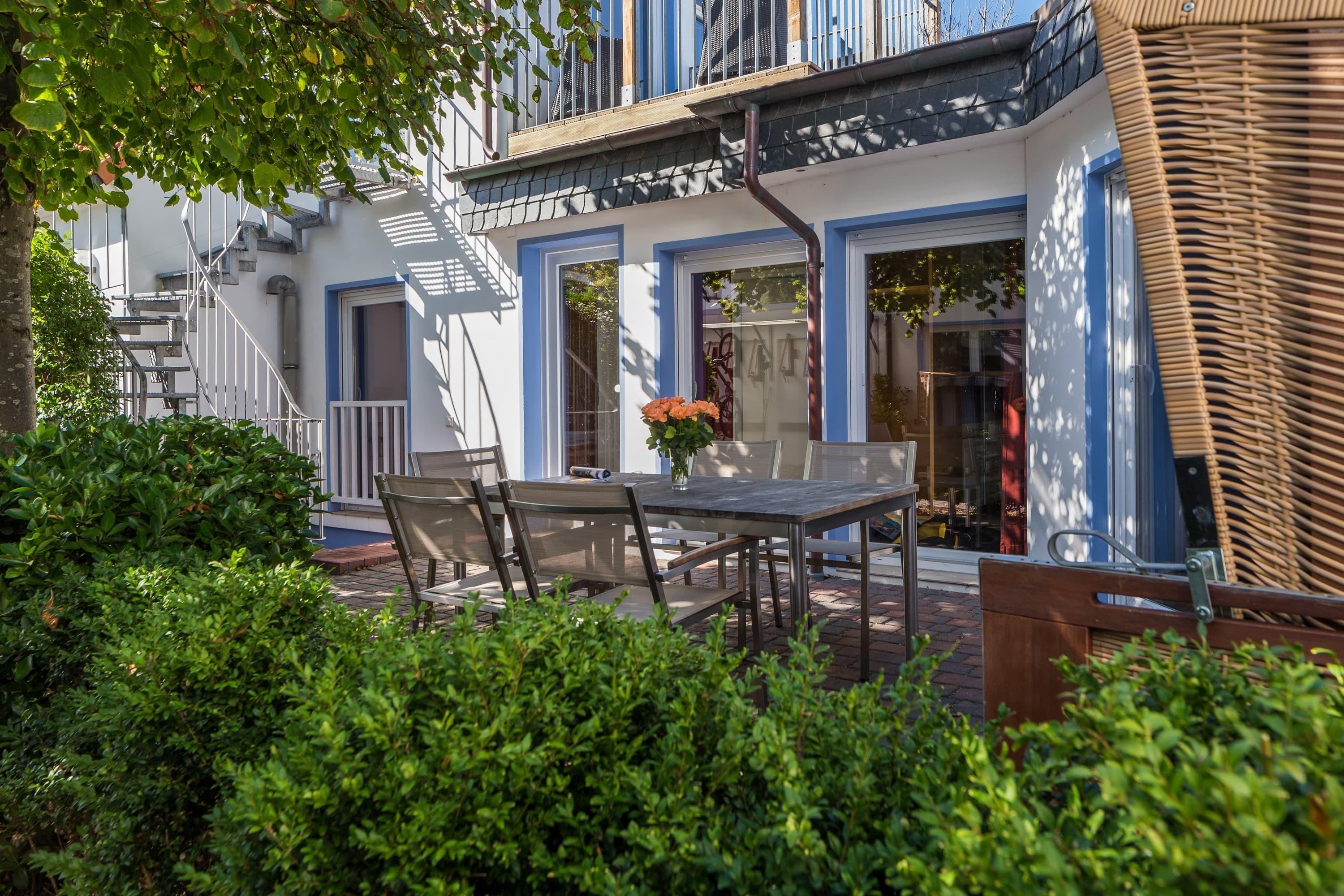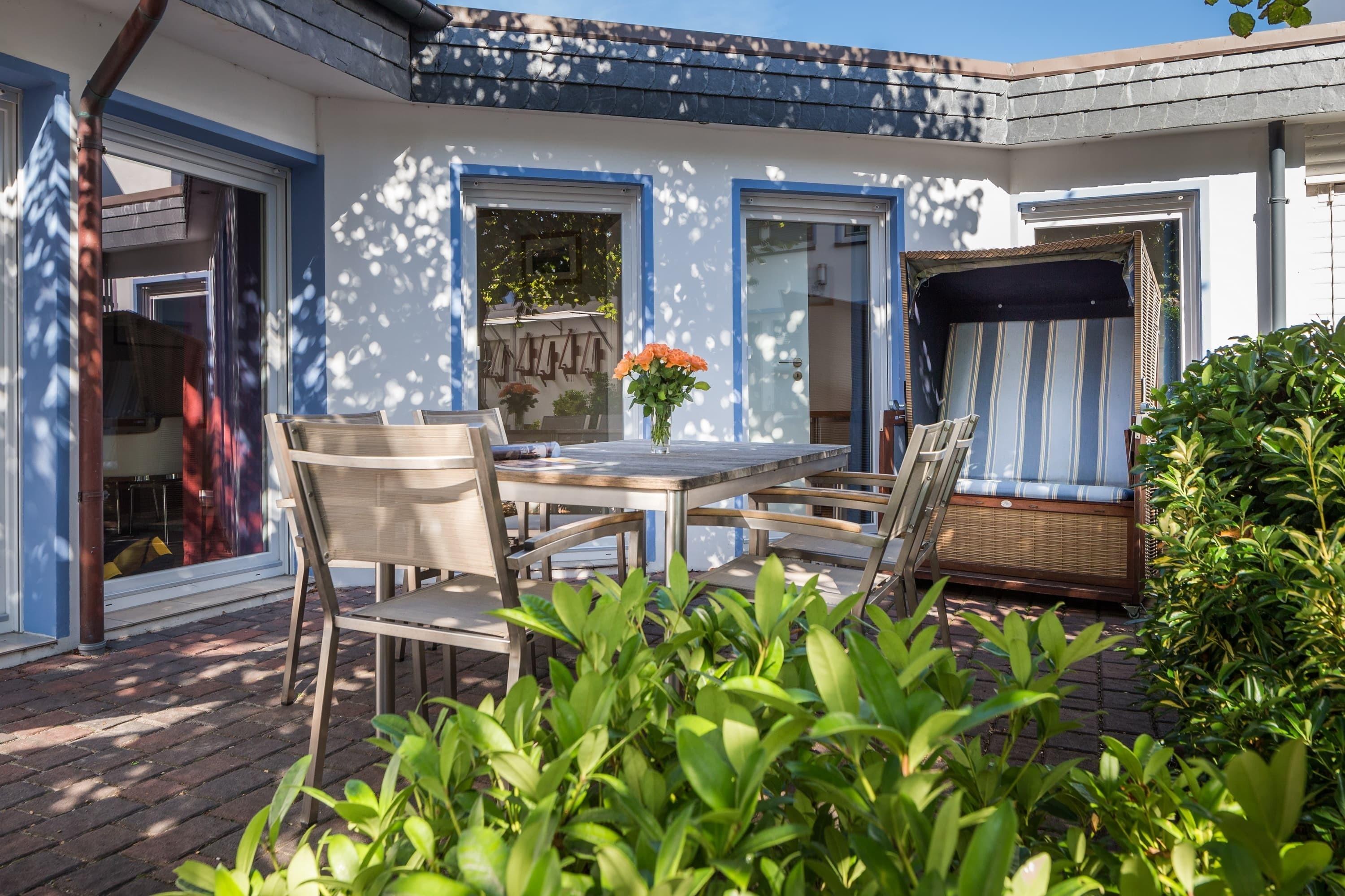 Eines der Schlafzimmer ist ausgestattet mit einem Doppelbett, das andere mit einem komfortablen Etagenbett. Im gemütlichen Wohnbereich mit Sofa können Sie nach einem ausgiebigem Strand-Spaziergang entspannen. Der lichtdurchflutete Wohn- und Essbereich bietet Zugang zur Terrasse mit Strandkorb im ruhigen Innenhof. Das Badezimmer bietet neben einer Dusche auch eine Badewanne.