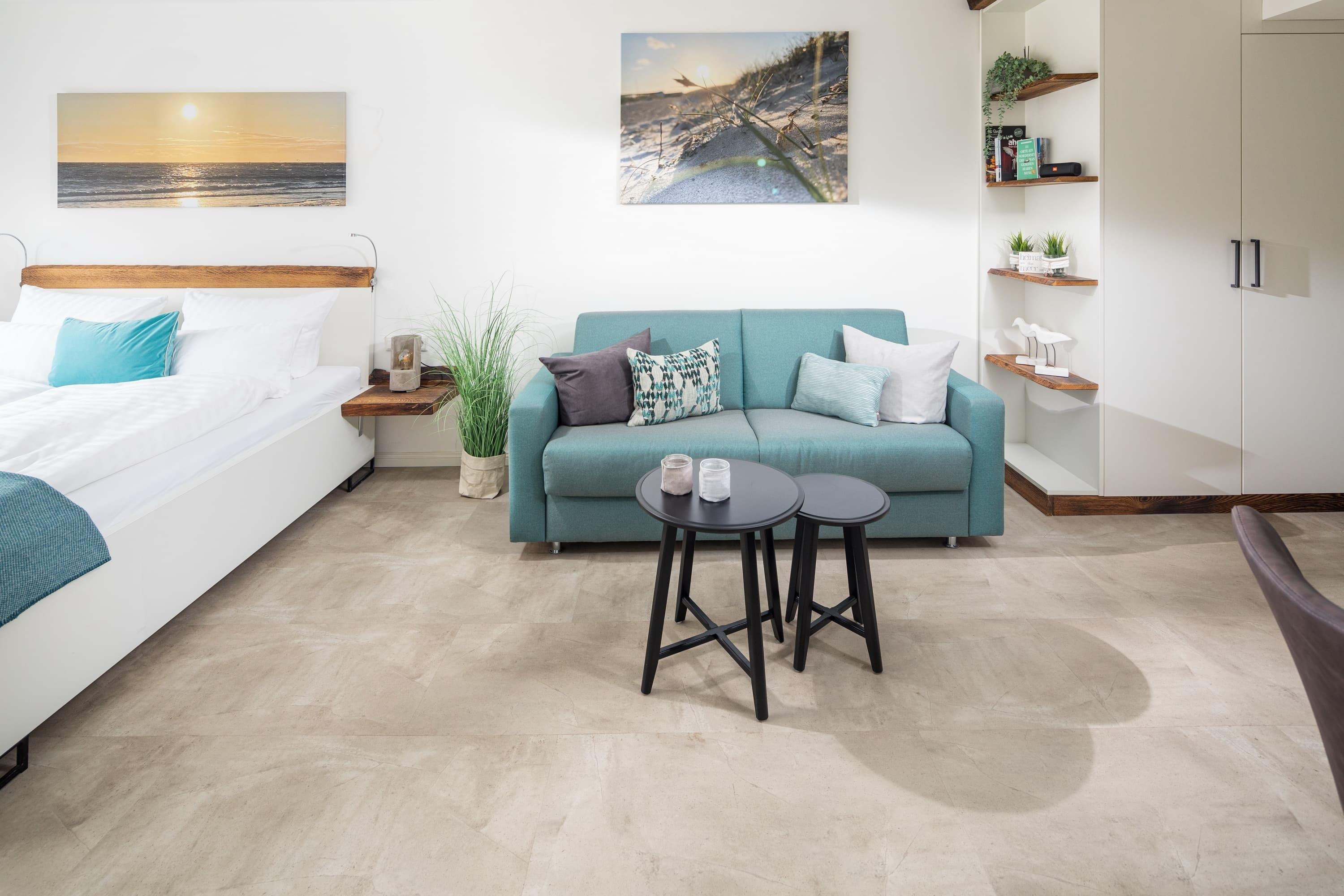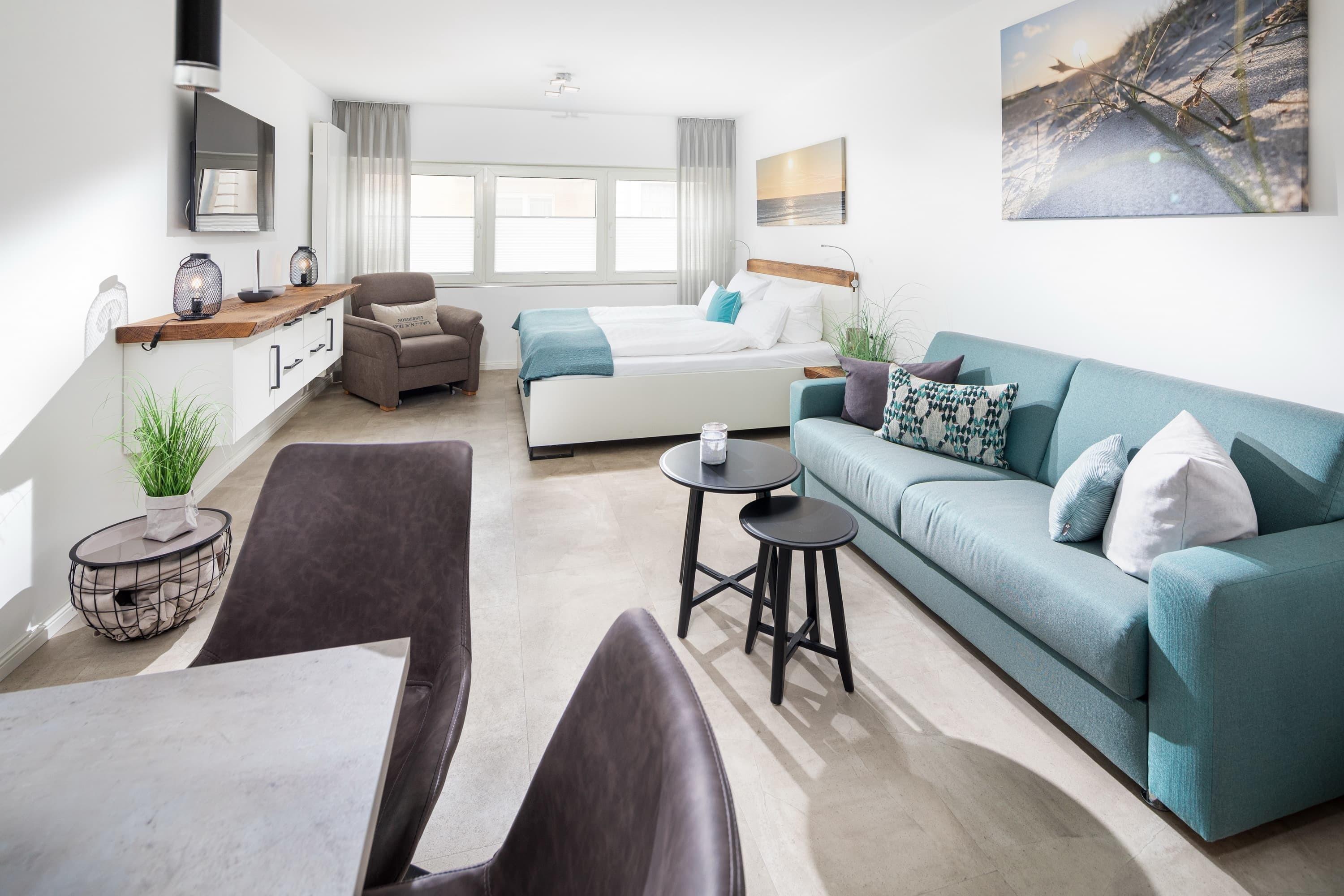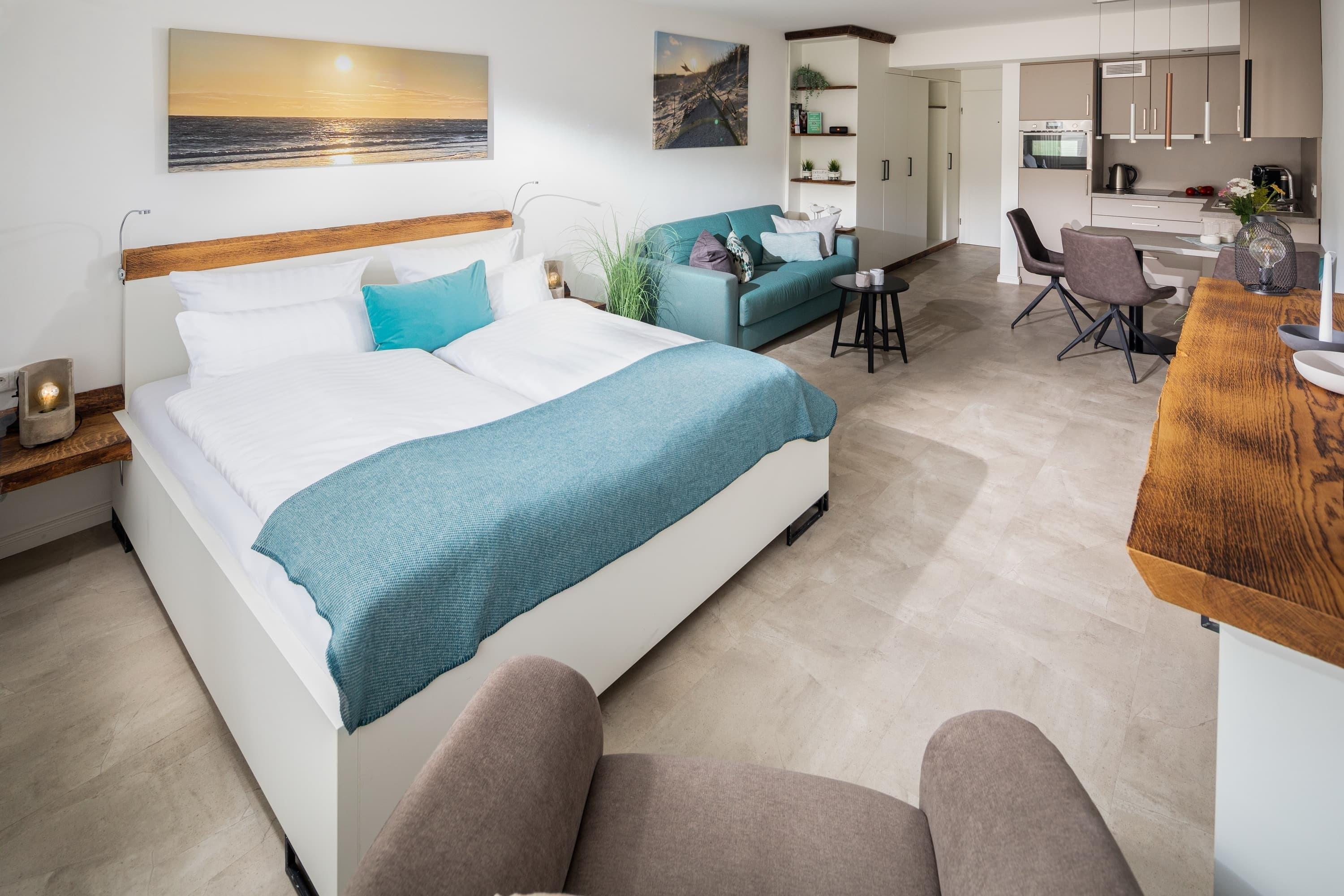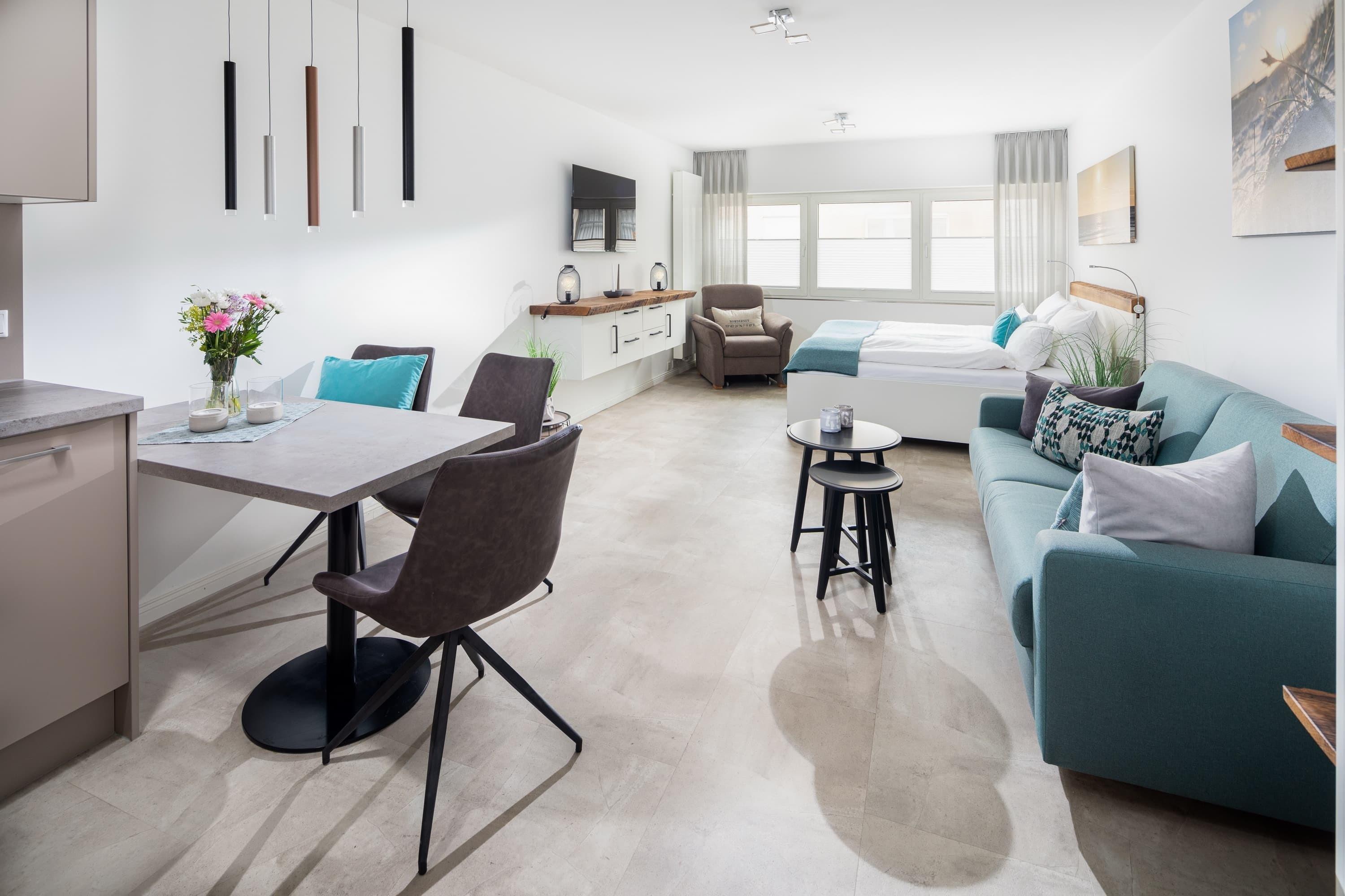 Die „Lüttje Ney“ heißt Sie schon beim Eintreten herzlich willkommen. Die 40 qm große Whg wurde 2020 hochwertig und liebevoll saniert. Sie bietet einen modernen und gemütlichen Wohn-und Schlafraum mit einem 1,80m großen Bett und zwei 155 x 220m großen Bettdecken und insgesamt 4 Kopfkissen zum Wohlfühlen. Ein gemütlicher Relaxsessel mit ausziehbarer Fußstütze und ein bequemes Sofa laden zum Lesen oder Fernsehen (Smart-TV) ein.