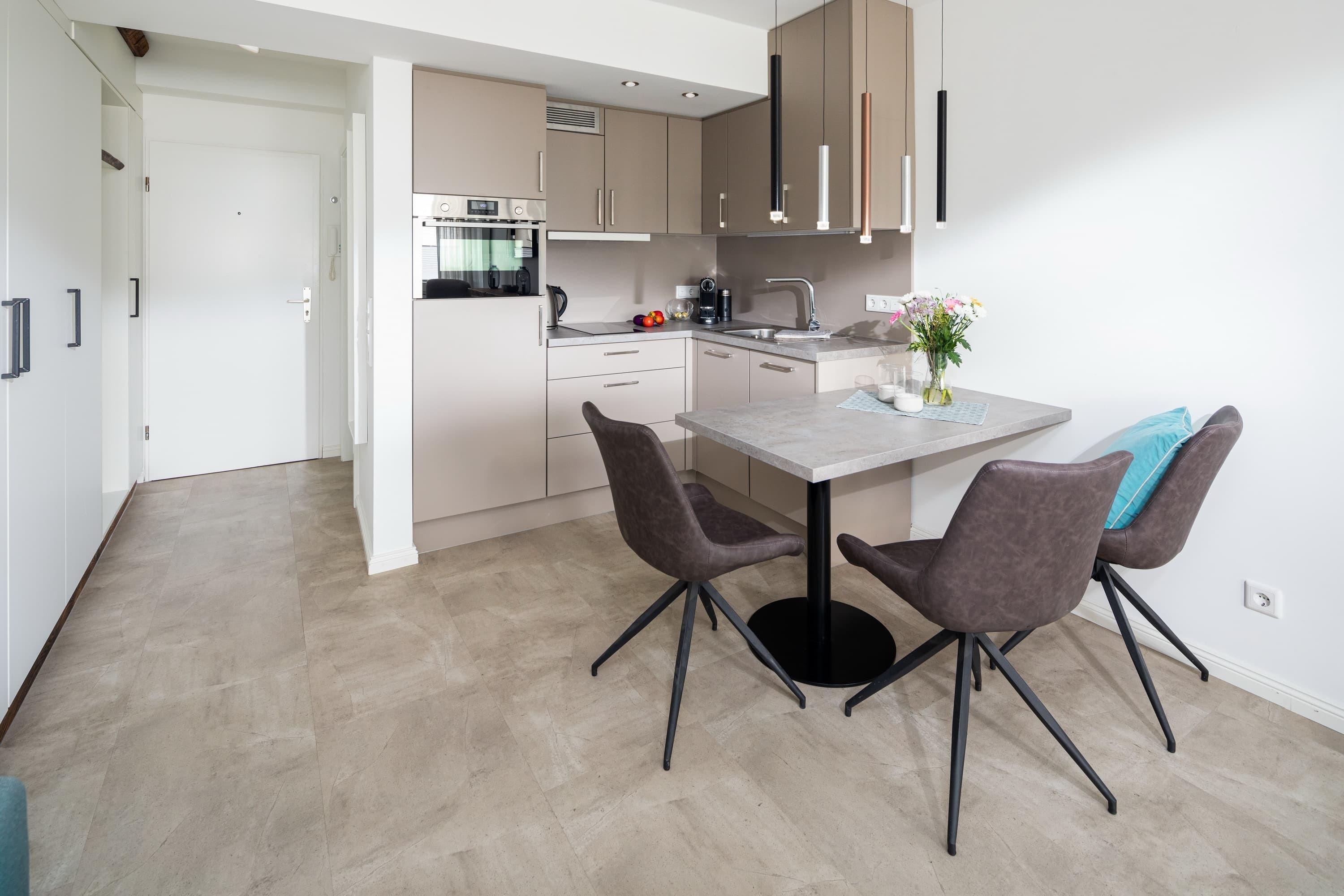 Es erwartet Sie eine charmante, moderne Einbauküche, in der Sie bei Ankunft einen aromatischen Kaffee aus der Nespressomaschine (inkl. Milchaufschäumer) aufbrühen können. Der Esstisch bietet Platz für 2-4 Personen. Im Flur erwartet Sie ein großzügiger Kleiderschrank. Im modernen Bad spiegelt sich die Gemütlichkeit des Wohnraumes wider, es ist mit einer bodentiefen und großzügigen Dusche und mit schönem Lichtambiente ausgestattet. Nicht zu Hause, aber doch daheim!