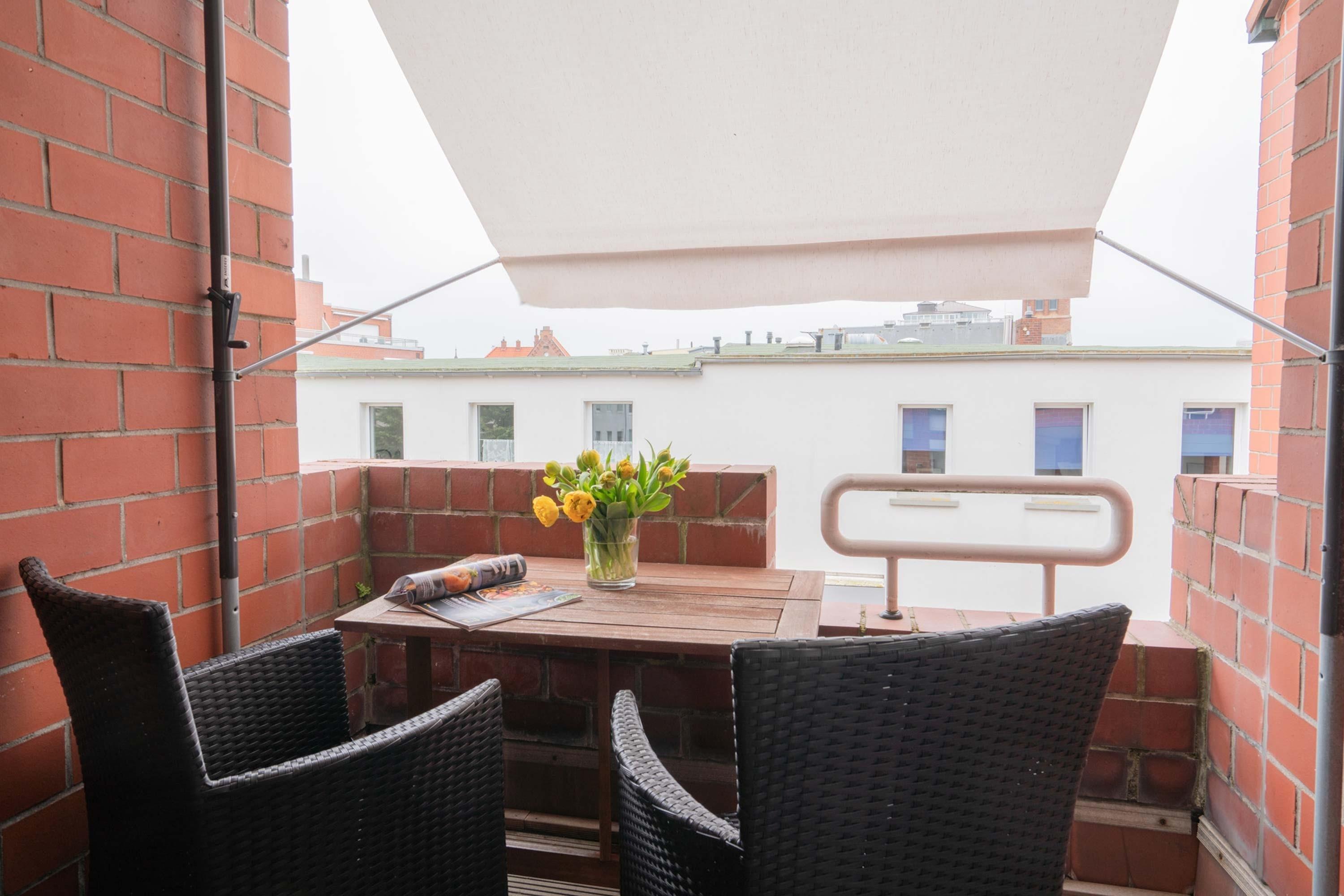 Der kleine, windgeschützte Balkon bietet einen schönen Ausblick auf die Dächer Norderneys und die Inselkirche.