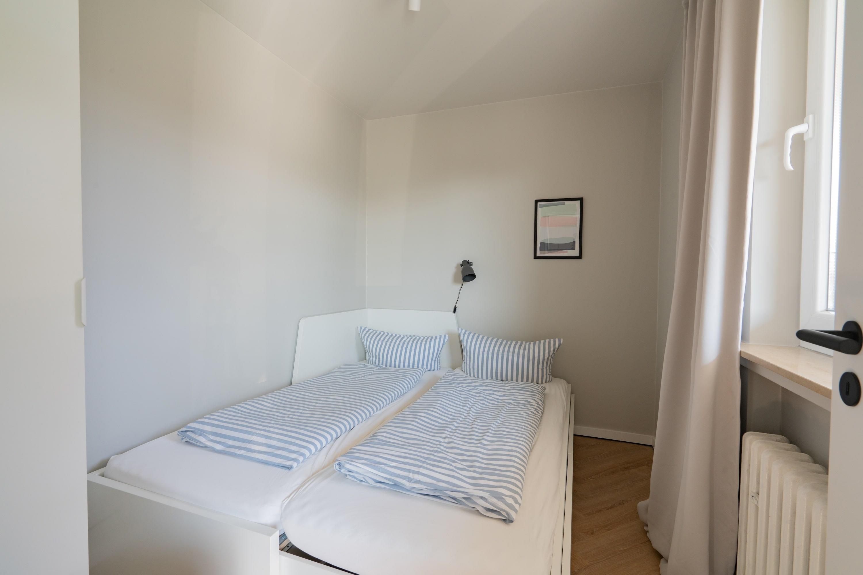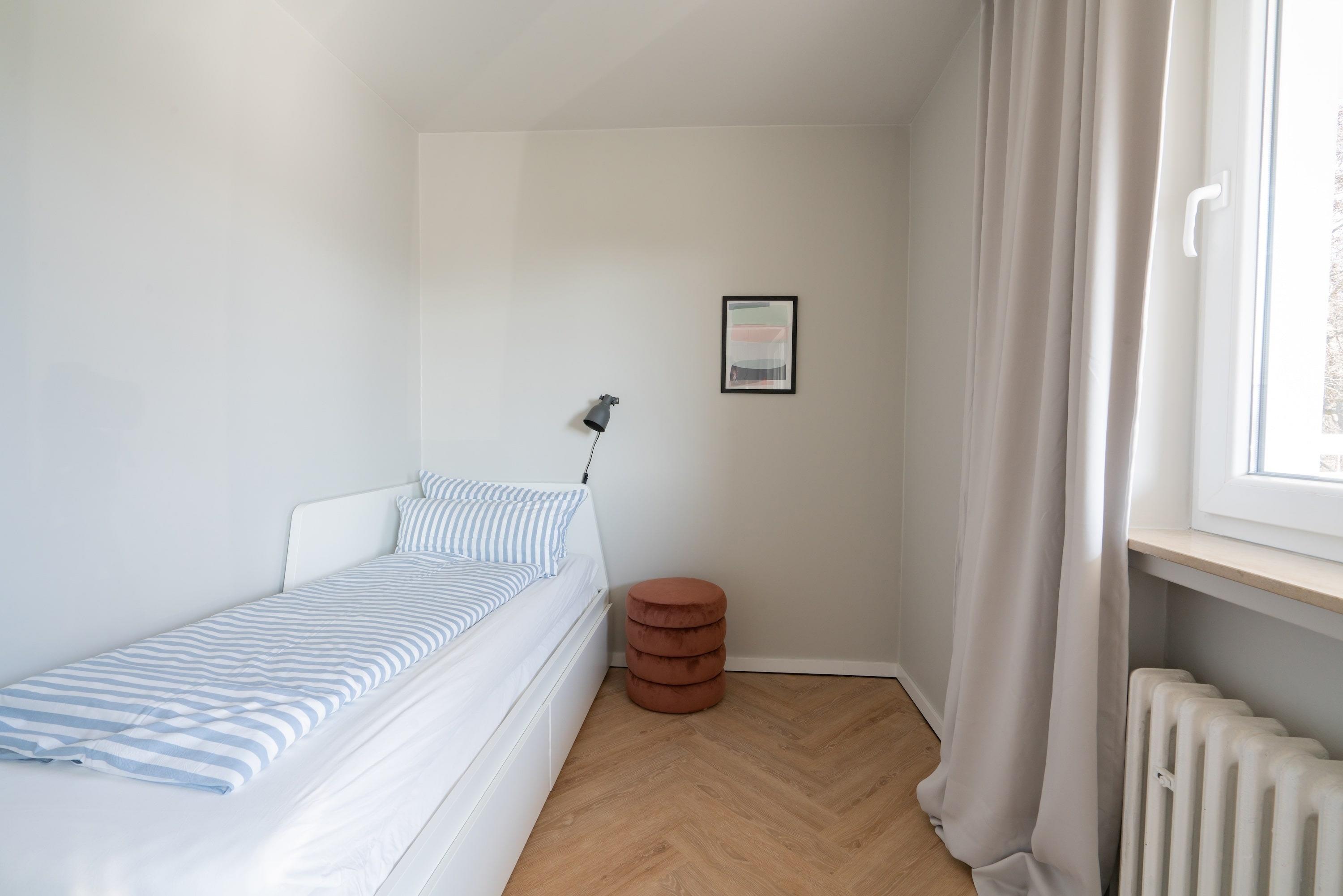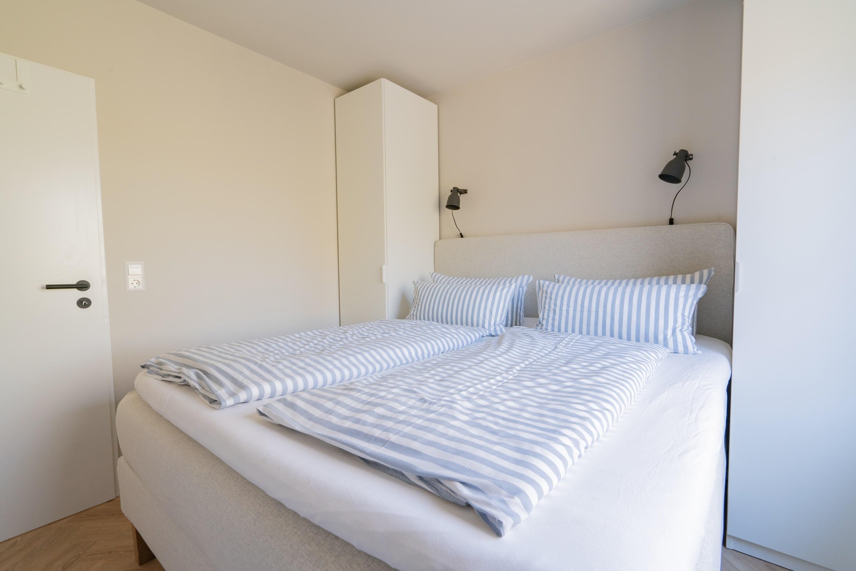 Die Wohnung bietet zwei Schlafzimmer: eines mit hochwertigem 1,80 m breitem Boxspringbett, das andere multifunktional – tagsüber ein Spielzimmer, abends verwandelt sich das Einzelbett in ein komfortables 1,60 m breites Doppelbett. Ideal für Familien mit Kindern!