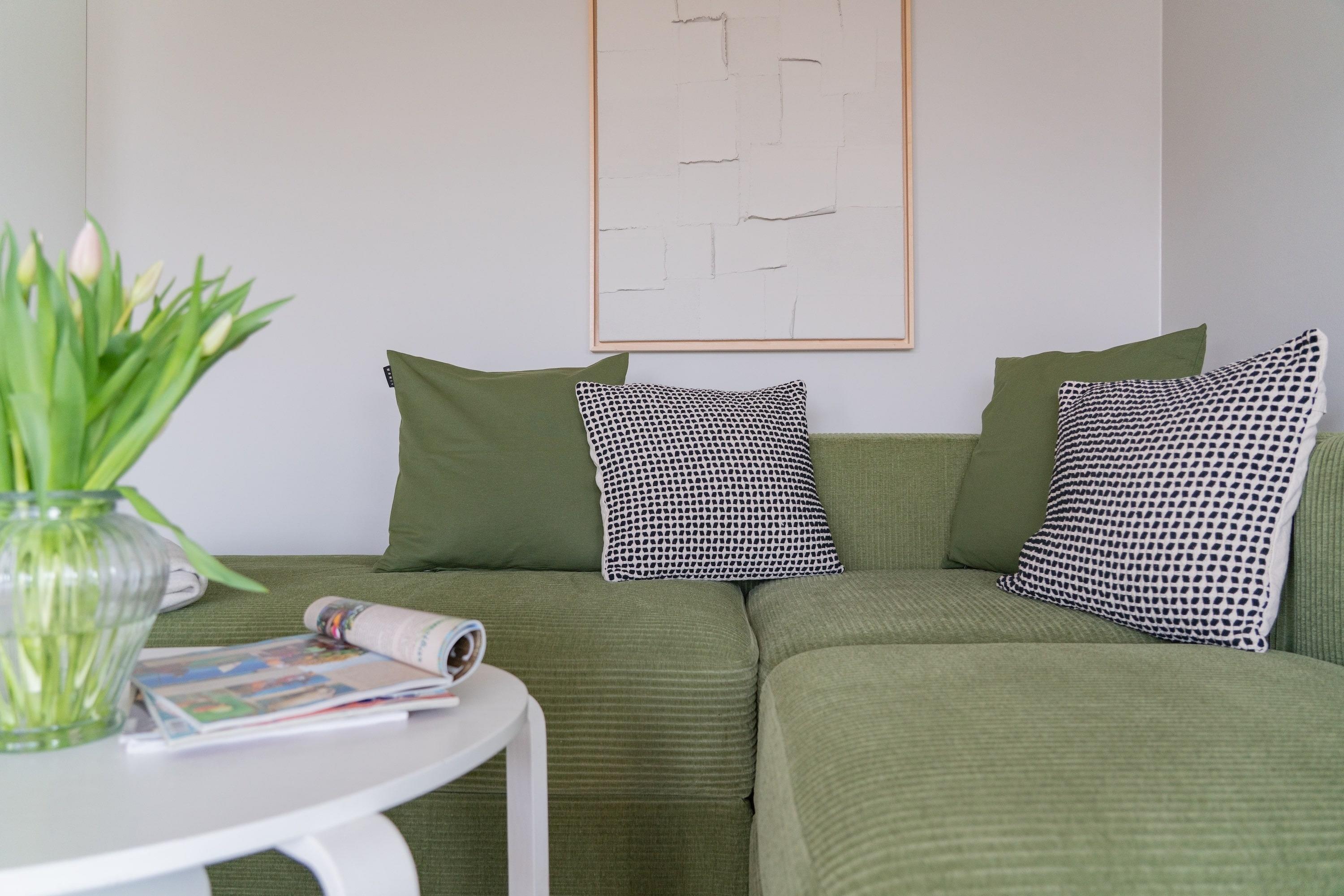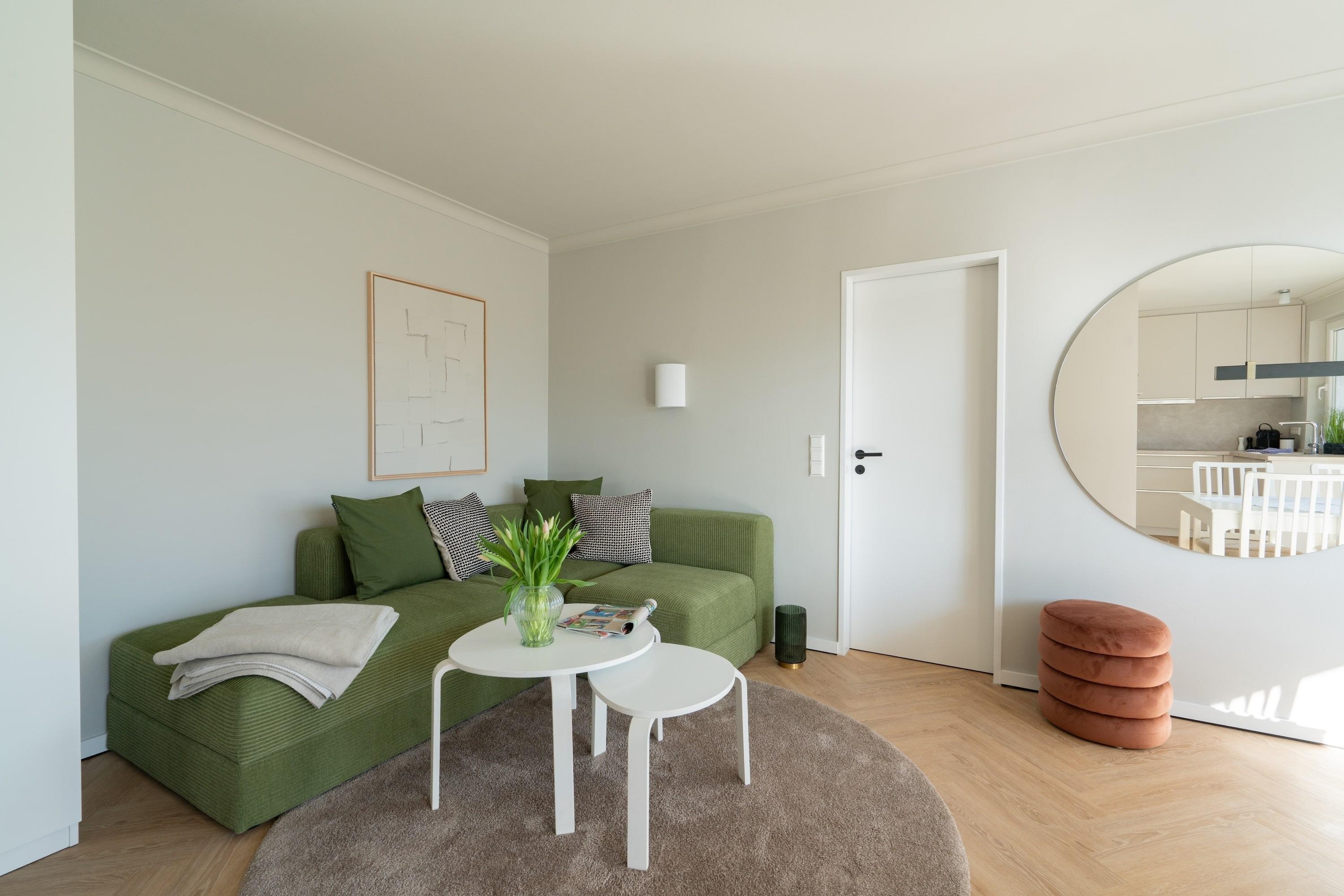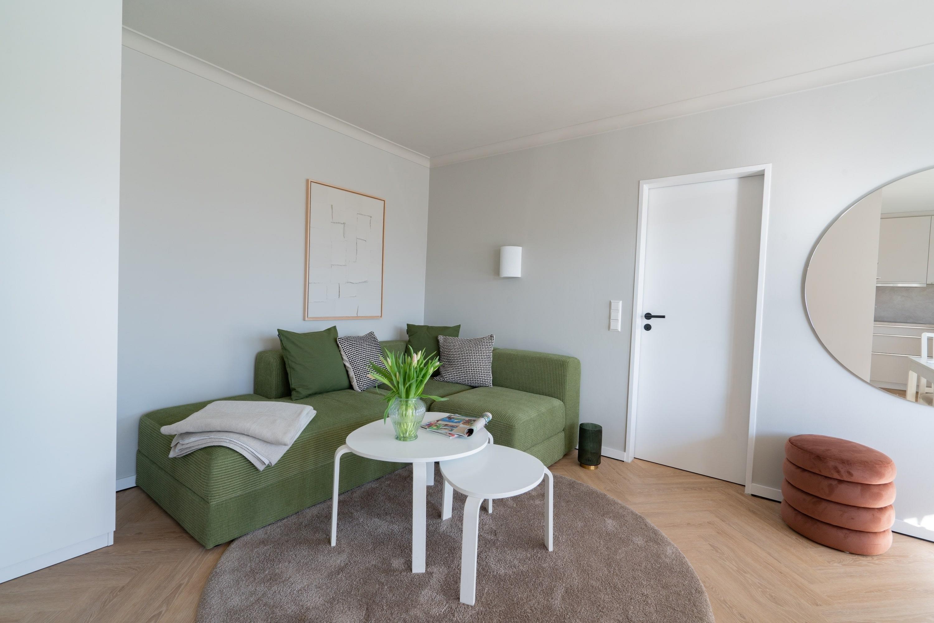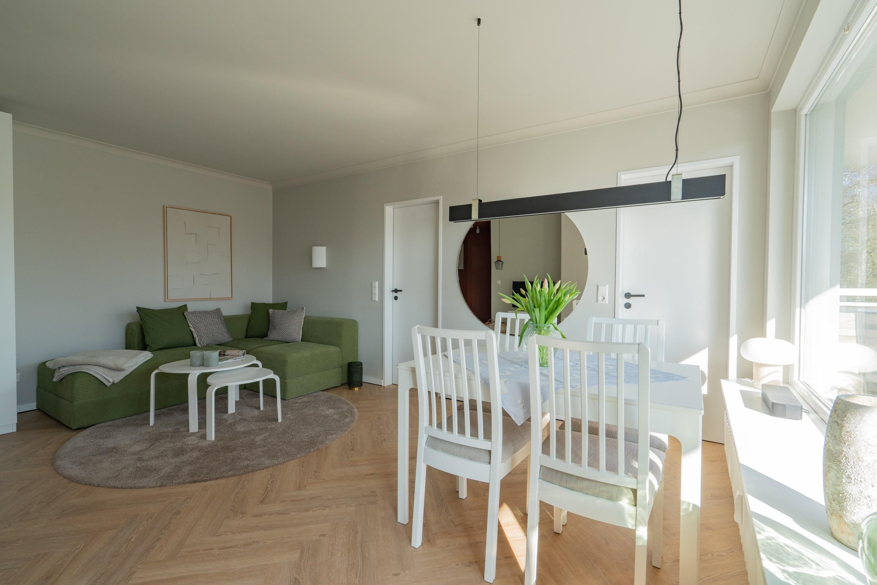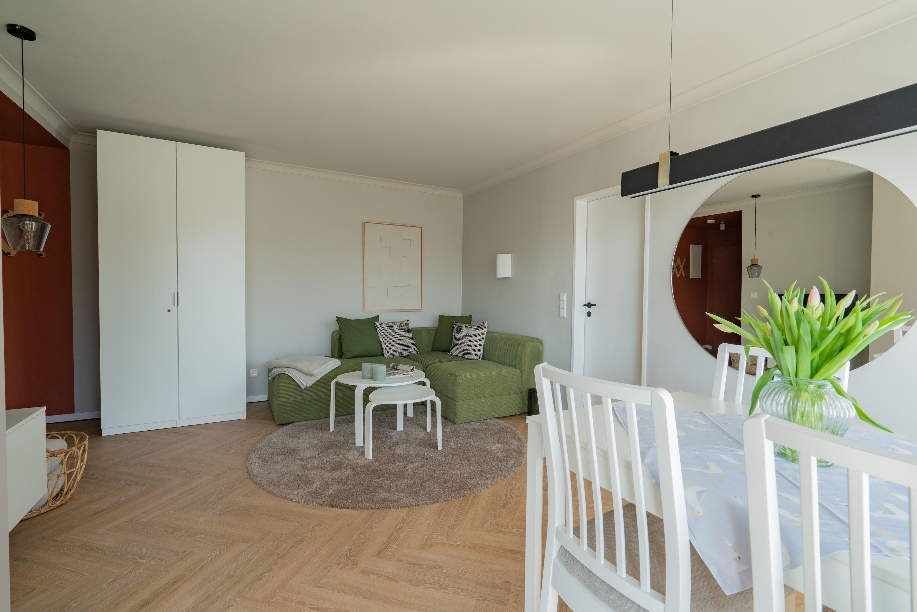 Der helle Wohnbereich mit großer Fensterfront öffnet den Blick ins Grüne und schafft eine behagliche Atmosphäre. Die offene Küche mit Spülmaschine und Backofen sowie der angrenzende Esstisch laden zu entspannten Kochabenden ein. Auf der gemütlichen Eckcouch lassen sich Filmabende und Spiele in bester Gesellschaft genießen. Und das Highlight: Der großzügige Sonnenbalkon mit Blick in den Park – Ihr Lieblingsplatz für Kaffee am Morgen oder ein Glas Wein am Abend.