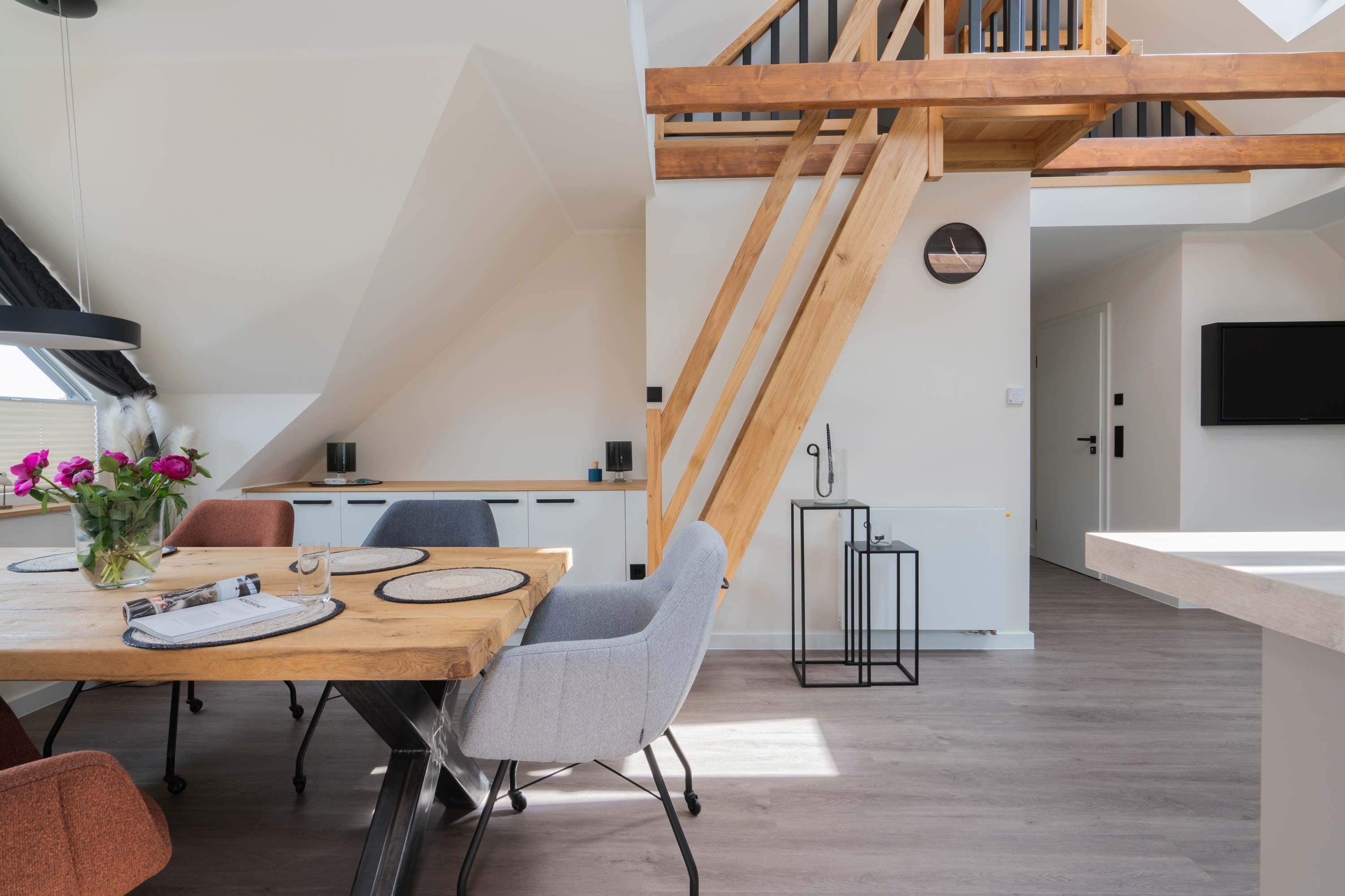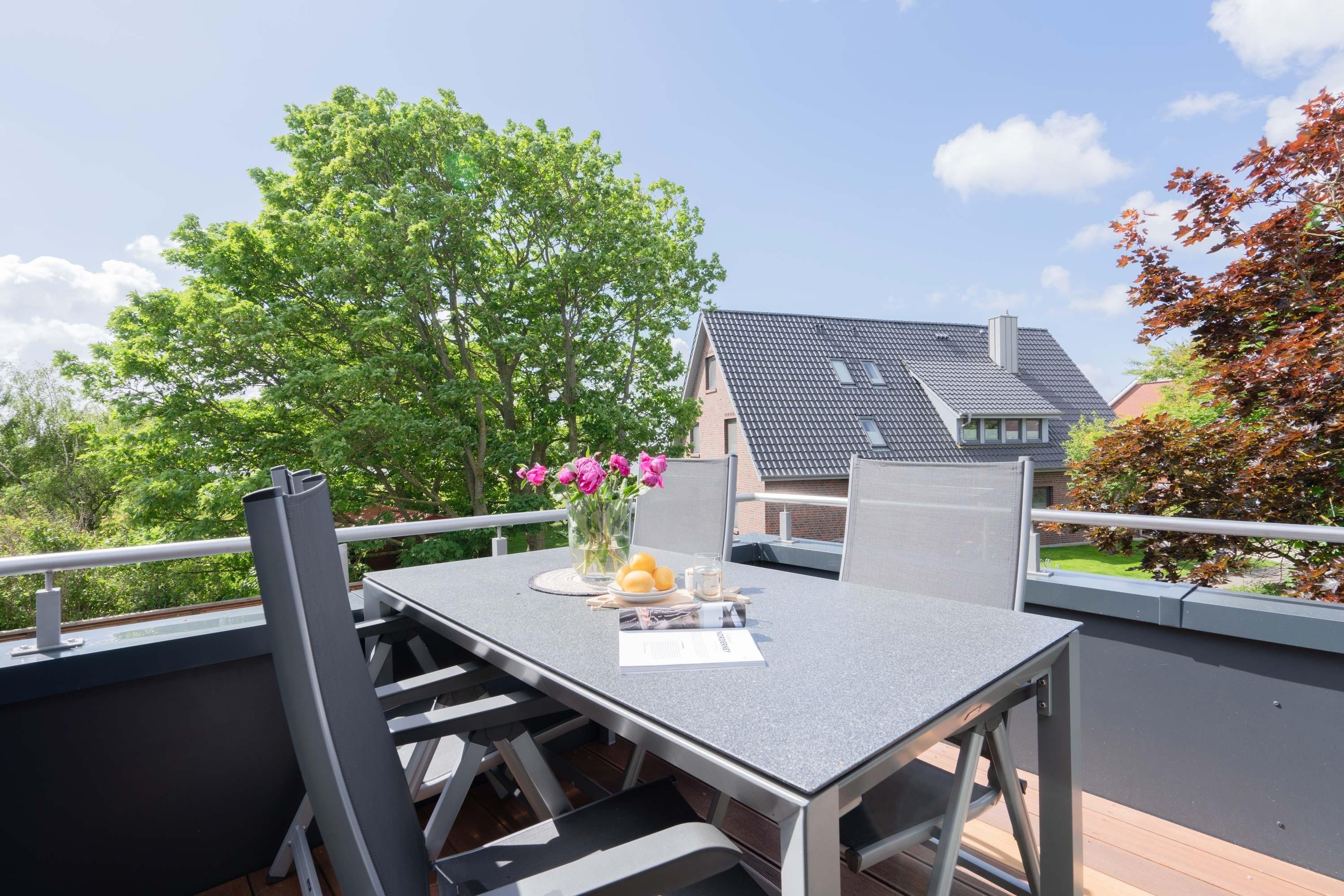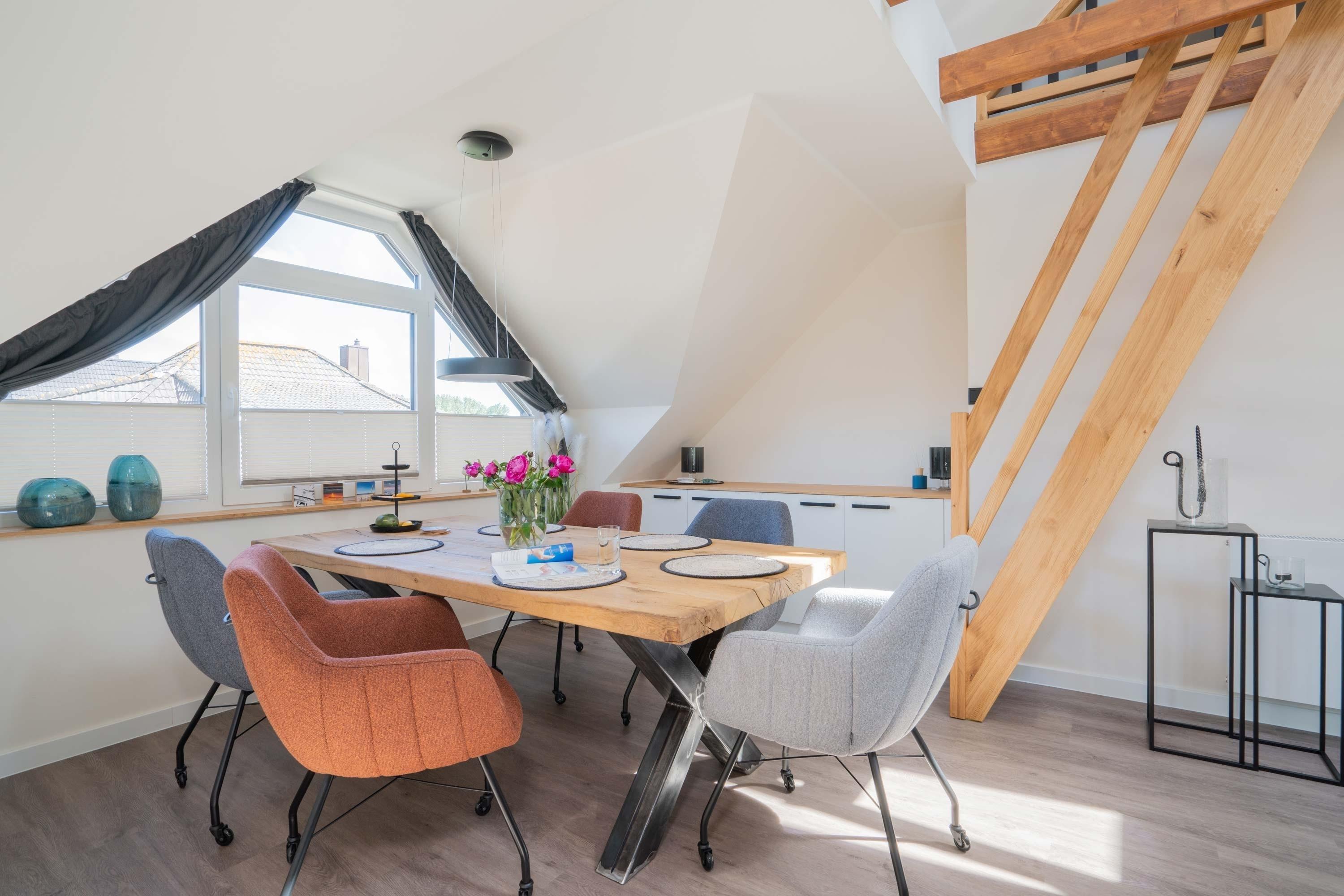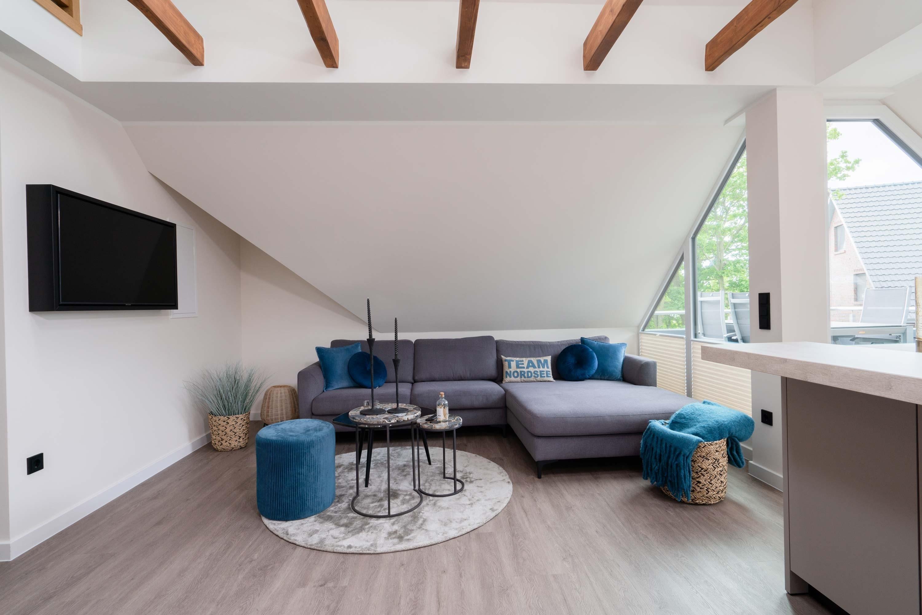 Die 70qm große Ferienwohnung "Neywatt 2“ wurde 2022 komplett neugestaltet. Sie liegt ruhig und grün im Fischerhafen, nahe der Surferbucht. Vom Balkon aus haben Sie einen schönen Blick ins Grüne und auf das Wattenmeer. Im Wohnbereich besticht die Wohnung mit ihrer Großzügigkeit und einer sehr geräumigen Wohnküche. An der gut ausgestatteten Kochinsel können köstliche Mahlzeiten zubereitet werden und dort direkt gemeinsam genossen werden. Entspannung danach bietet die liebevoll gestaltete, gemütliche Sofaecke. Die zwei großzügigen Schlafräume sind jeweils mit einem Doppelbett (180cm [&] 140cm) und TV ausgestattet. Einen zusätzlichen Schlafplatz für eine weitere Person gibt es im Giebel des Wohnraums. Das Duschbad bietet neben der Regendusche eine eigene Waschmaschine (kostenpflichtig) und einen Trockner (kostenpflichtig). Vor dem Haus steht Ihnen ein PKW-Stellplatz zur Verfügung.