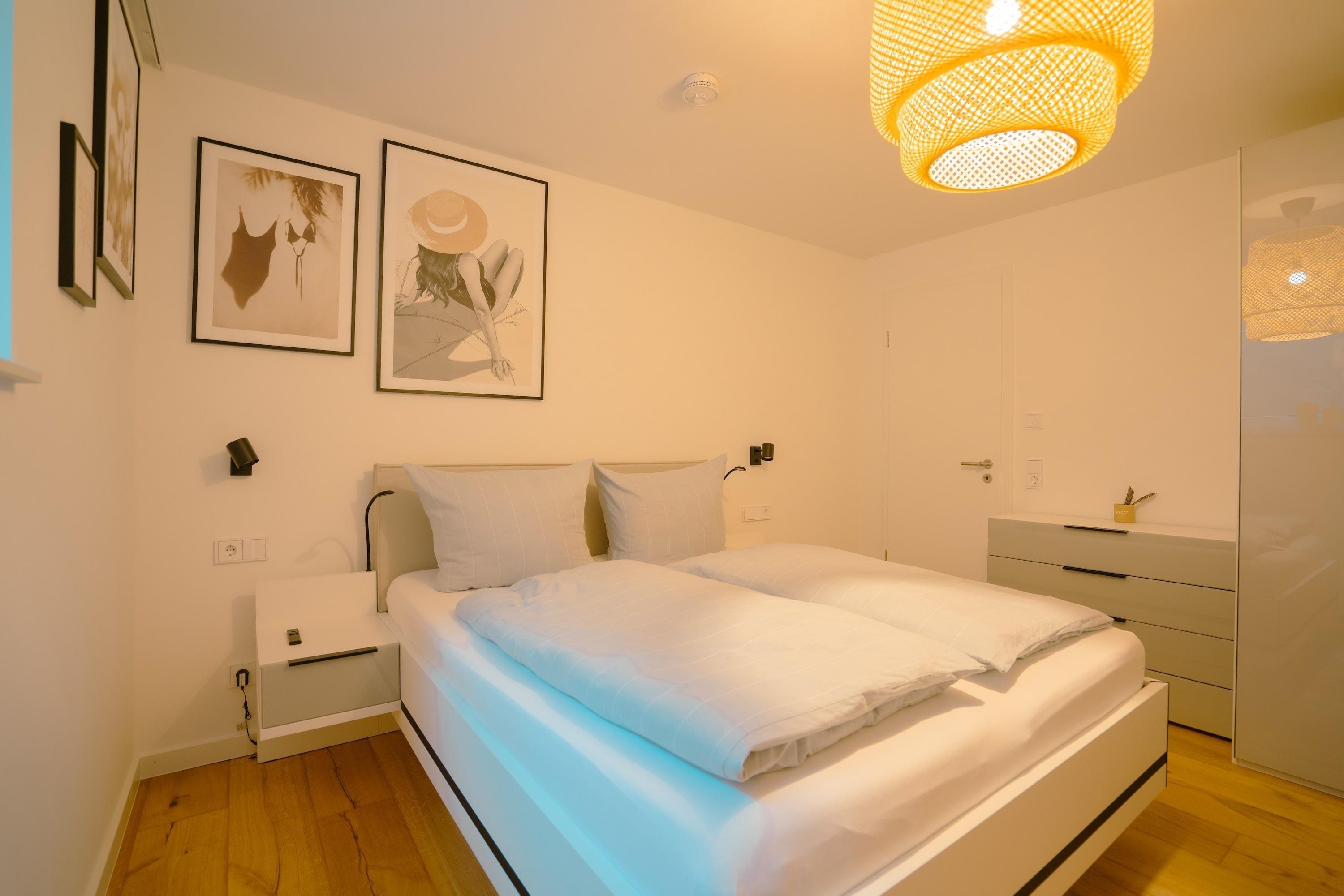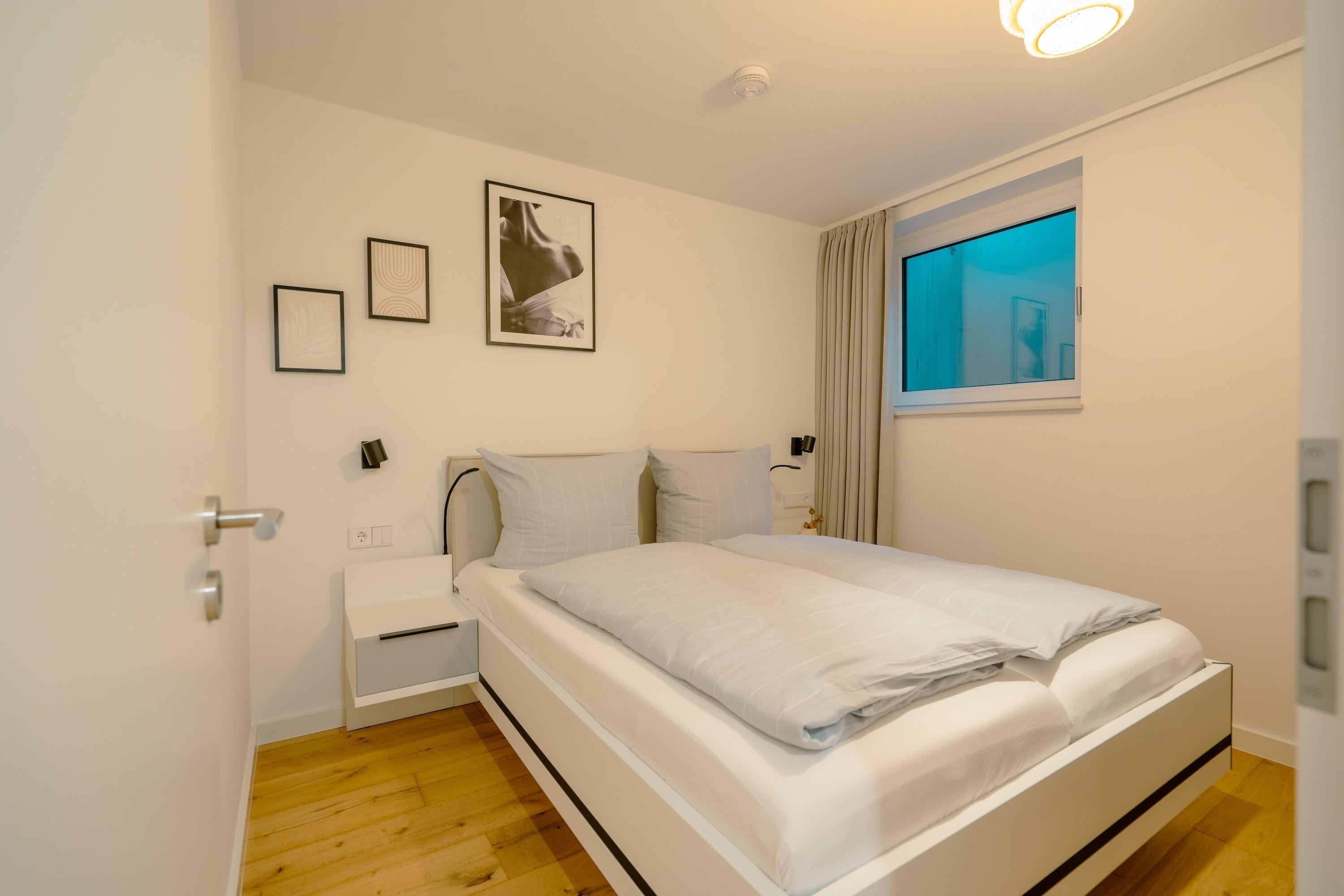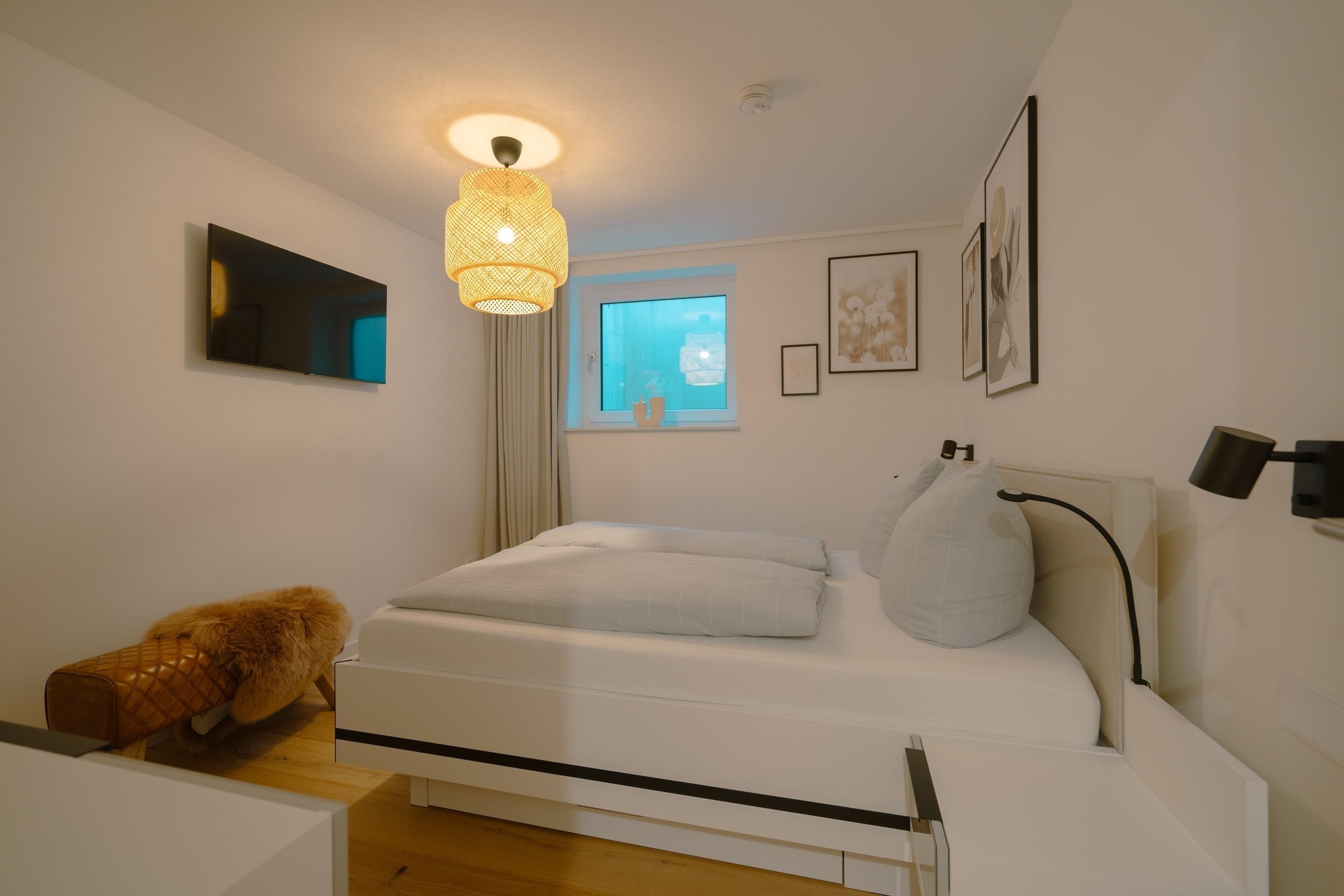 Im Untergeschoss der Ferienwohnung finden Sie zwei Schlafzimmer mit Doppelbetten (1,60m x 2,00m), Smart-TV und Fenstern zum großen Lichtschacht Ihrer Terrasse. Das Badezimmer mit Regendusche und die tolle Sauna mit Platz für bis zu 2 Personen finden sich hier ebenfalls.