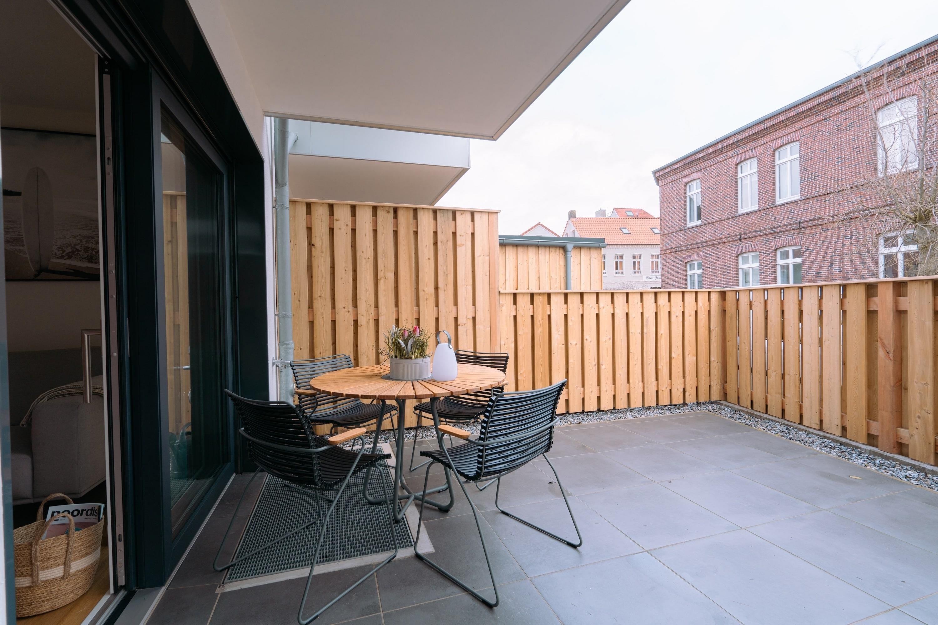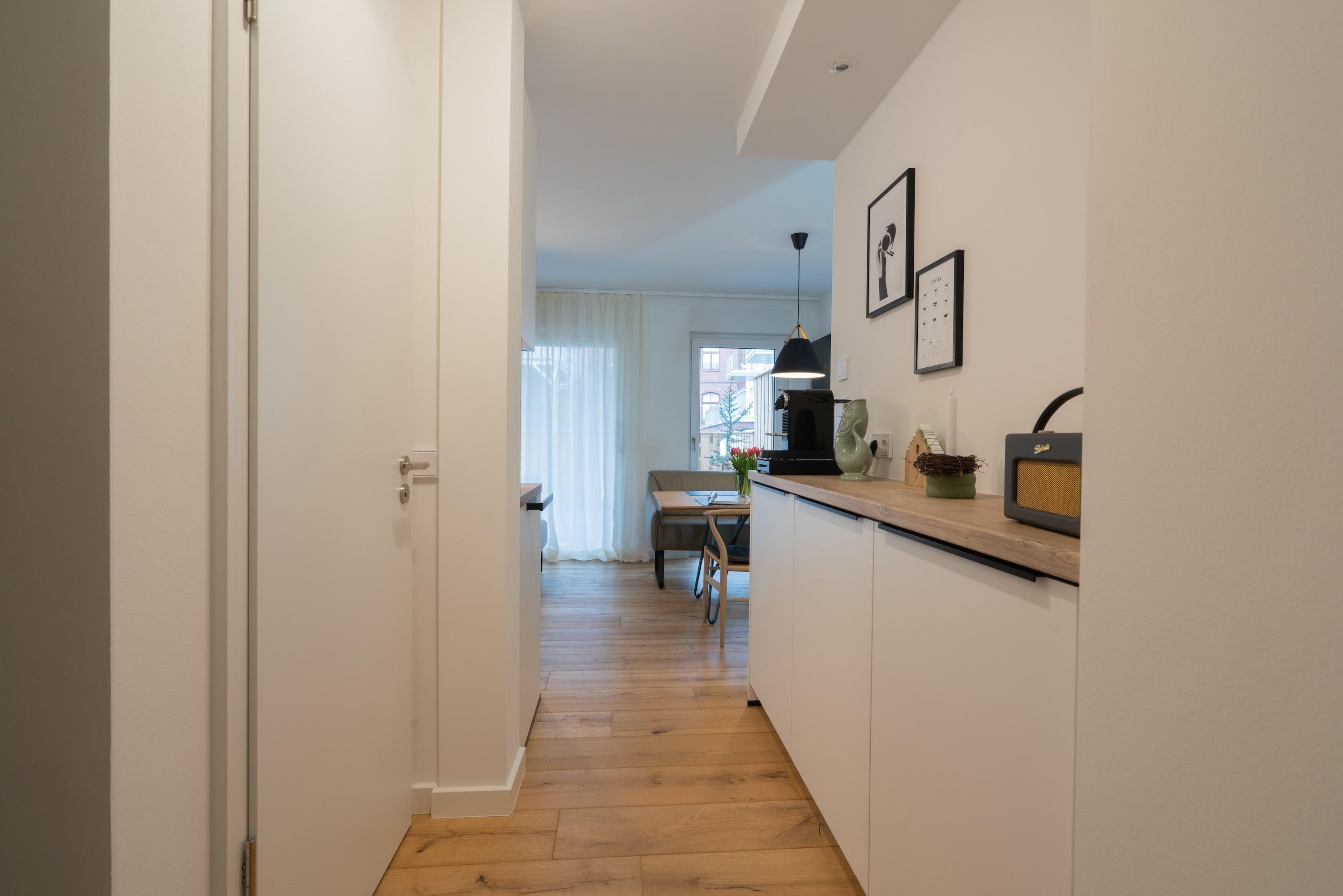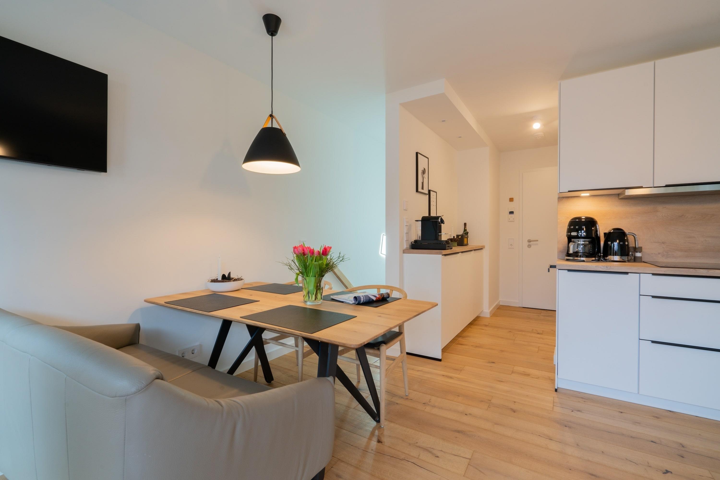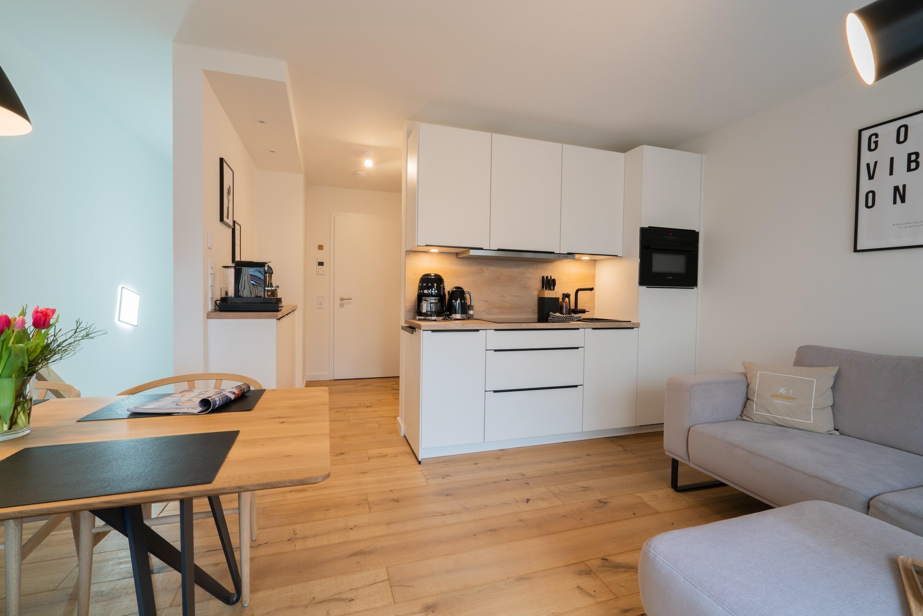 Vom Wohnzimmer im Erdgeschoss mit Essgelegenheit, offener Küche und gemütlichem Sofa haben Sie direkten Zugang zu Ihrer Terrasse mit modernen Gartenmöbeln. Die Wohnung verfügt über eine kleine, aber toll ausgestattete offene Küche mit Induktionskochfeld, Spülmaschine, Backofen-Mikrowellen Kombination und Nespresso-Kaffeemaschine.
