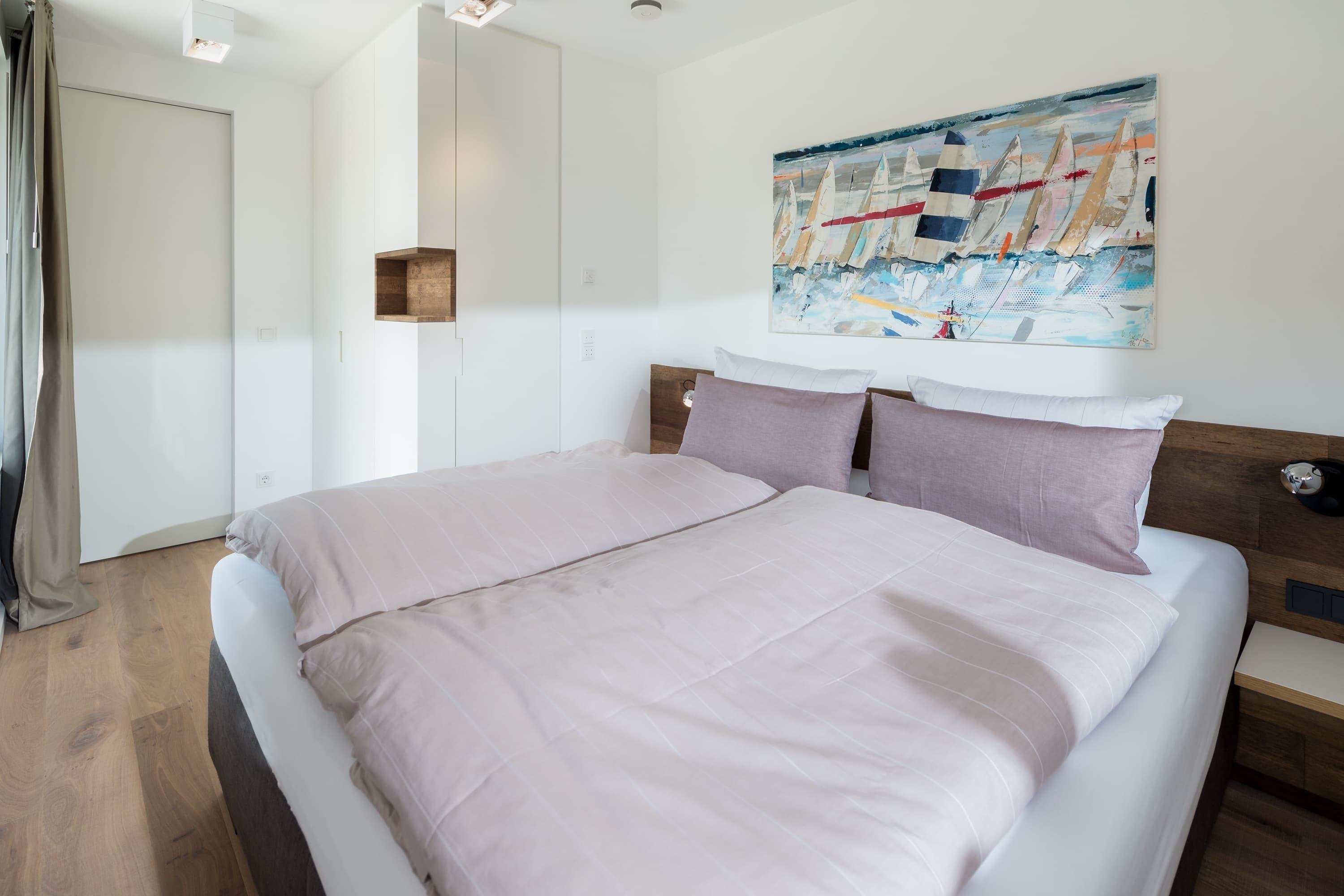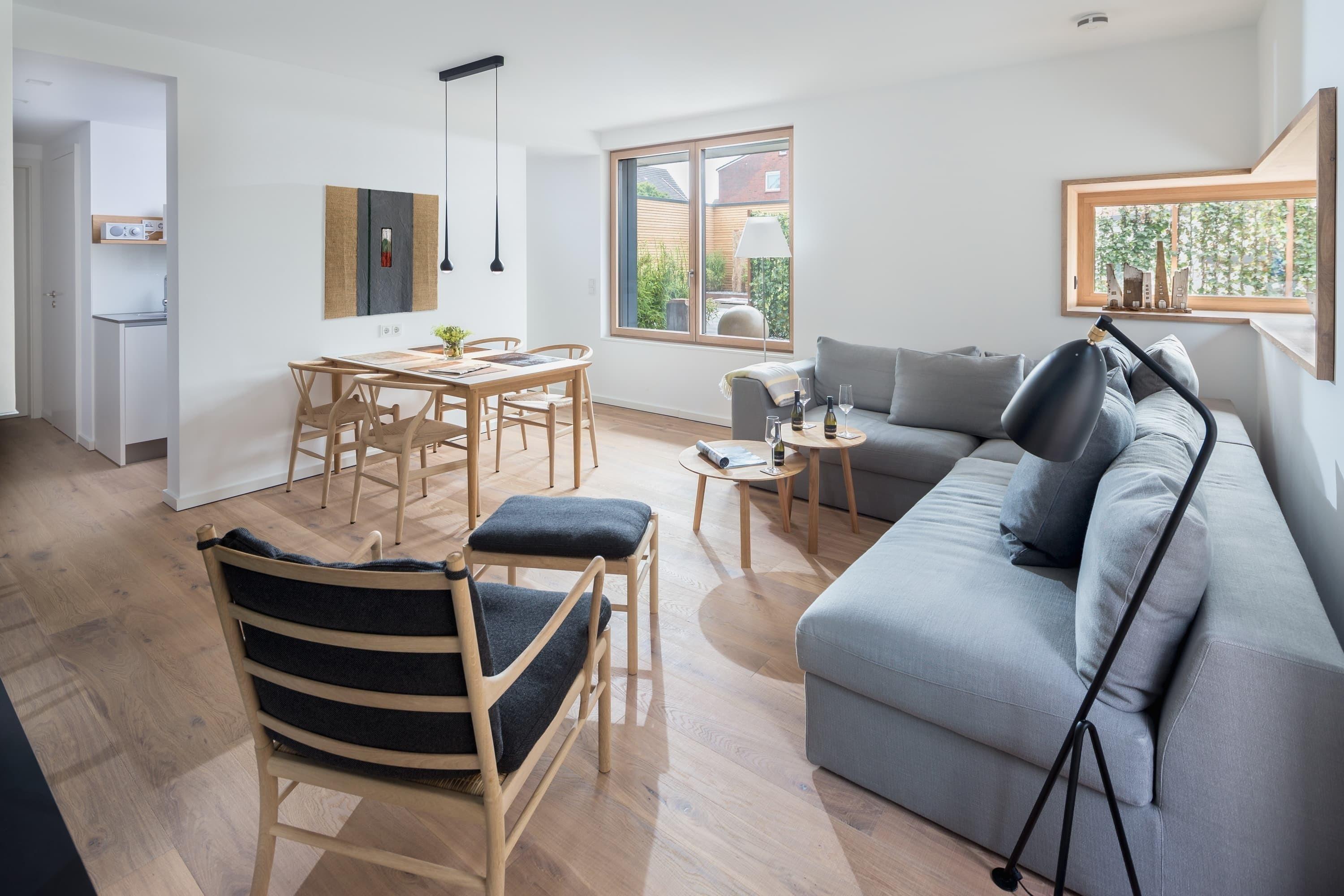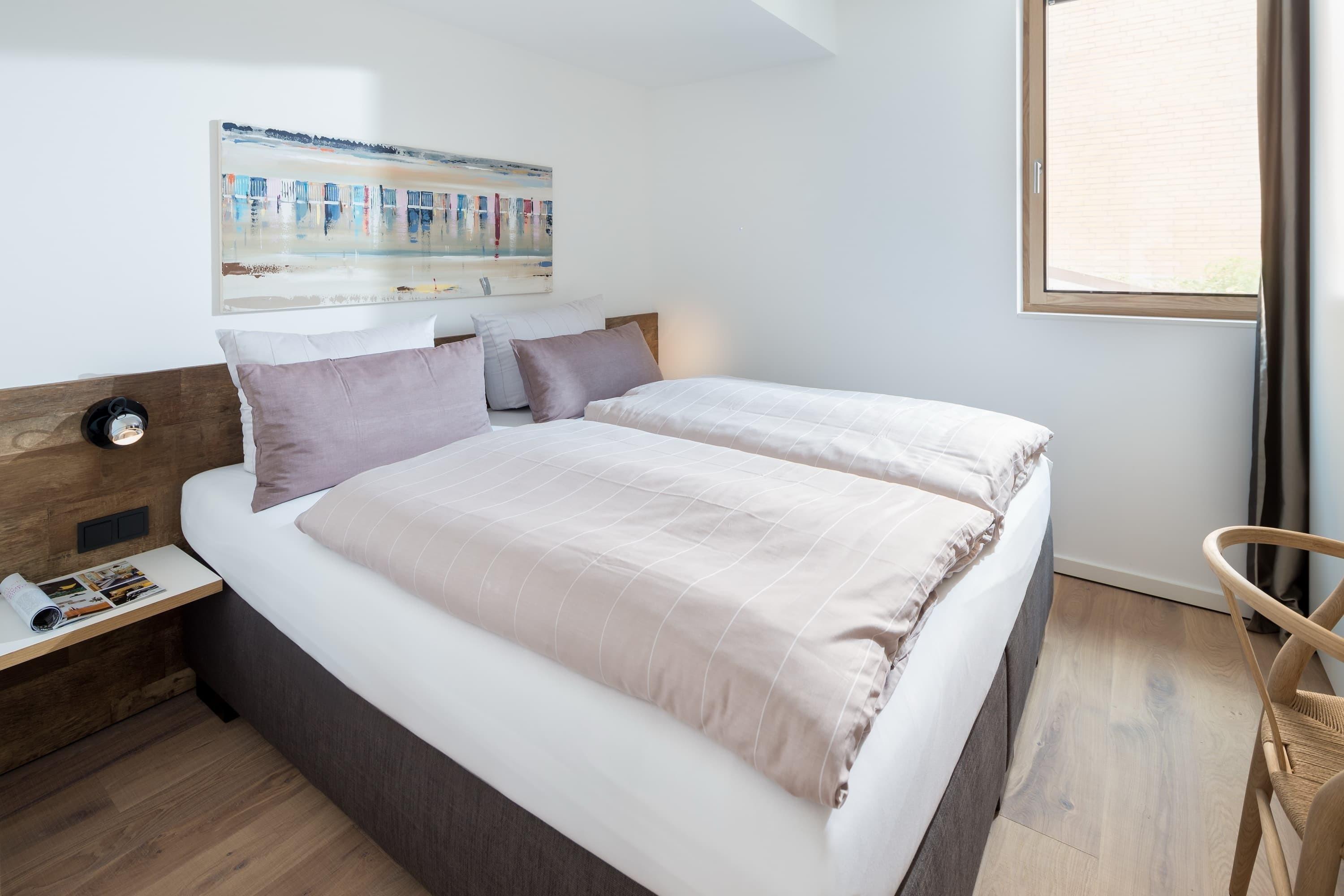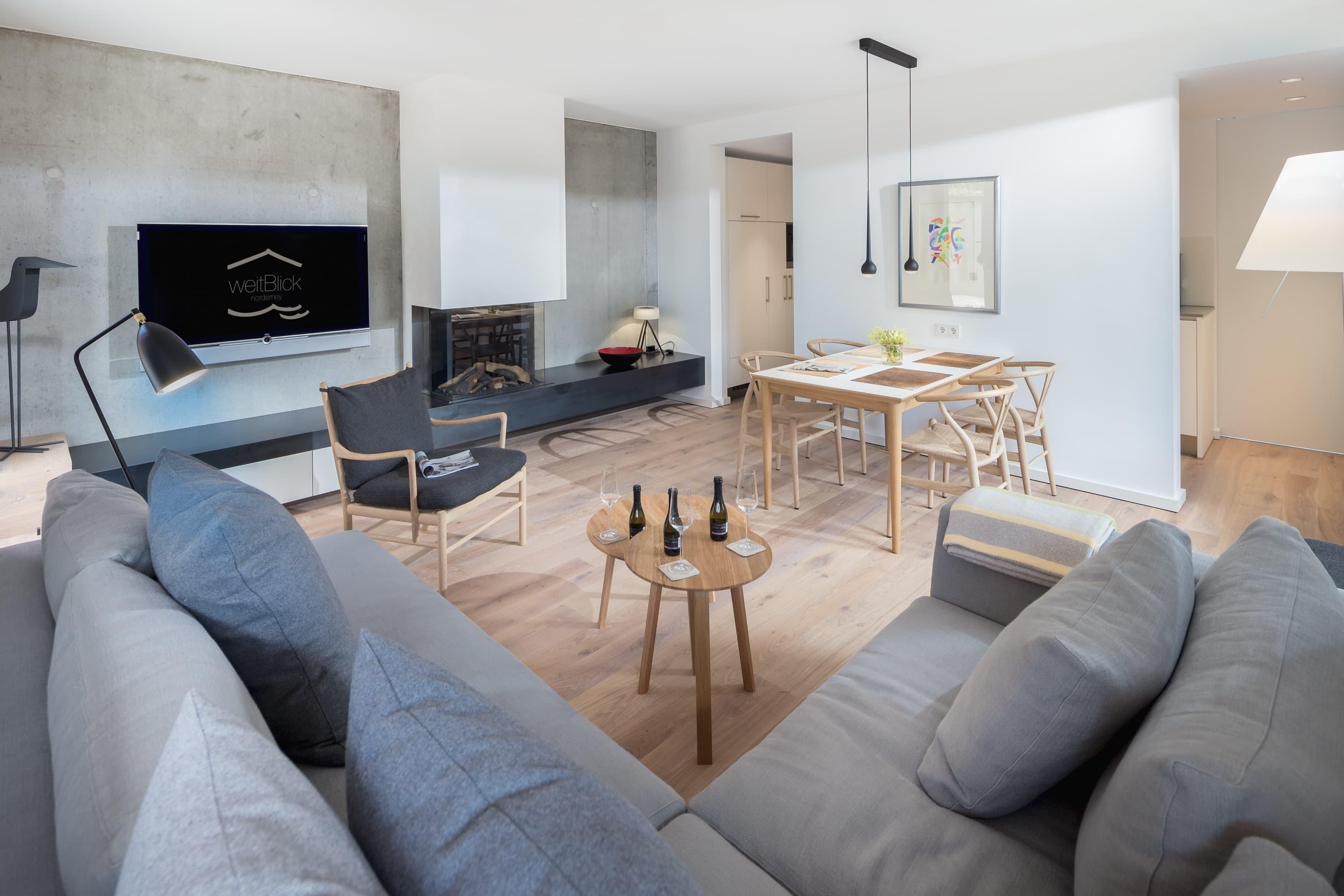 Die Ferienwohnung "sonnenBlick" ist eine exklusiv ausgestattete Terrassenwohnung mit 85qm für bis zu vier Personen. Ausgestattet mit einem großzügigen Wohn- und Essbereich mit offener Küche, Kamin und Südterrasse zum Garten, zwei Schlafzimmern für je zwei Personen (jeweils mit Fernseher), einem Bad mit Sauna und einem zusätzlichen, separaten WC. Haus Weitblick ist ein modernes Neubauprojekt mit insgesamt vier sehr hochwertig eingerichteten Ferienwohnungen, nur 50m vom Strand entfernt. Ihr Urlaub beginnt in erstklassiger Lage direkt am Strandaufgang des Nordstrandes. Die Wohnungen bieten eine exzellente Ausstattung: Gas-Kamin im Wohnbereich, Kabelfernsehen in Wohn- und Schlafzimmer, WLAN, Fussbodenheizung in allen Räumen, integriertes Radio mit Bluetooth-Anschluss im Badezimmer, Brötchenservice und Wäschewechsel. Die Küche ist mit hochwertigen Miele und KitchenAid-Geräten ausgestattet, die Schlafzimmer mit komfortablen Boxspringbetten. Hochwertiges Mobiliar und die gradlienige Einrichtung bieten ein außergewöhnliches und exklusives Inseldomizil. Beginnen Sie den Tag auf der Terrasse und beenden sie ihn auf dem hauseigenen Grillplatz. Im Souterrain steht ihnen eine Waschmaschine und ein Trockner zur Verfügung, die gegen Gebühr benutzt werden können. In der gesicherten Garage können Sie Kinderwagen und Fahrräder unterbringen.