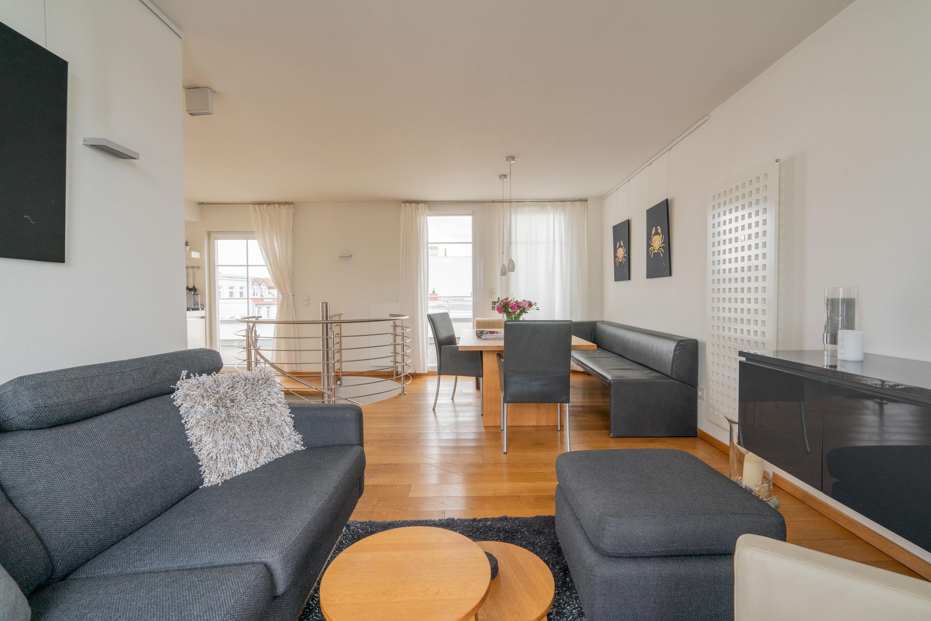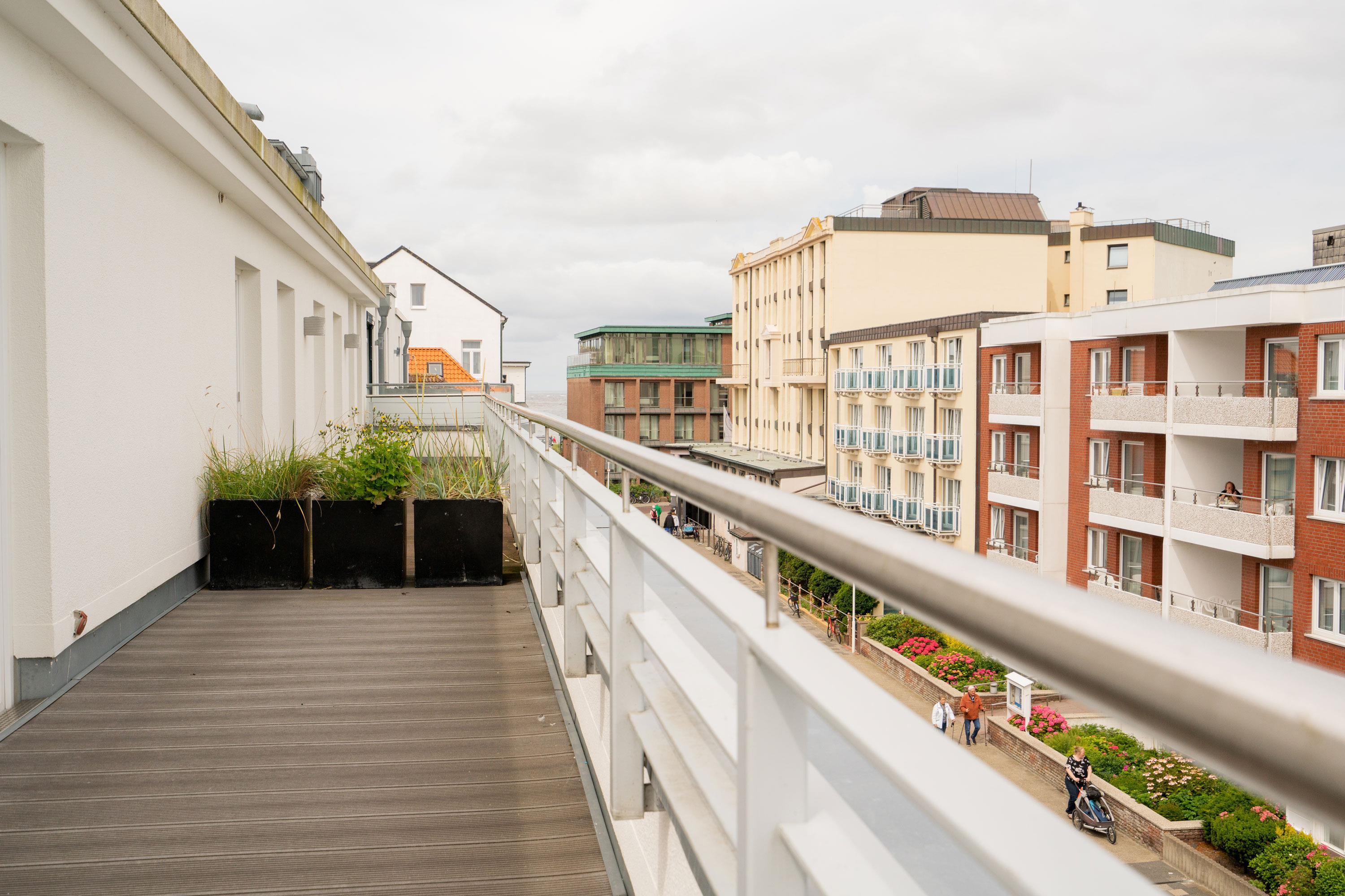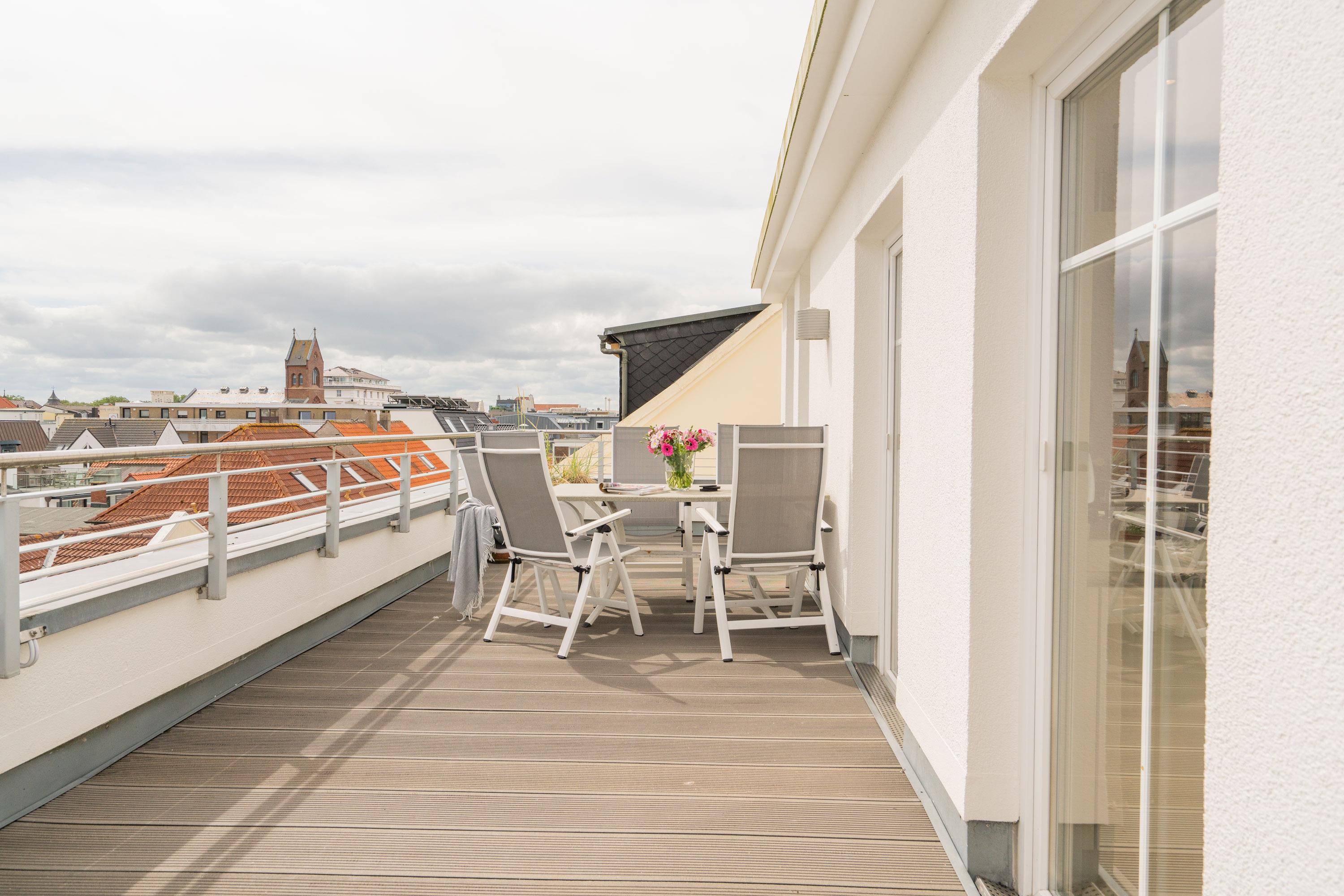 Ein Highlight ist die spektakuläre Dachterrasse. Mit einem Strandkorb und einem eingeschränkten Mini-Meerblick ist sie der perfekte Ort, um den Tag entspannt ausklingen zu lassen. Genießen Sie hier Ihr Frühstück oder ein Glas Wein am Abend, während Sie die frische Meeresbrise spüren.
