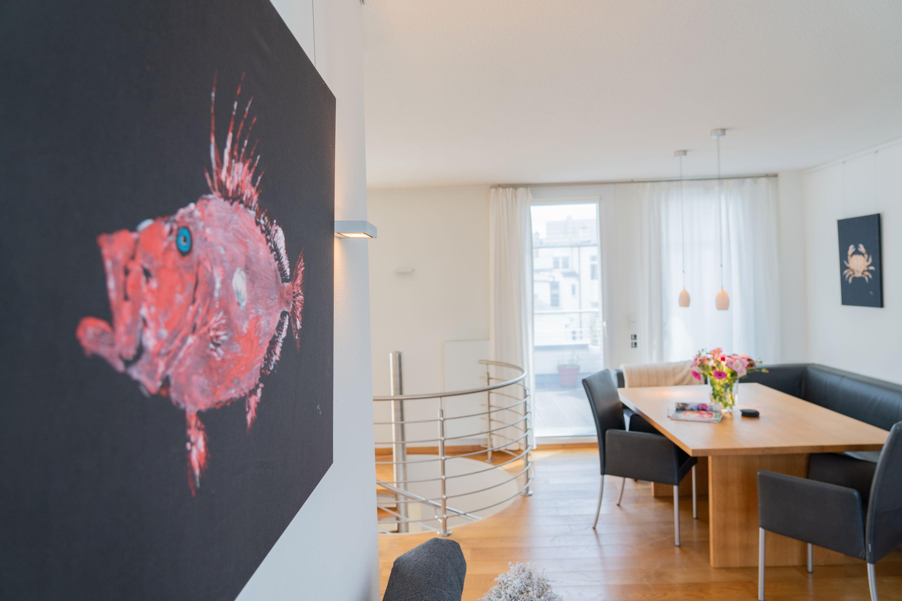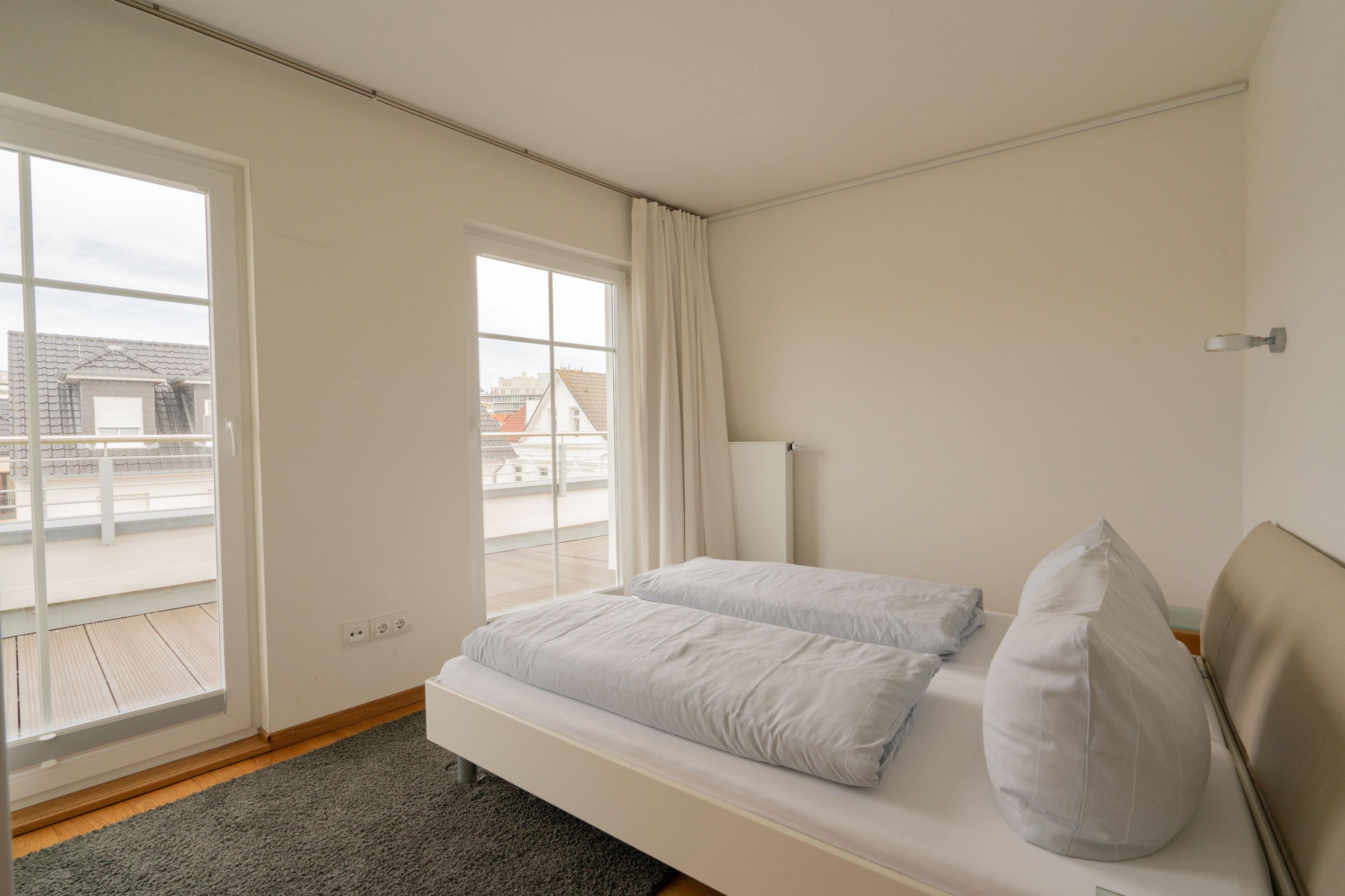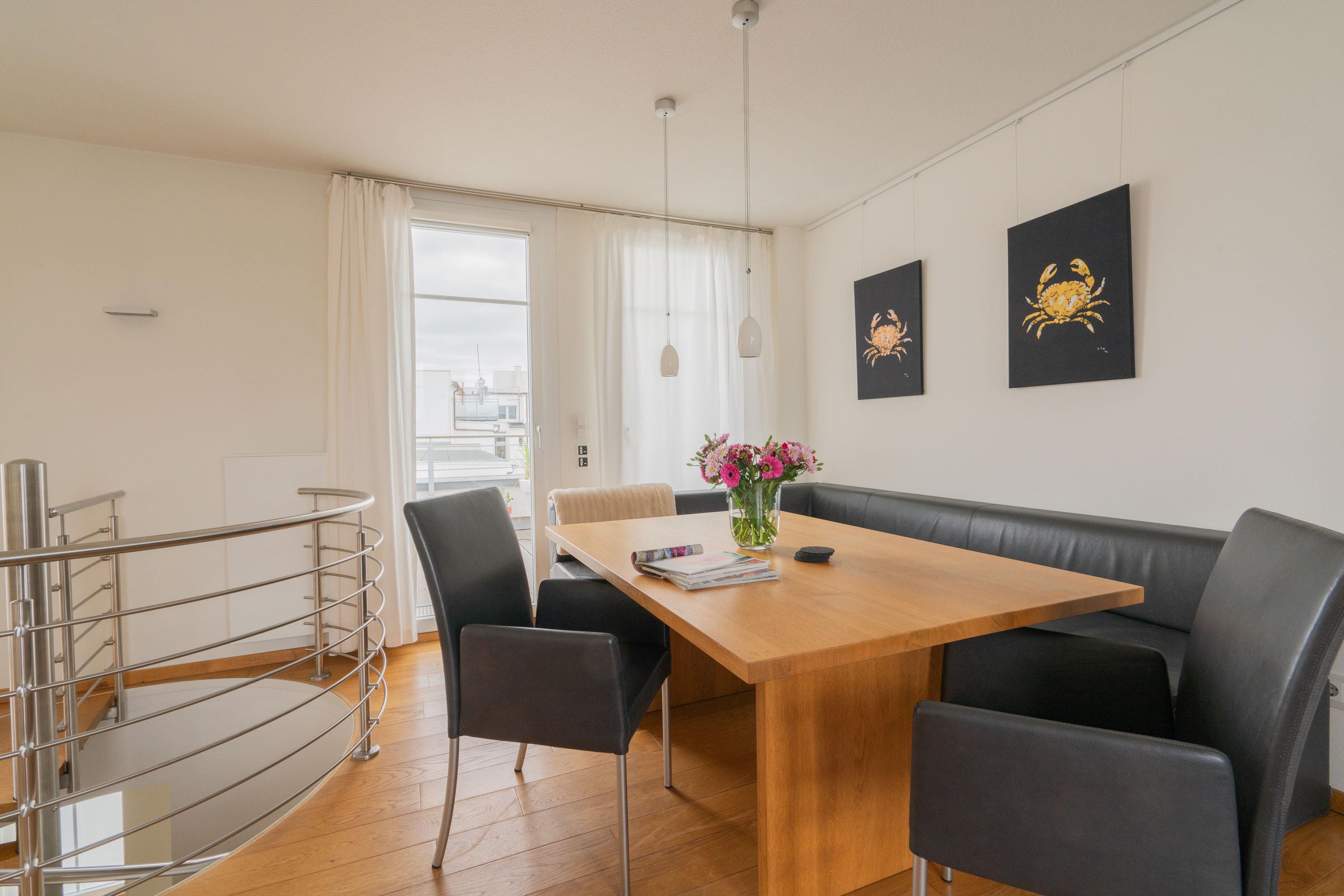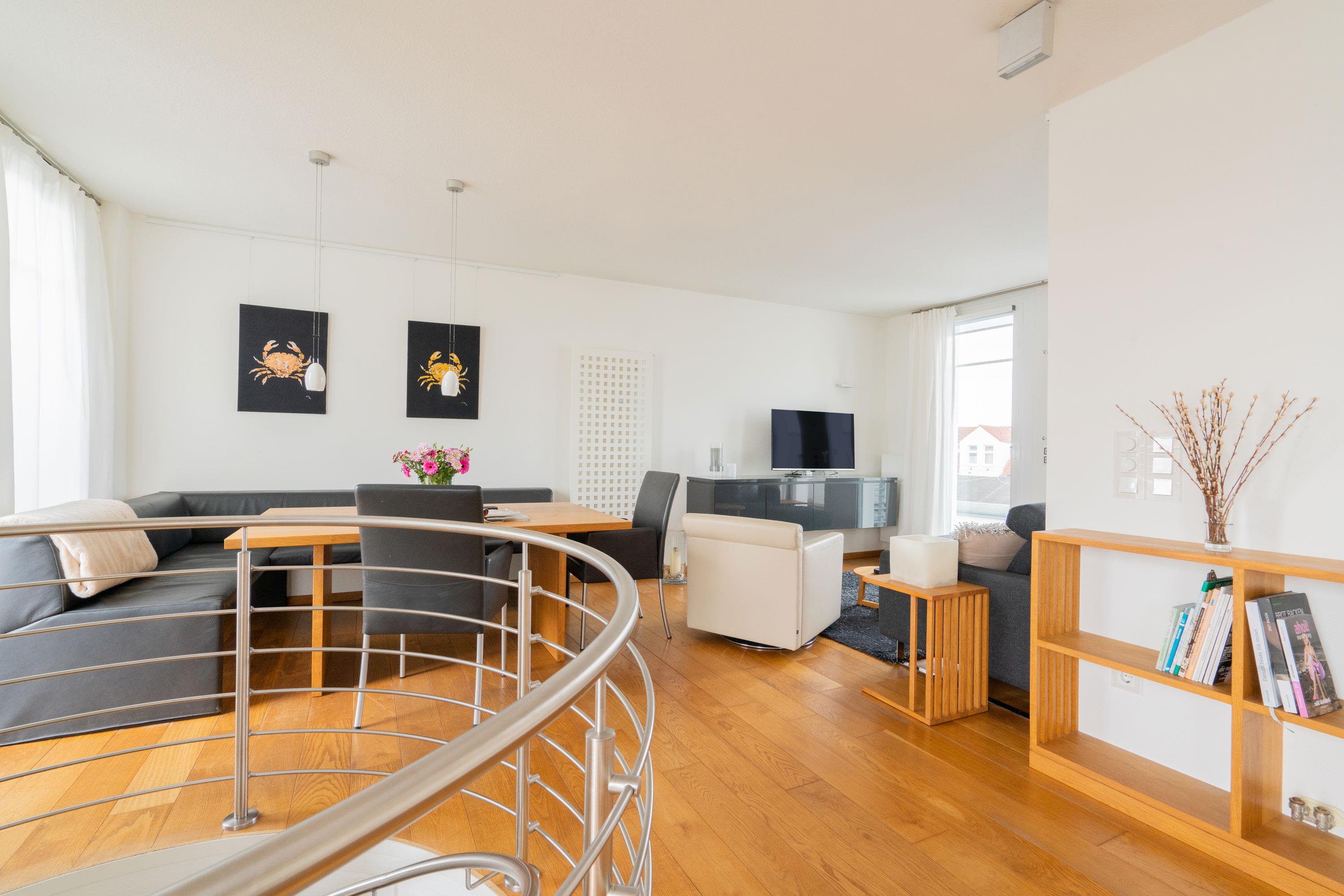 Ein Highlight ist die spektakuläre Dachterrasse. Mit einem Strandkorb und einem eingeschränkten Mini-Meerblick ist sie der perfekte Ort, um den Tag entspannt ausklingen zu lassen. Genießen Sie hier Ihr Frühstück oder ein Glas Wein am Abend, während Sie die frische Meeresbrise spüren.