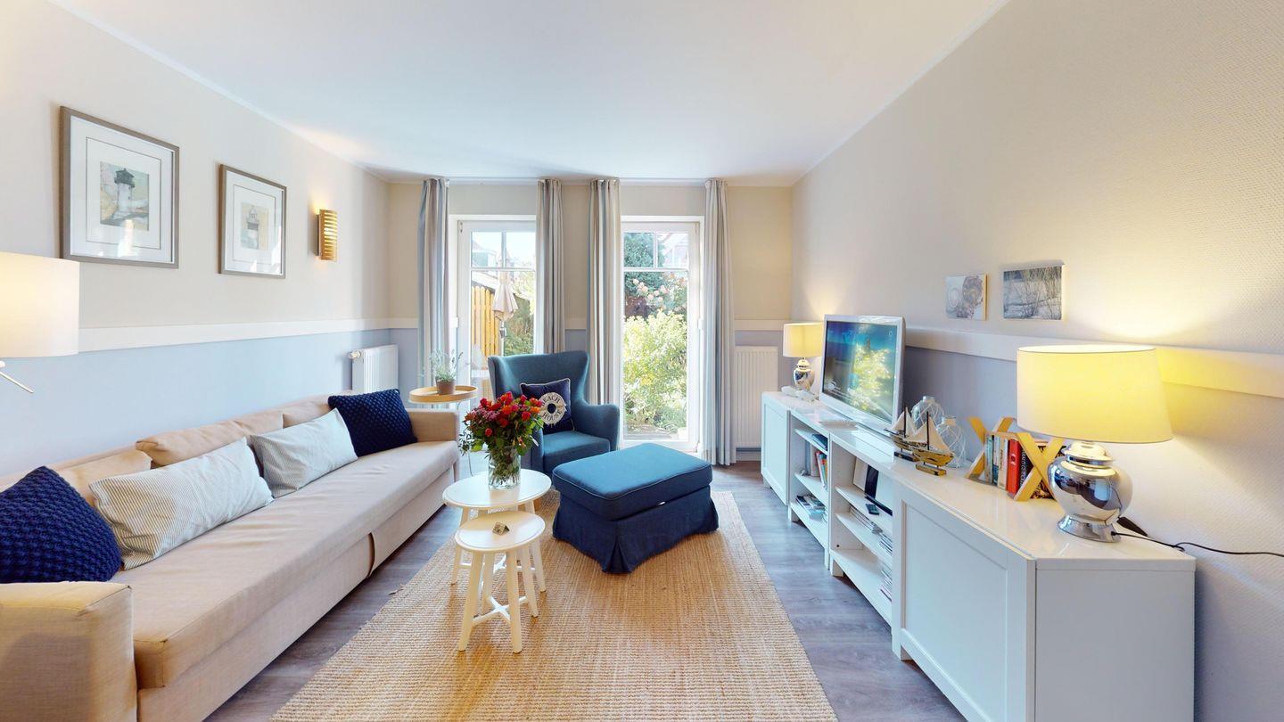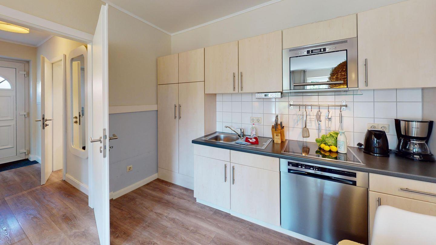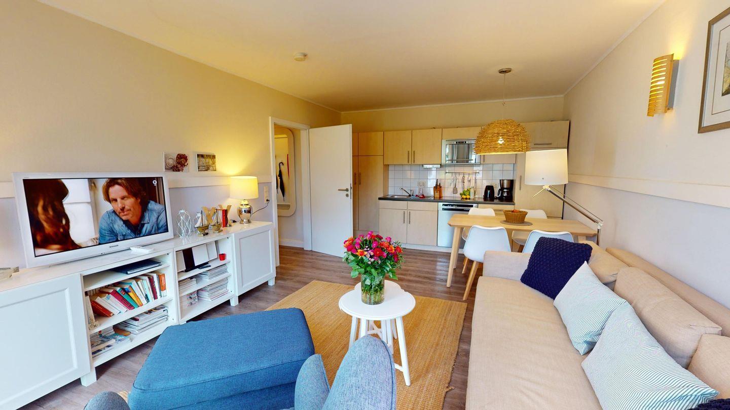 Die Wohnung ist geschmackvoll im nordischen Stil eingerichtet. Es gibt ein Schlafzimmer mit einem Doppelbett und ein Wohnzimmer mit offener Küche, Esstisch und kleiner Terrasse zum Garten. Ein Fernseher im Schlafzimmer und einer im Wohnzimmer sowie leistungsstarkes W-Lan sorgen für Unterhaltung und schnellen Internetzugang. Kinder sind herzlich willkommen und können auf Wunsch ein Kinderbett und einen Hochstuhl bekommen. Am Haus sind auch Fahrradabstellplätze vorhanden. Hunde sind in dieser Ferienwohnung nicht erlaubt.