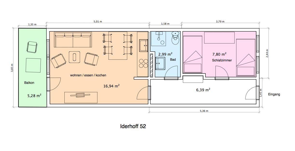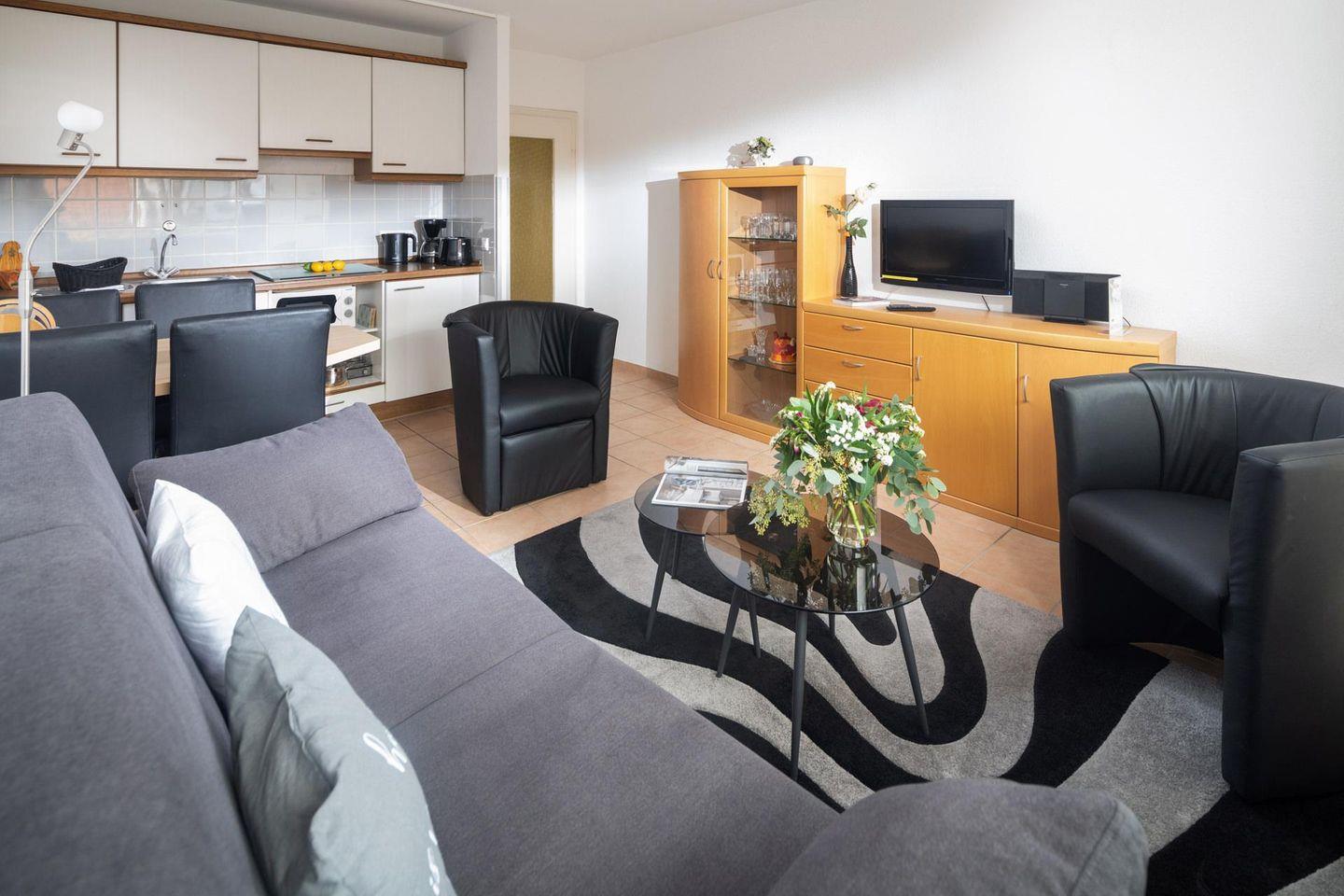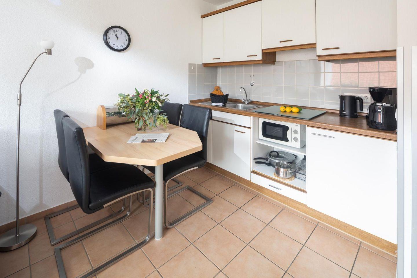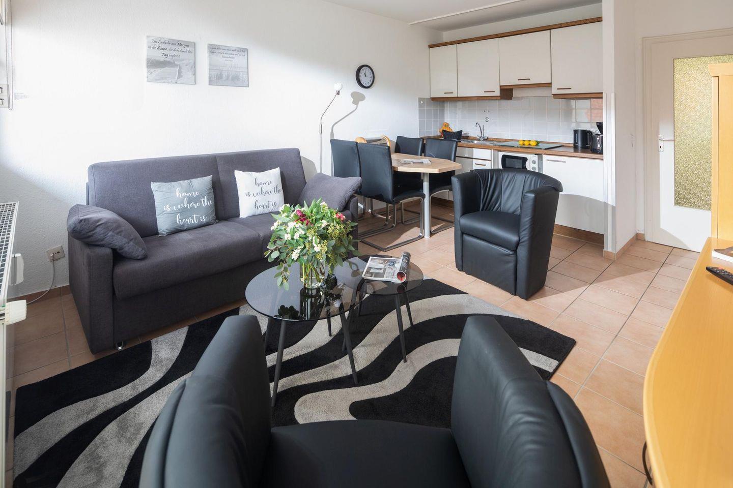 Mit insgesamt 3 Schlafmöglichkeiten ist die Wohnung für kleine Familien oder Gruppen von Freunden geeignet. Das Schlafzimmer ist mit 2 einzelstehenden Betten ausgestattet, während im Wohnzimmer eine Schlafcouch vorhanden ist. Die Küchenzeile befindet sich im Wohnzimmer und beinhaltet alle notwendigen Utensilien, ist jedoch ohne Backofen ausgestattet worden. Die Ferienwohnung selbst verfügt über einen Balkon. Ein Highlight des Hauses "Iderhoff" ist der beheizte Swimming-Pool, der den Gästen zur Verfügung steht. Es wird jedoch darauf hingewiesen, dass die Nutzung des Schwimmbades den bekannten Hygienevorschriften unterliegt, und es können kurzfristige Änderungen auftreten. Eine Waschmaschine und ein Wäschetrockner stehen den Gästen im Haus zur gemeinschaftlichen Nutzung gegen Münzeinwurf zur Verfügung. Die Wohnung hat kein WLAN. Haustiere sind hier erlaubt. Maximal 1 Hund (maximal kniehoch). Die Hundewiese befindet sich in der Nähe des Fährhafens (kein Leinenzwang).