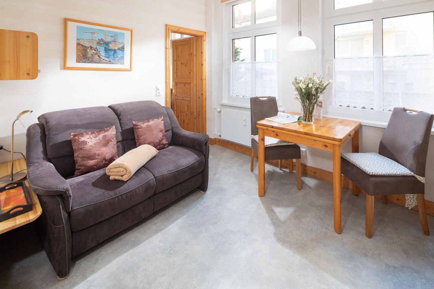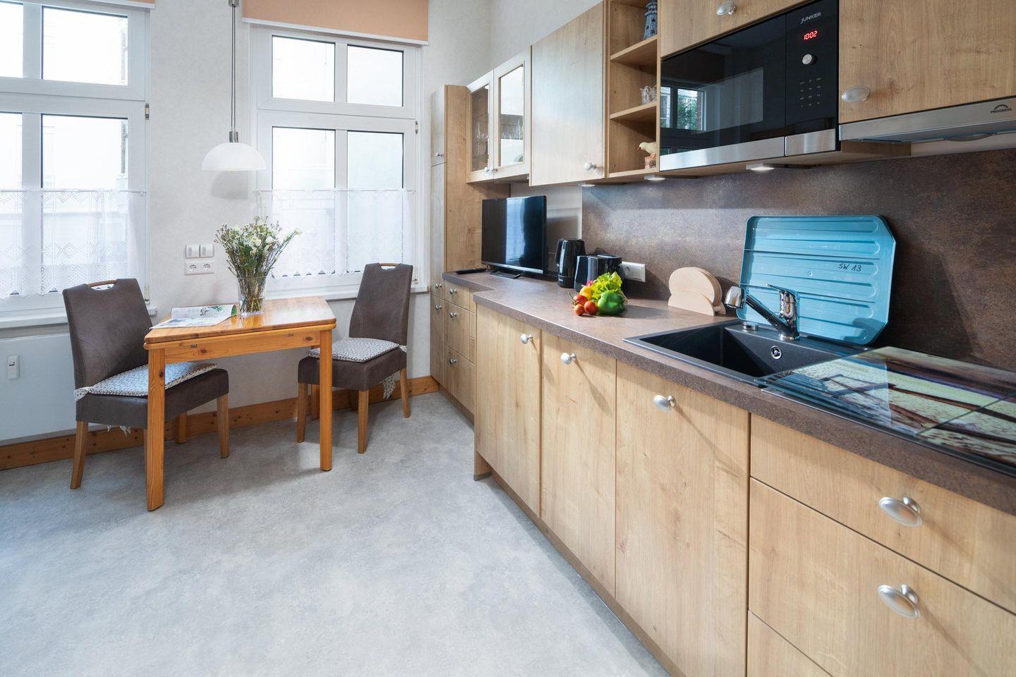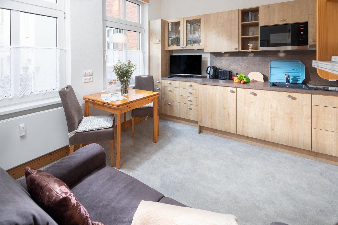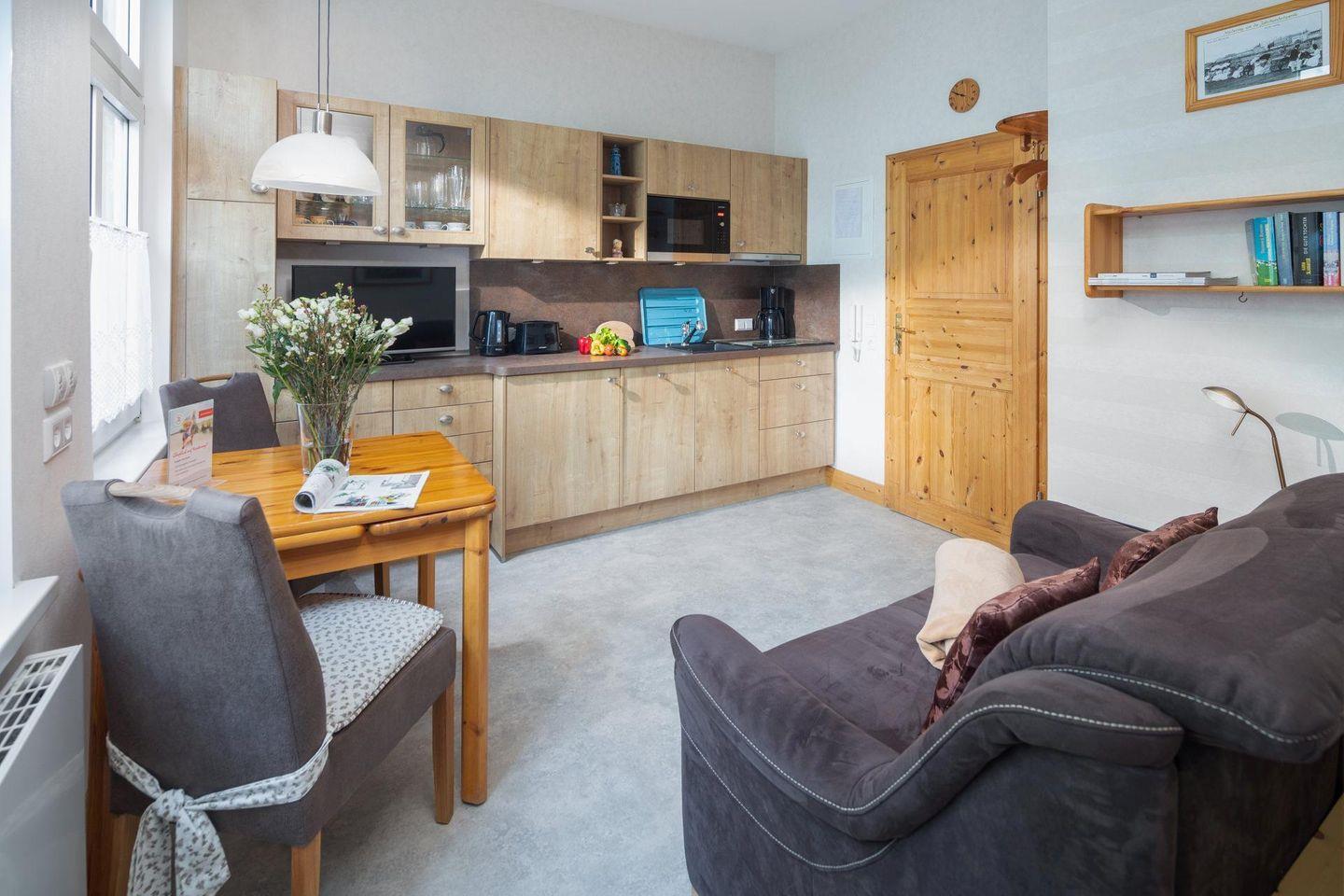 Die allergikerfreundliche Wohnung wurde kürzlich frisch renoviert und ist nahezu barrierefrei - abgesehen von einer Stufe vom Bürgersteig zur Haustür. Sie ist für zwei Personen ausgelegt und Kinder ab 7 Jahren sind herzlich willkommen. Der Wohn-Küchenbereich bietet eine kleine Essecke und das Schlafzimmer ist mit einem Doppelbett eingerichtet. Das Badezimmer ist mit einer Dusche und einem WC ausgestattet. Waschmaschine und Wäschetrockner befinden sich im Haus und stehen (für die gemeinschaftliche Nutzung ggfs. gegen Gebühr) zur Verfügung, was besonders für längere Aufenthalte von Vorteil ist. Haustiere (Hunde) sind in dieser Ferienwohnung nicht erlaubt.
