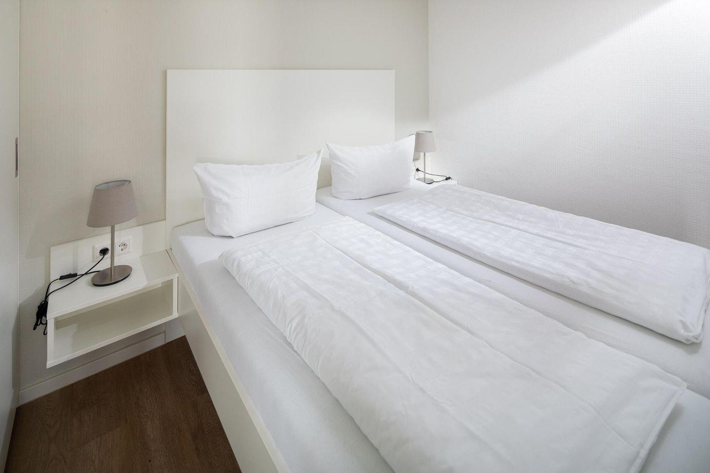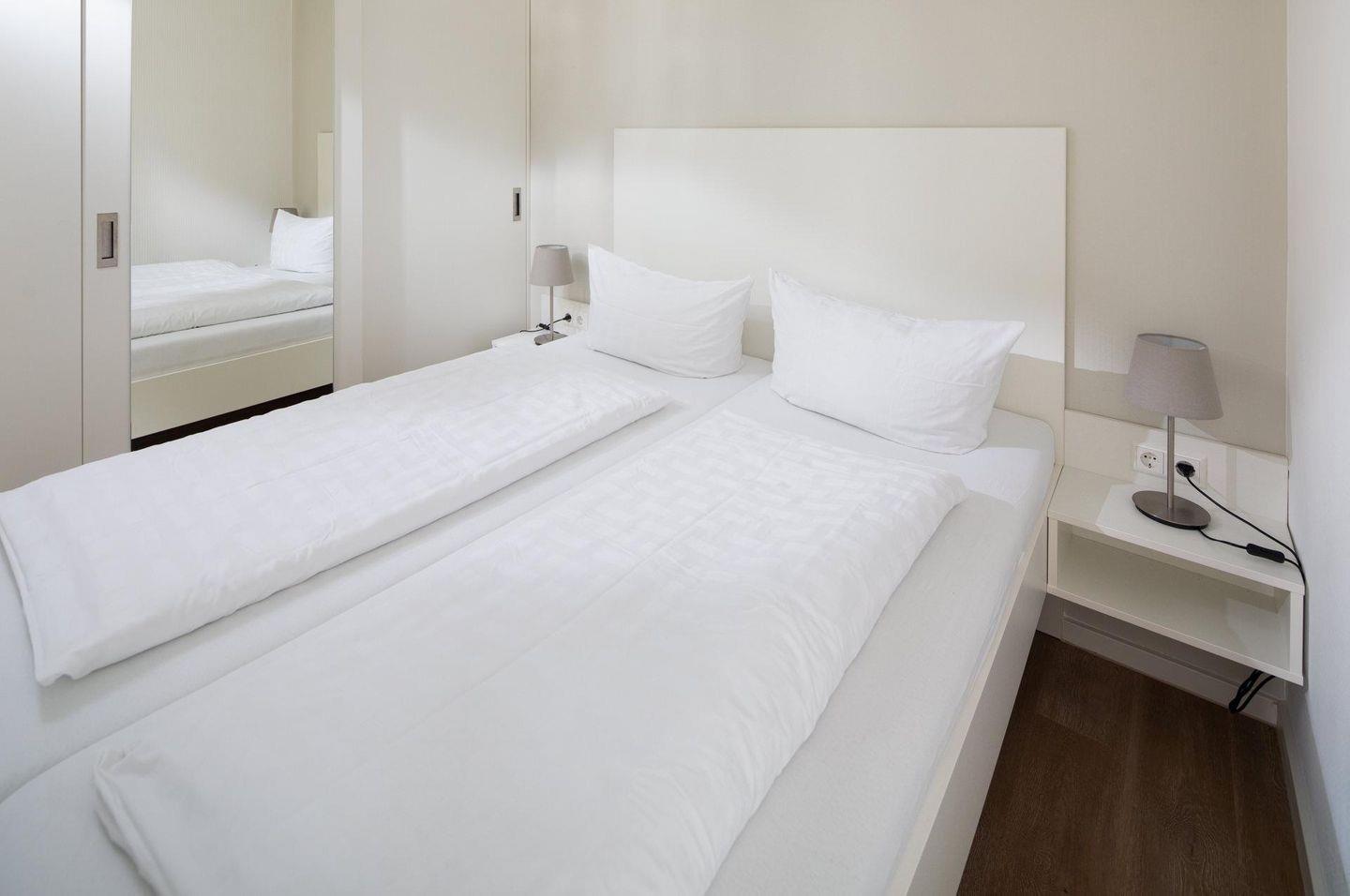 Bei der Ausstattung der Wohnung wurde auf eine helle Einrichtung Wert gelegt. Das Schlafzimmer verfügt über ein Doppelbett (1,60m x 2,00m, aufgeteilt in 2 separate Matratzen) und das Badezimmer wurde mit einer Dusche ausgestattet. Auch ein Haartrockner ist dort vorhanden. Es handelt sich um eine offene Küche, die direkt in das Wohnzimmer übergeht und mit einer Spülmaschine ausgestattet ist. Weiter verfügt die Wohnung über einen kleinen Balkon. Auch Vierbeiner sind in dieser Wohnung herzlich willkommen. Es ist maximal 1 Hund (Höhe maximal kniehoch) erlaubt. Die gemeinschaftlich nutzbare Waschmaschine und der Wäschetrockner erfordern den Einwurf von Münzen.